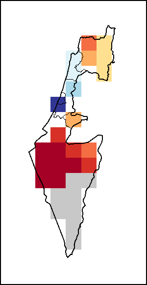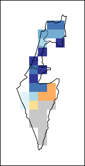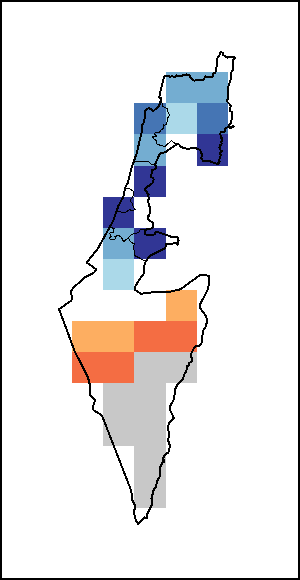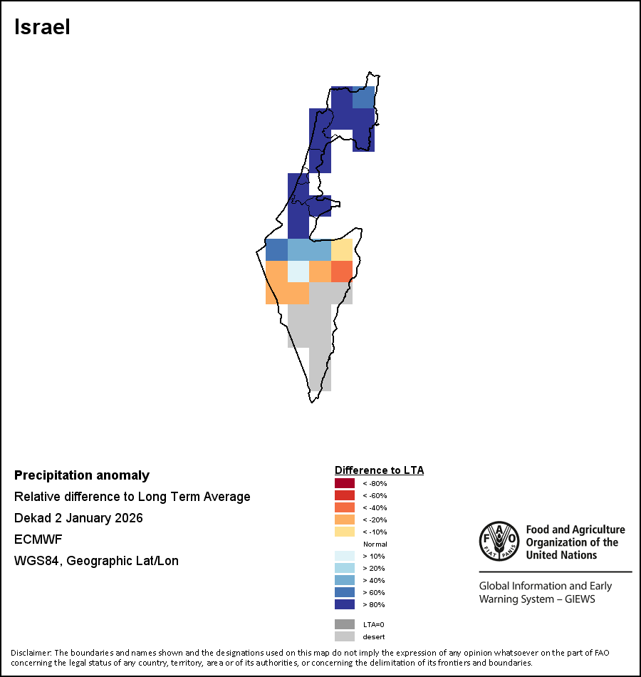 该图谱显示了当前降水量与平均水平之间的差异。 由降水量水平与长期平均值(LTA)进行比较得出,长期平均值系指1989-2015年期间的数值。暖色调指示的是降水量低于平均水平的地区,而冷色调指示的则是降水量高于平均水平的地区。降雨量估算数据来自欧洲中期天气预报这些(ECMWF)。