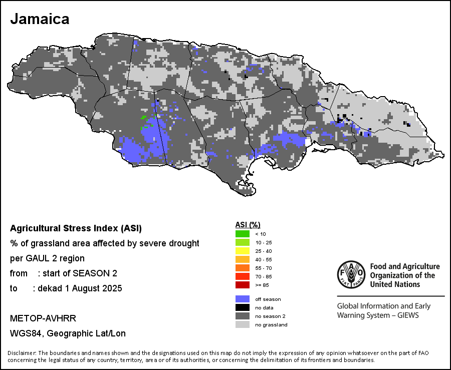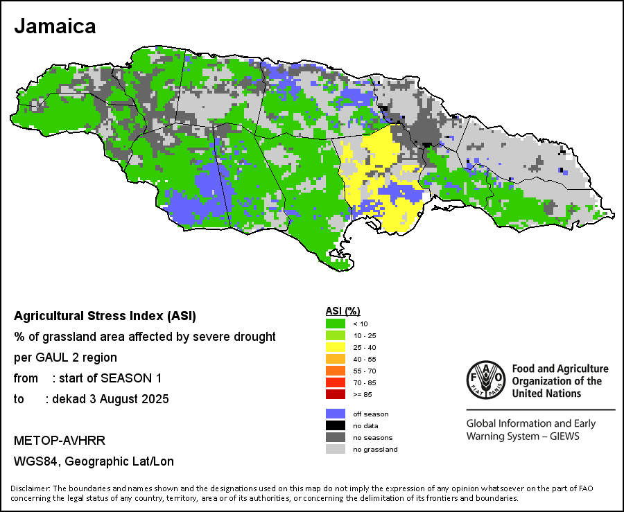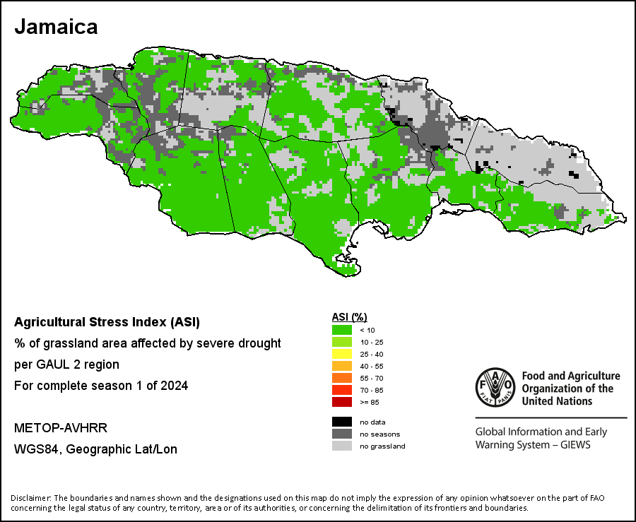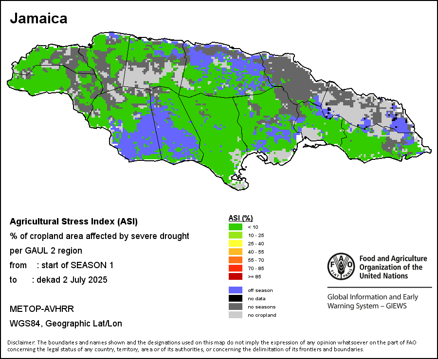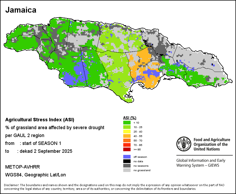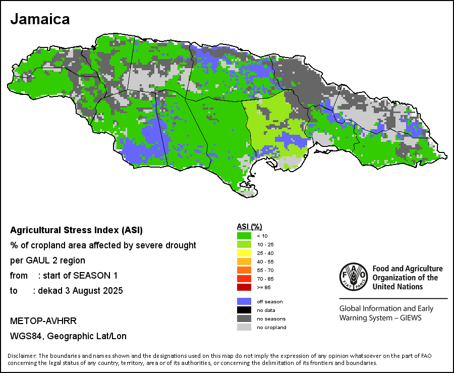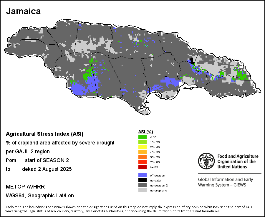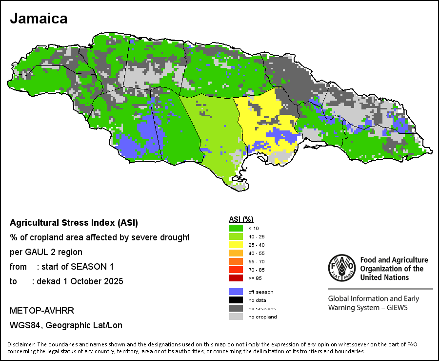 农业干旱胁迫指数(ASI)是一项速览指数,有助于在早期甄别较大可能发生水胁迫(干旱)的耕地。 该指数通过整合植被健康指数(VHI)在评估农业旱情方面具有关键意义的两个维度,即时间和空间维度,而得出。计算农业干旱胁迫指数的第一步是求植被健康指数的时间平均值,对作物周期内旱情的强度和时长进行像素级评估;这项计算包括采用作物系数衡量某种作物在各物候阶段对干旱胁迫的敏感度。第二步是确定旱情的空间广度,方法是计算植被健康指数值低于35%(Kogan前期研究将这一数值确定为评估干旱程度的临界值,1995年)的耕地的像素百分比。然后把各个行政区域根据受影响面积的百分比进行划分,便于对结果进行快速解读。