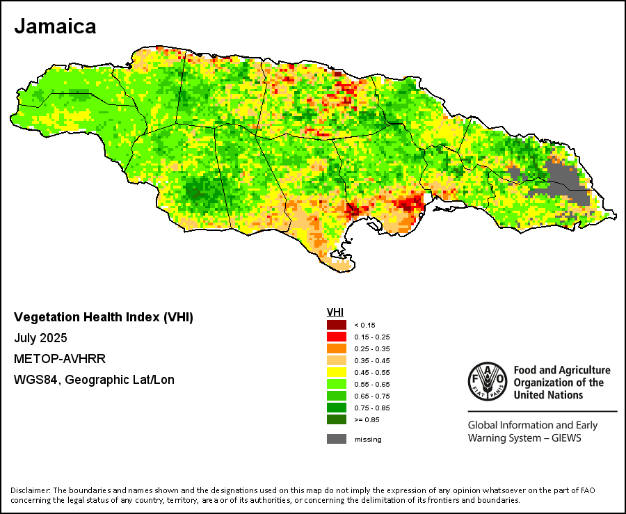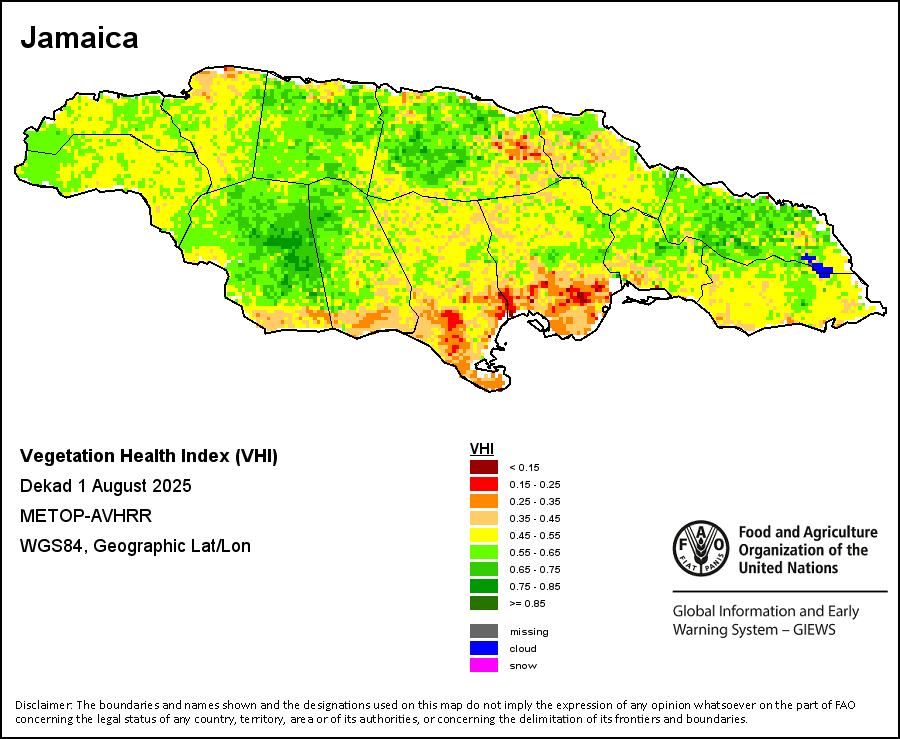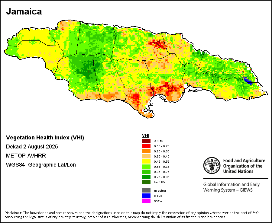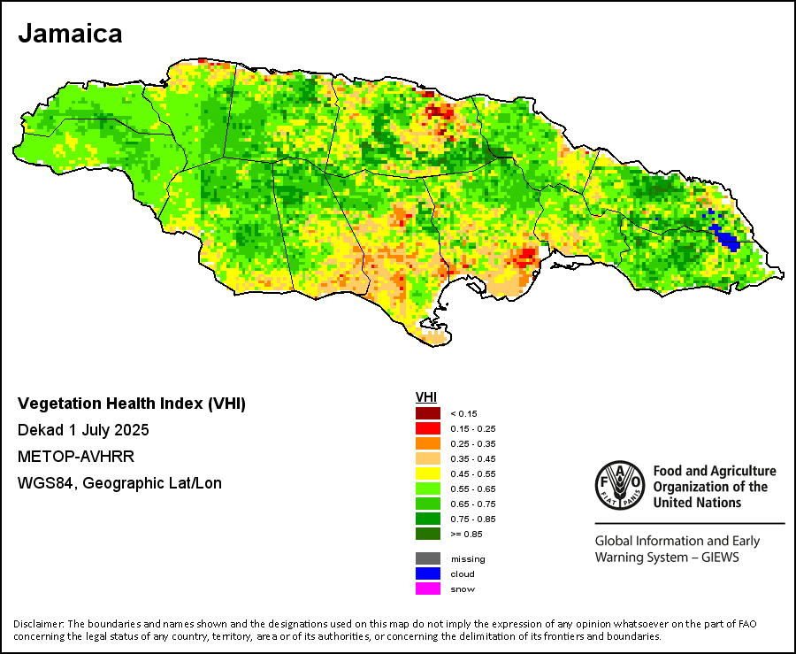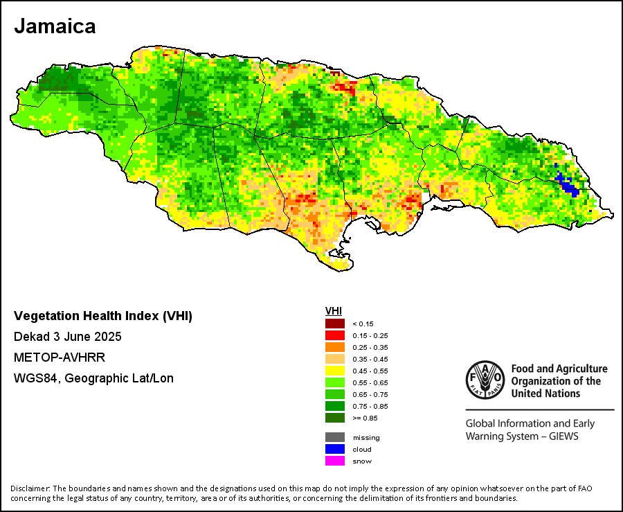 植被健康指数(VHI)根据植被健康状况以及气温对作物状况的影响情况显示干旱的严重程度。 VHI是一项综合指数,是用于计算ASI的基础性指标。它结合了植被状况指数(VCI)和气温状况指数(TCI)。TCI的计算采用了与VCI类似的方程,但它把当前气温与长期最高和最低值联系起来,因为一个假定前提是气温越高就倾向于造成植被状况恶化。比方说,VHI指数下降就意味着植被状况相对较差,而气温越高则意味着植被状况受到胁迫,较长时间延续则成为干旱的指征。VHI映像针对两个主要季节进行计算并分为三种时间模式:旬度、月度和年度。