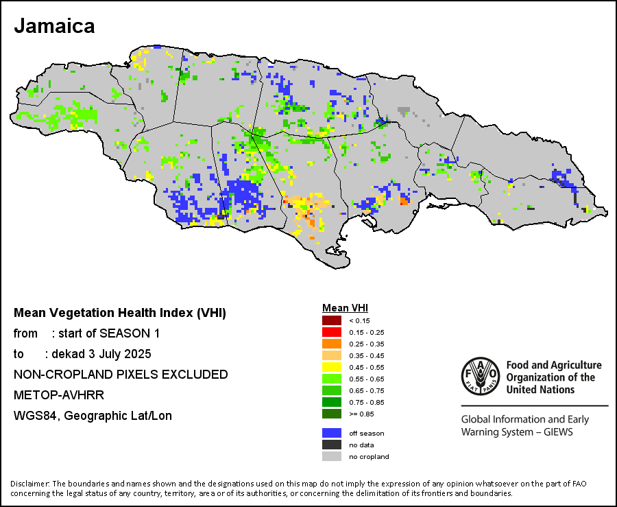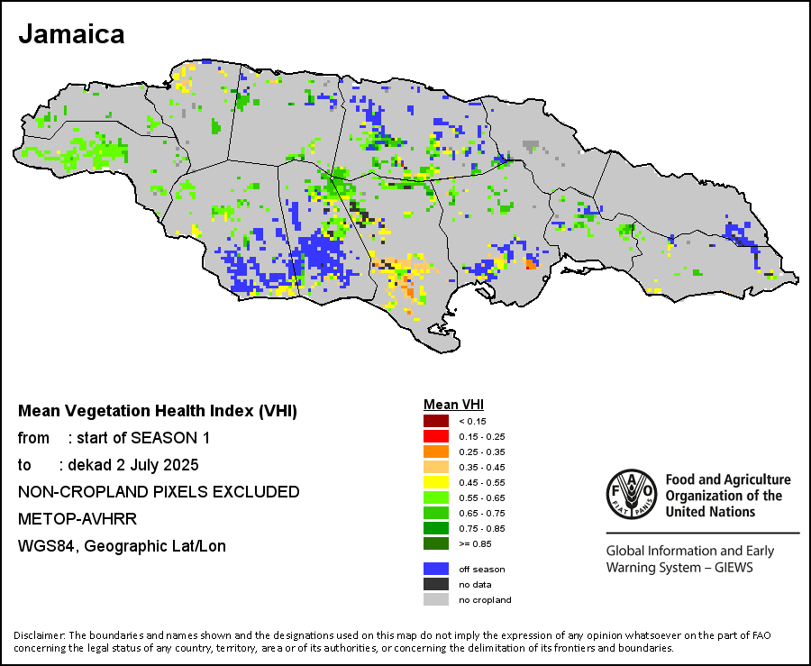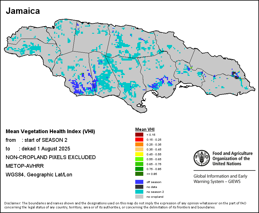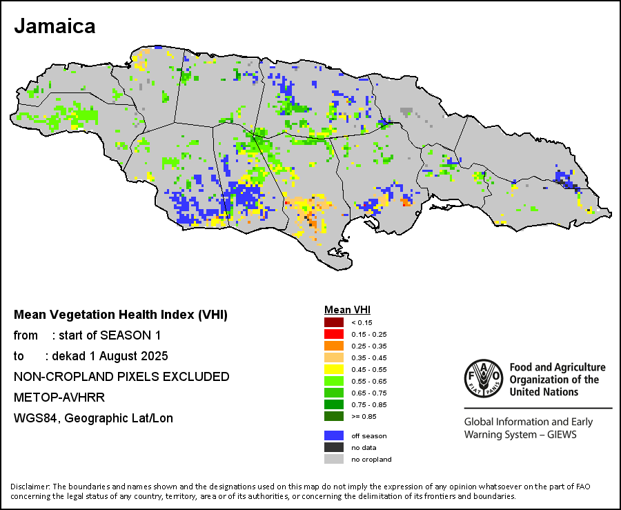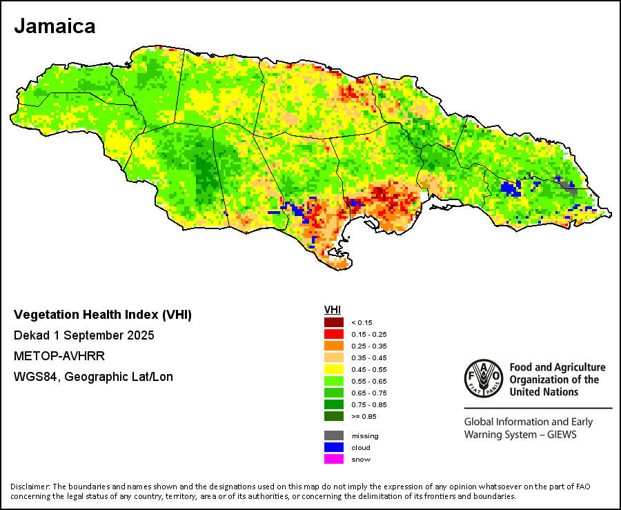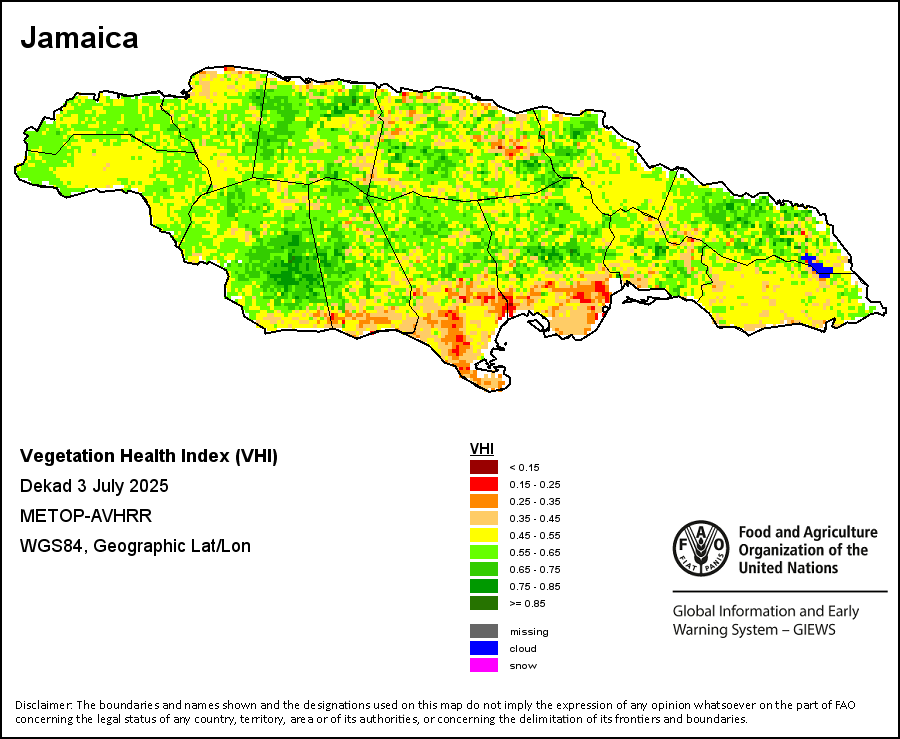 植被健康指数(VHI)根据植被健康状况以及气温对作物状况的影响情况显示干旱的严重程度。 VHI是一项综合指数,是用于计算ASI的基础性指标。它结合了植被状况指数(VCI)和气温状况指数(TCI)。TCI的计算采用了与VCI类似的方程,但它把当前气温与长期最高和最低值联系起来,因为一个假定前提是气温越高就倾向于造成植被状况恶化。比方说,VHI指数下降就意味着植被状况相对较差,而气温越高则意味着植被状况受到胁迫,较长时间延续则成为干旱的指征。VHI映像针对两个主要季节进行计算并分为三种时间模式:旬度、月度和年度。