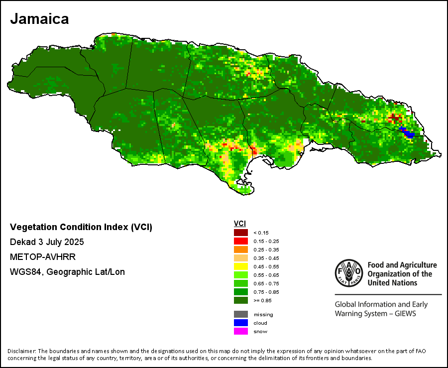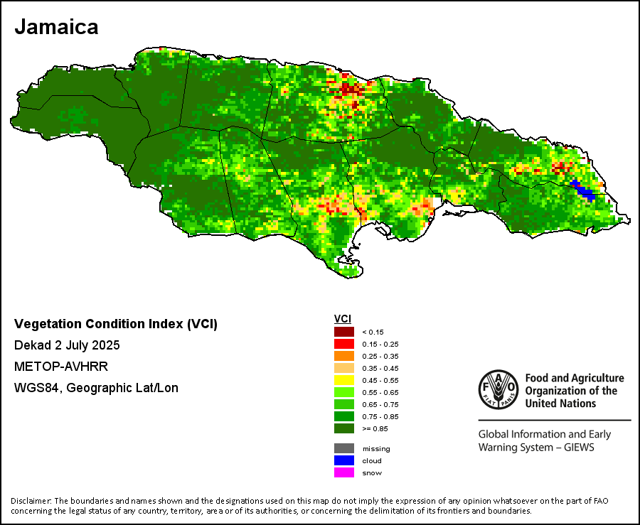 植被状况指数(VCI)评价的是与历史趋势相比当前的植被健康状况。 VCI指数考查的是当前一旬归一化差异植被指数(NDVI)与其长期最小值和最大值之间的关系,使用同一旬的历史NDVI值范围进行归一化计算。VCI的目的是把NDVI中与天气相关的成分从生态要素中分离出来。