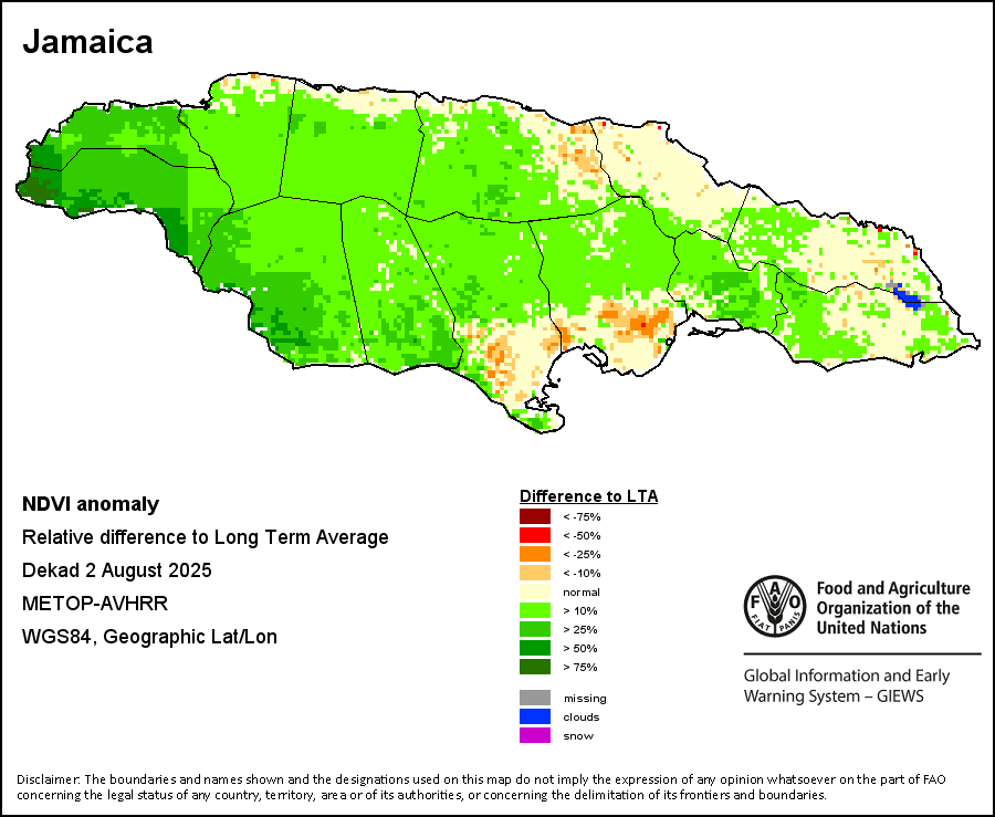 归一化差异植被指数(NDVI)衡量的是地表覆被的绿色程度,以此代表植被的密度和健康度情况。NDVI值的区间从+1至-1,正值越高代表植被的密度和健康度越高,NDVI低值和/或负值则显示植被状况不佳或稀疏。NDVI异常值显示的是当前10天与长期平均值之间的变量,正值(例如20%)就代表植被状况好于平均水平,而负值(如-40%)则代表植被状况相对较差。
