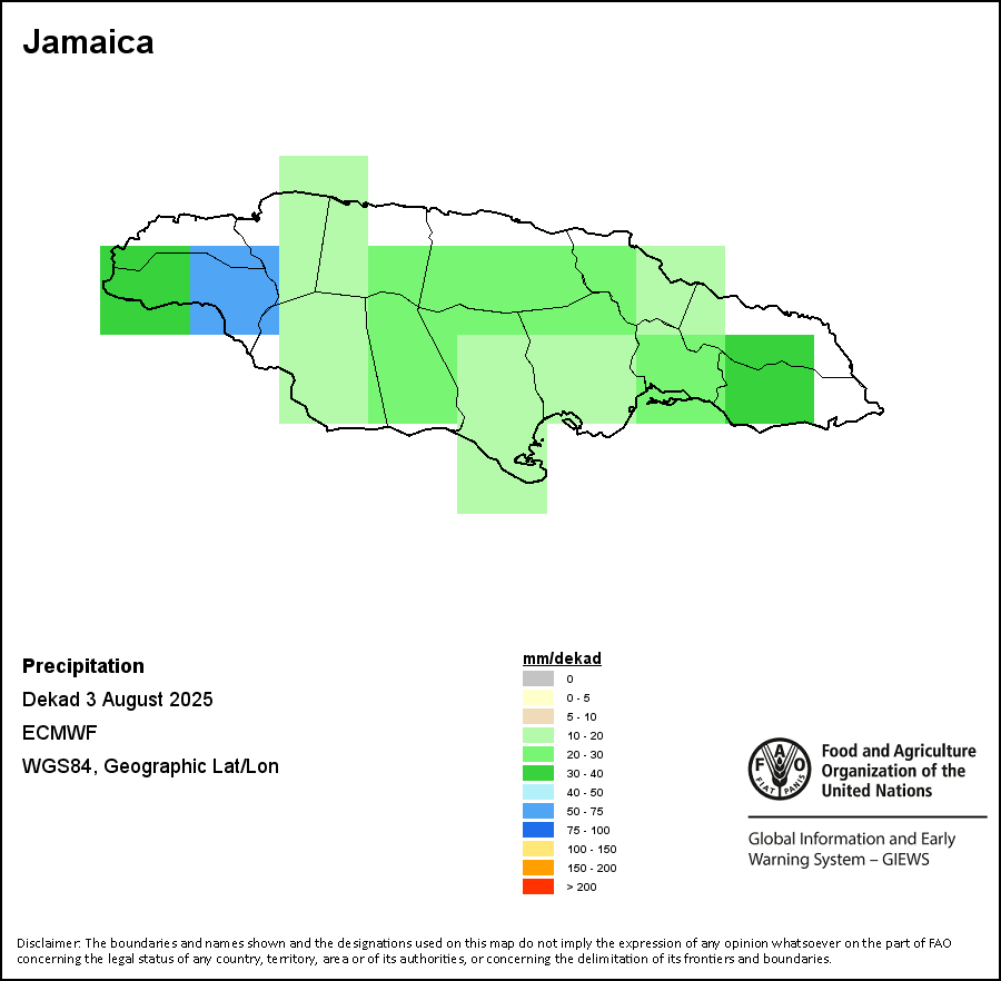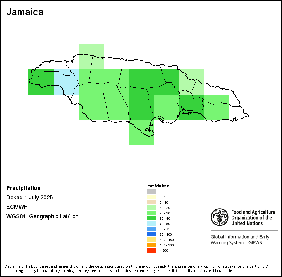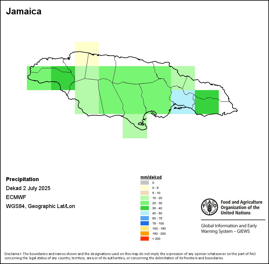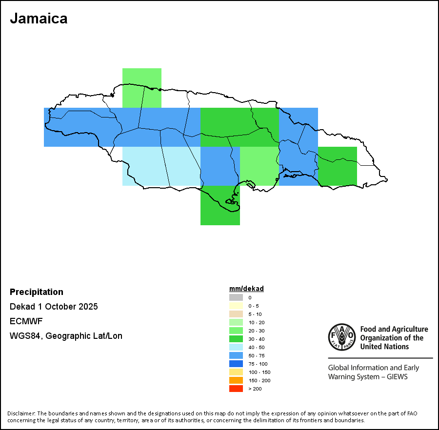 该图谱显示了每一旬(十天)的累积降水量。 所有非洲国家的降水量估算(除佛得角和毛里求斯外)均取自NOAA/FEWSNet,其他国家则取自ECMWF。