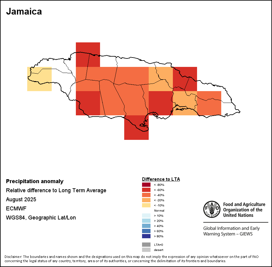 该图谱显示了当前降水量与平均水平之间的差异。 由降水量水平与长期平均值(LTA)进行比较得出,长期平均值系指1989-2015年期间的数值。暖色调指示的是降水量低于平均水平的地区,而冷色调指示的则是降水量高于平均水平的地区。降雨量估算数据来自欧洲中期天气预报这些(ECMWF)。