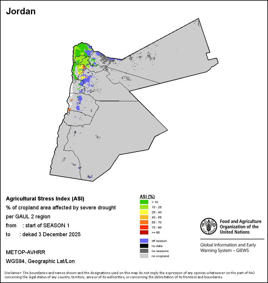 El Índice de Estrés Agrícola (ASI, por sus siglas en inglés) es un indicador que facilita la identificación temprana de tierras cultivadas con alta probabilidad de estrés hídrico (sequía) de un vistazo rápido. El Índice de Estrés Agrícola (ASI) integra el Índice de Salud de la Vegetación (VHI, por sus siglas en inglés) en dos dimensiones fundamentales para evaluar un episodio de sequía en la agricultura: la temporal y la espacial. El primer paso para calcular el ASI consiste en determinar la media temporal del VHI, evaluando la intensidad y duración de los períodos secos que se producen durante el ciclo de cultivo a nivel de píxel; este cálculo incluye la utilización de coeficientes del cultivo, que introducen la sensibilidad de éste al estrés hídrico durante cada fase fenológica. El segundo paso radica en determinar la extensión espacial de las sequías calculando el porcentaje de píxeles en zonas cultivables con un VHI por debajo del 35 por ciento (una investigación anterior -Kogan, 1995- identificó este valor como umbral crítico para evaluar el alcance de una sequía). Cada zona administrativa se clasifica en función del porcentaje de superficie afectada por la sequía para facilitar una interpretación rápida de los resultados.