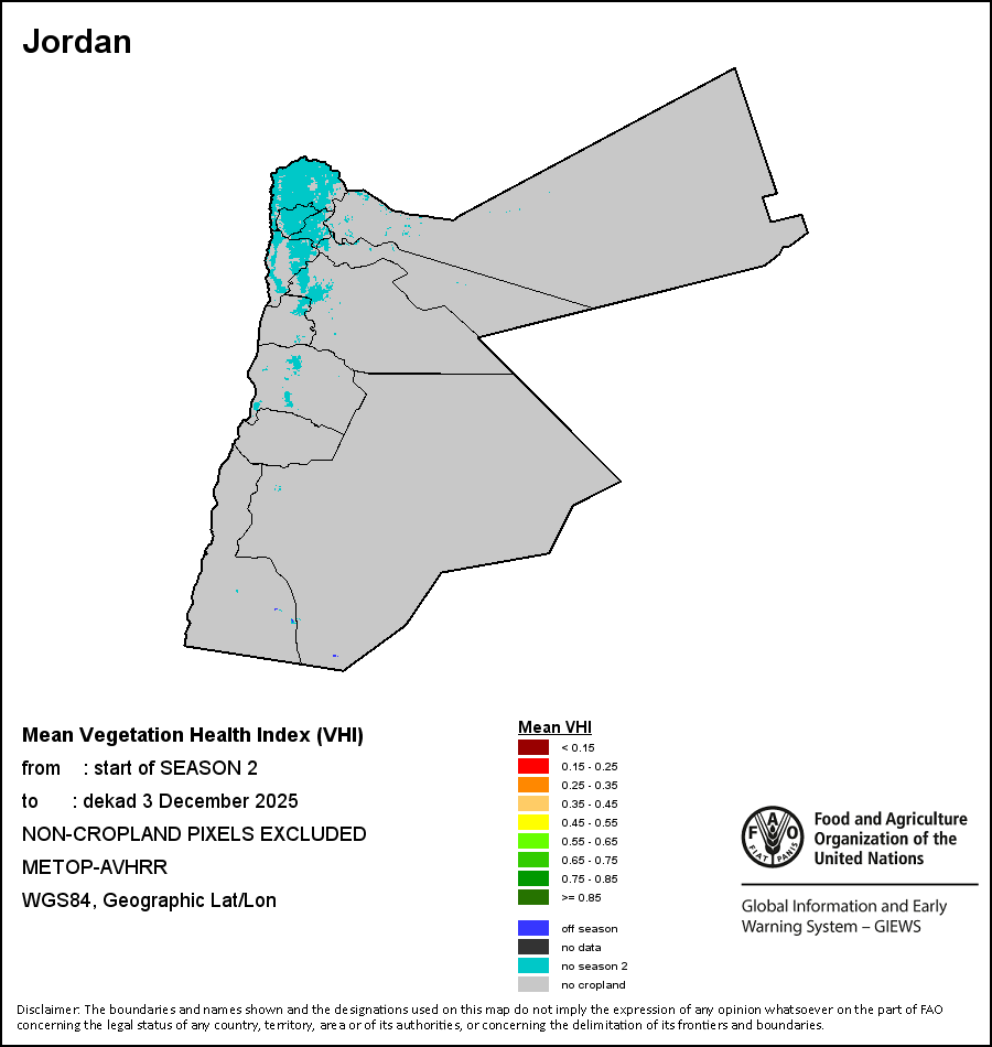 El Índice de Salud de la Vegetación Medio ponderada (VHI medio ponderada) permite al usuario evaluar la gravedad de la sequía desde el inicio del período vegetativo, analizar la salud de la vegetación y estudiar la influencia de la temperatura en las condiciones de las plantas. El VHI medio ponderada es el promedio de los valores del VHI registrados cada diez días durante todo el periodo vegetativo del cultivo (desde el inicio hasta el último período de 10 días analizado), ponderado por los coeficientes de cultivo (Kc), asignados a los valores del VHI en los registros correspondientes al inicio de la temporada (SOS), al máximo de la temporada (MOS) y al final de la temporada (EOS). El coeficiente de cultivo se aplica con el fin de reflejar la sensibilidad al agua del cultivo en las diferentes etapas fenológicas.