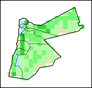 Нормализованный Индекс Разности Растительности (NDVI) измеряет «зелёность» почвенного покрова и используется в качестве прокси, для определения плотности и здоровья растительного покрова. Значения NDVI варьируются от +1 до -1, с высокими положительными значениями, соответствующими плотной и здоровой растительности, и низкими и/или отрицательными значениями NDVI, указывающими на плохое состояние растений и редкий растительный покров. NDVI Аномалия указывает на изменения в текущей декаде относительно среднего значения длительных исторических показателей, где положительное значение (например, 20 процентов) означает улучшенное состояние растительности по сравнению со средним показателем, тогда как отрицательное значение (например, -40 процентов) указывает на сравнительно плохое состояние растений.