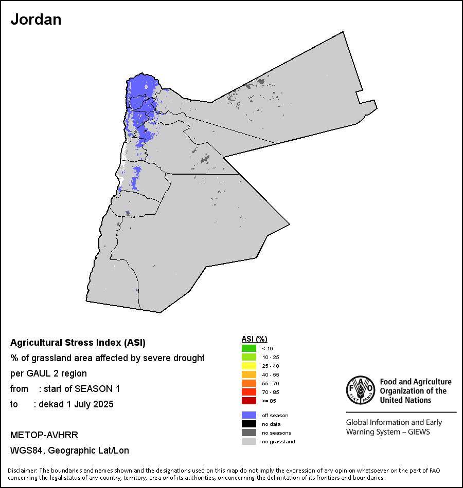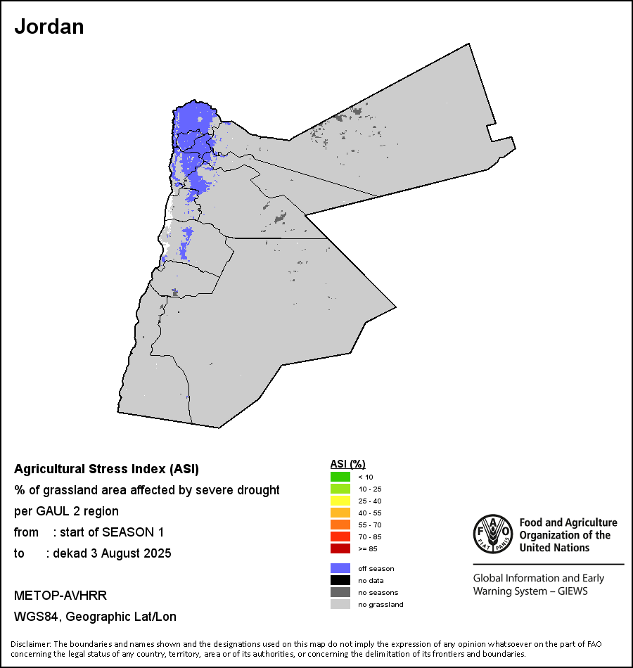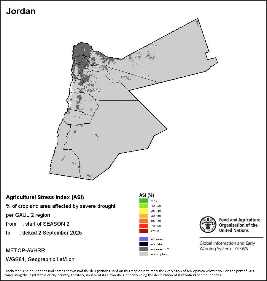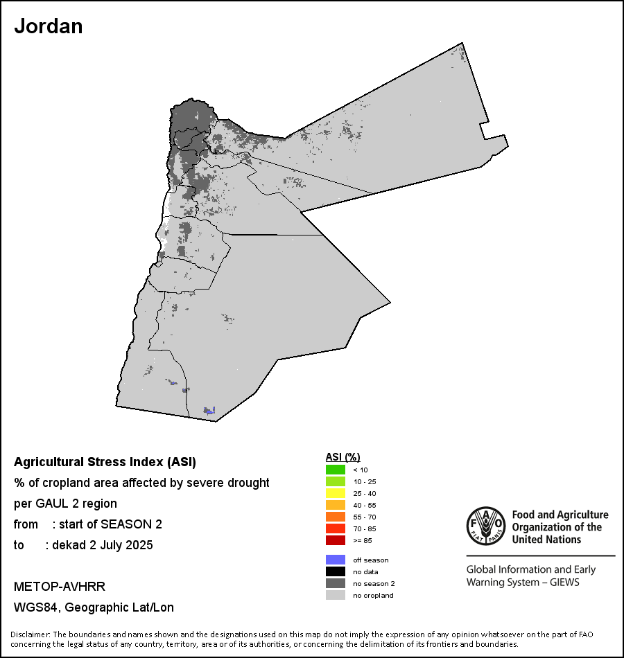 农业干旱胁迫指数(ASI)是一项速览指数,有助于在早期甄别较大可能发生水胁迫(干旱)的耕地。 该指数通过整合植被健康指数(VHI)在评估农业旱情方面具有关键意义的两个维度,即时间和空间维度,而得出。计算农业干旱胁迫指数的第一步是求植被健康指数的时间平均值,对作物周期内旱情的强度和时长进行像素级评估;这项计算包括采用作物系数衡量某种作物在各物候阶段对干旱胁迫的敏感度。第二步是确定旱情的空间广度,方法是计算植被健康指数值低于35%(Kogan前期研究将这一数值确定为评估干旱程度的临界值,1995年)的耕地的像素百分比。然后把各个行政区域根据受影响面积的百分比进行划分,便于对结果进行快速解读。