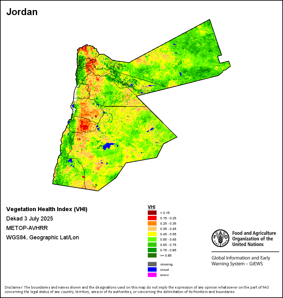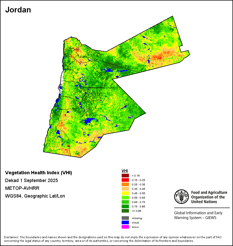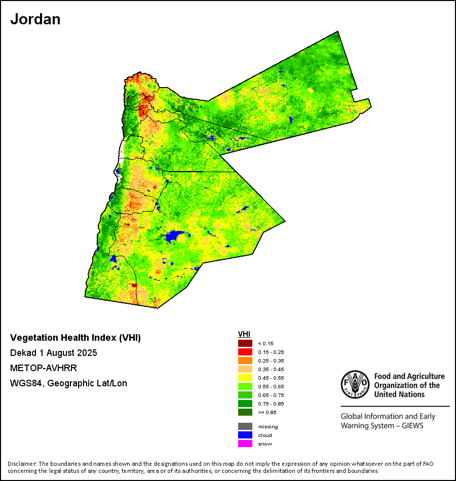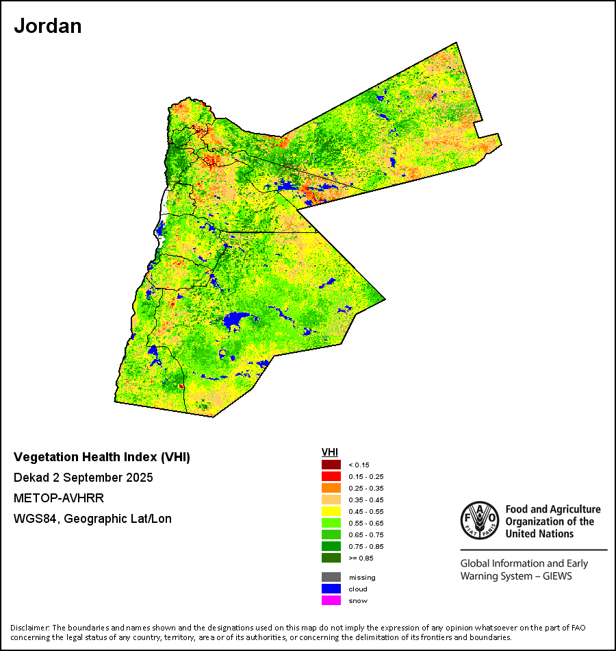 植被健康指数(VHI)根据植被健康状况以及气温对作物状况的影响情况显示干旱的严重程度。 VHI是一项综合指数,是用于计算ASI的基础性指标。它结合了植被状况指数(VCI)和气温状况指数(TCI)。TCI的计算采用了与VCI类似的方程,但它把当前气温与长期最高和最低值联系起来,因为一个假定前提是气温越高就倾向于造成植被状况恶化。比方说,VHI指数下降就意味着植被状况相对较差,而气温越高则意味着植被状况受到胁迫,较长时间延续则成为干旱的指征。VHI映像针对两个主要季节进行计算并分为三种时间模式:旬度、月度和年度。