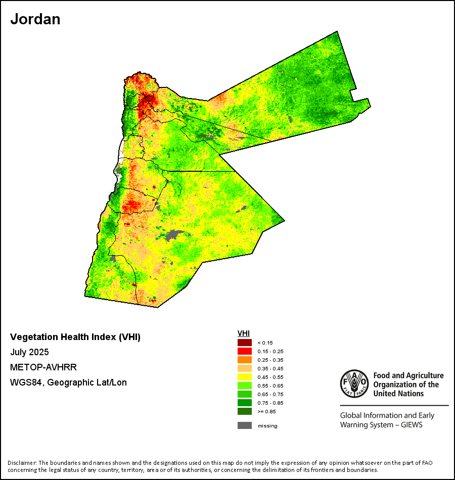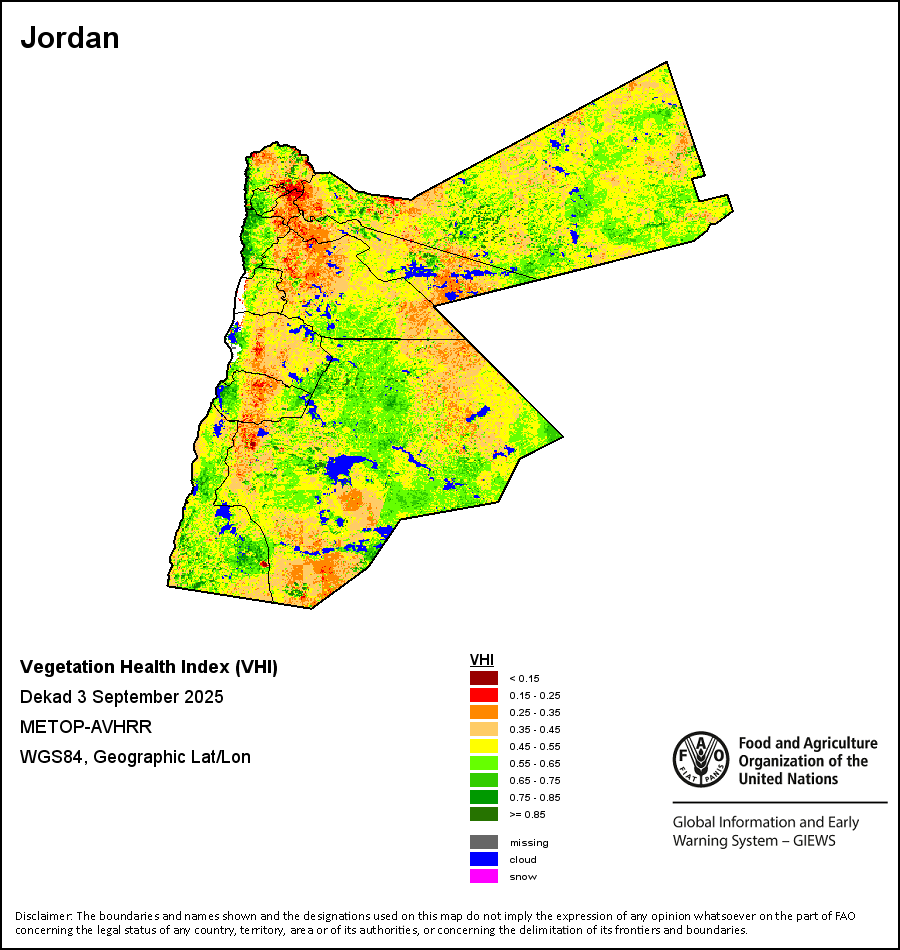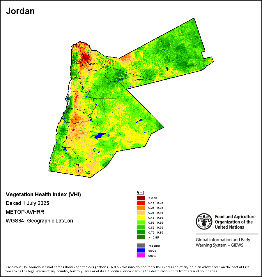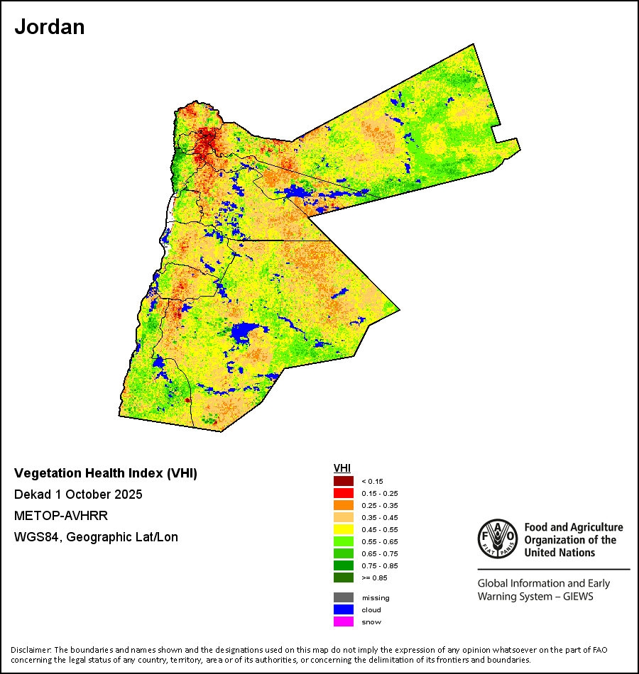 植被健康指数(VHI)根据植被健康状况以及气温对作物状况的影响情况显示干旱的严重程度。 VHI是一项综合指数,是用于计算ASI的基础性指标。它结合了植被状况指数(VCI)和气温状况指数(TCI)。TCI的计算采用了与VCI类似的方程,但它把当前气温与长期最高和最低值联系起来,因为一个假定前提是气温越高就倾向于造成植被状况恶化。比方说,VHI指数下降就意味着植被状况相对较差,而气温越高则意味着植被状况受到胁迫,较长时间延续则成为干旱的指征。VHI映像针对两个主要季节进行计算并分为三种时间模式:旬度、月度和年度。