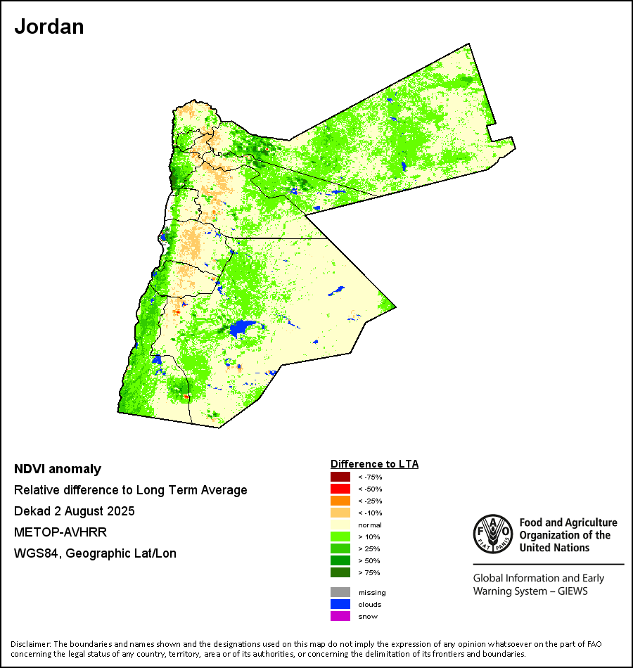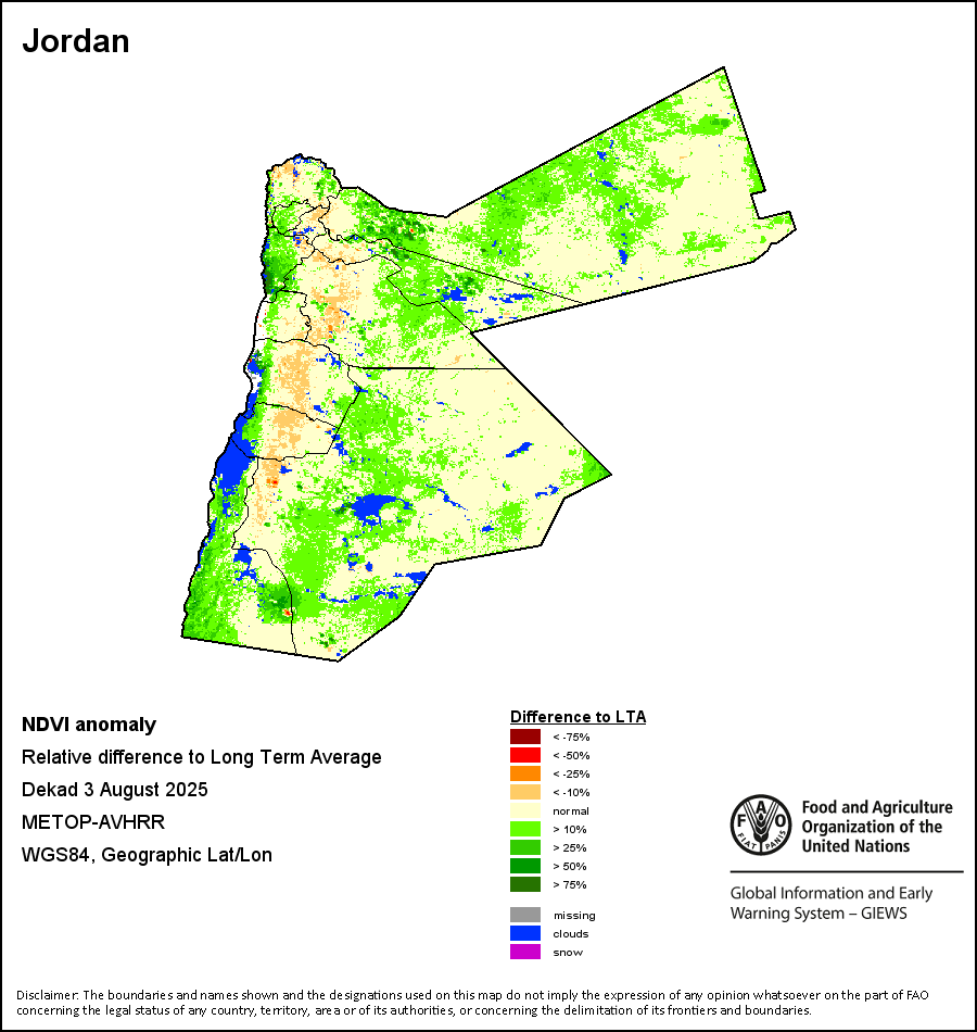 归一化差异植被指数(NDVI)衡量的是地表覆被的绿色程度,以此代表植被的密度和健康度情况。NDVI值的区间从+1至-1,正值越高代表植被的密度和健康度越高,NDVI低值和/或负值则显示植被状况不佳或稀疏。NDVI异常值显示的是当前10天与长期平均值之间的变量,正值(例如20%)就代表植被状况好于平均水平,而负值(如-40%)则代表植被状况相对较差。