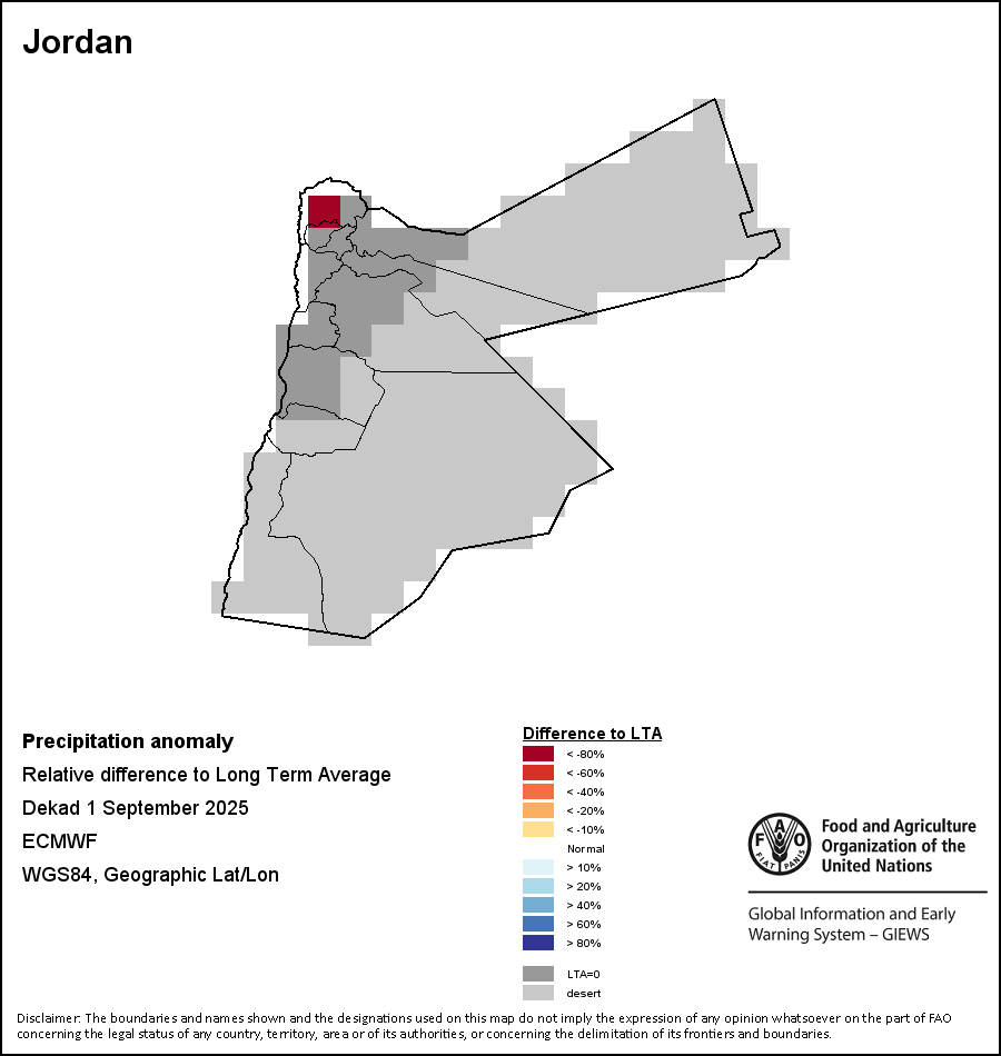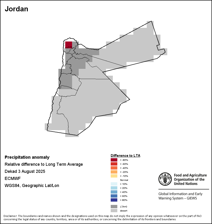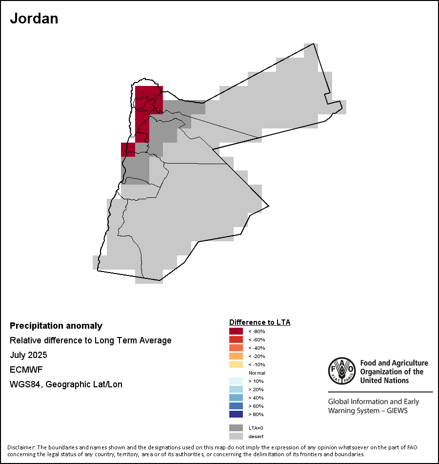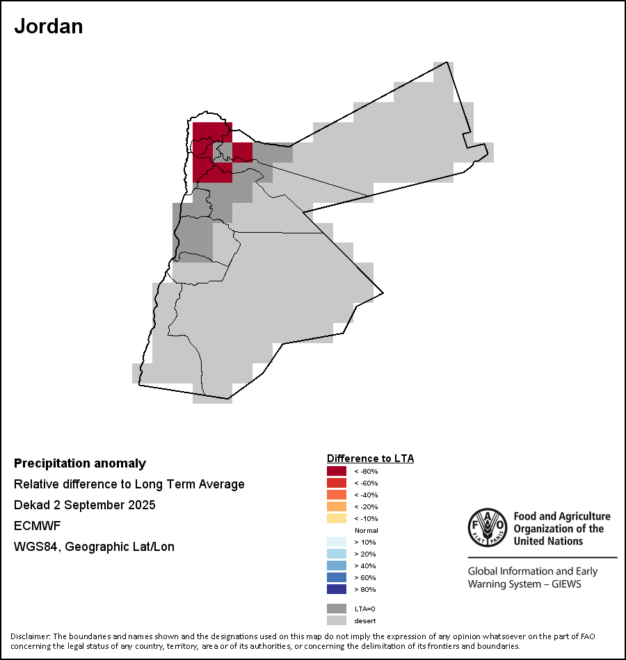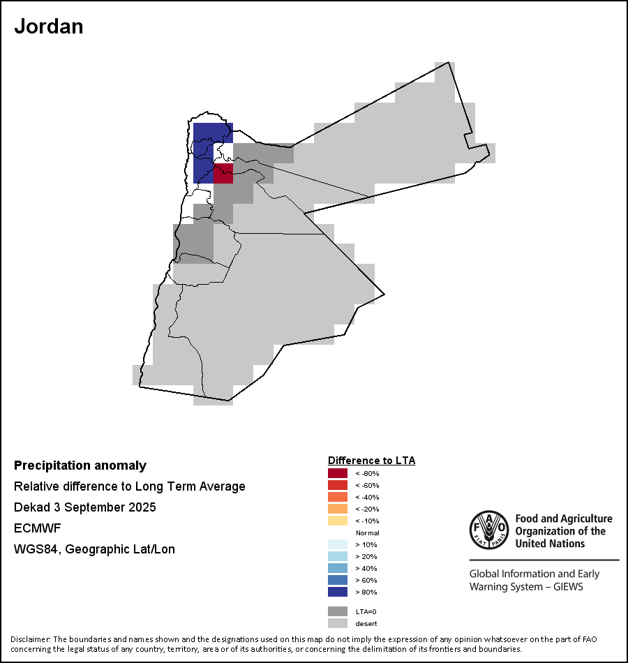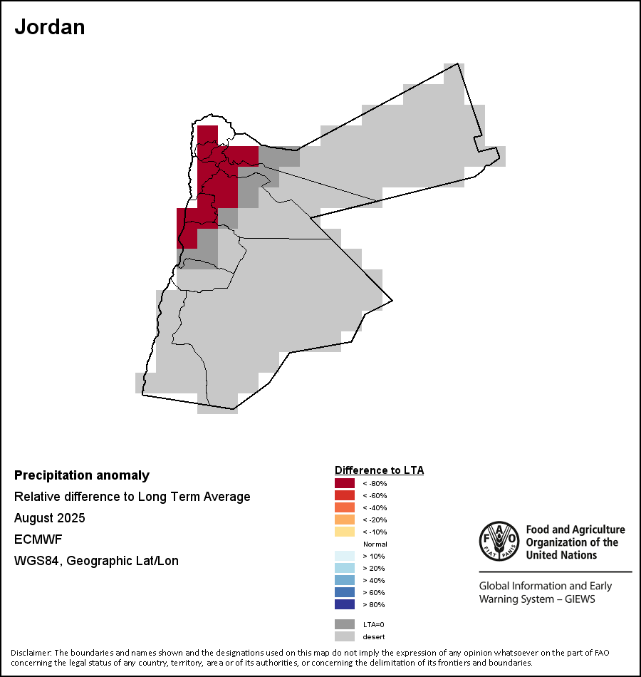 该图谱显示了当前降水量与平均水平之间的差异。 由降水量水平与长期平均值(LTA)进行比较得出,长期平均值系指1989-2015年期间的数值。暖色调指示的是降水量低于平均水平的地区,而冷色调指示的则是降水量高于平均水平的地区。降雨量估算数据来自欧洲中期天气预报这些(ECMWF)。