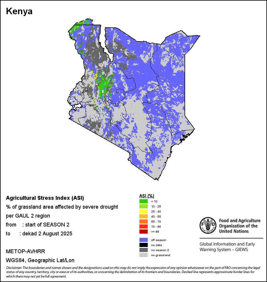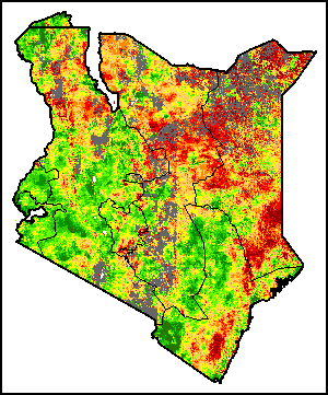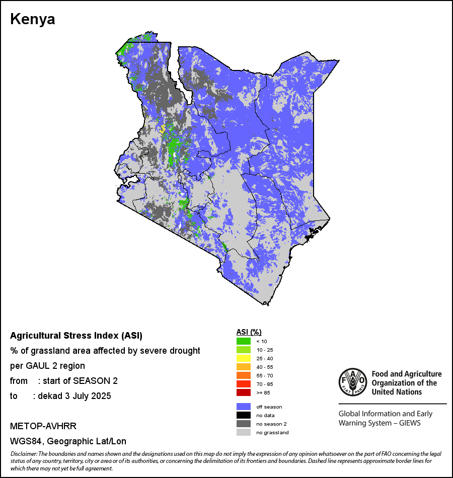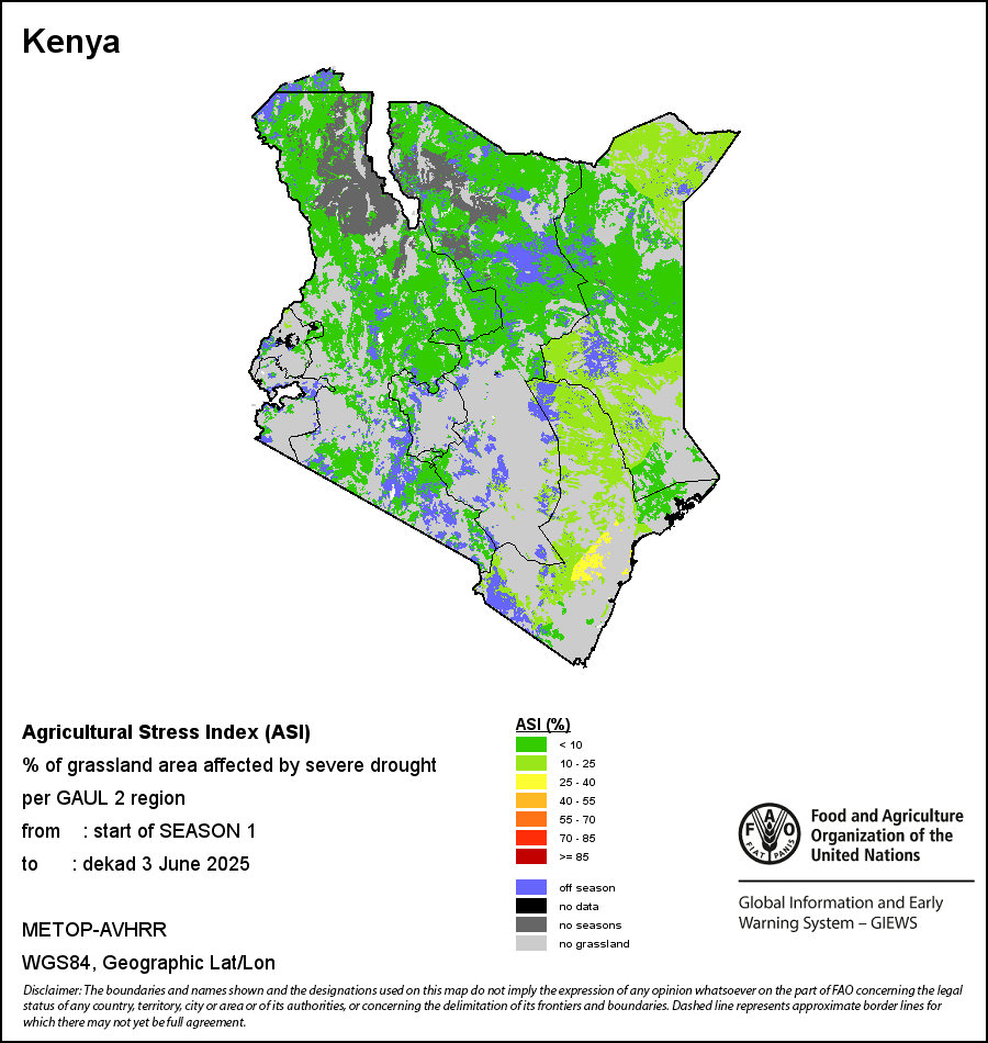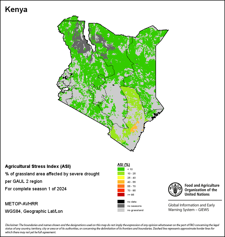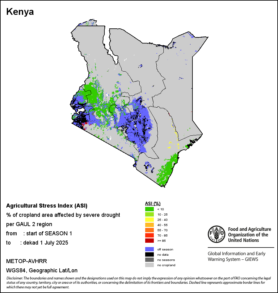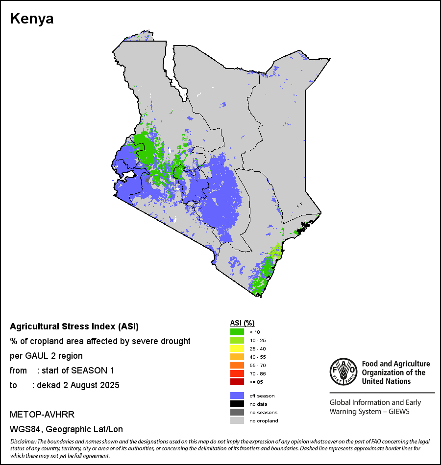 The Agricultural Stress Index (ASI) is a quick-look indicator that facilitates the early identification of cropped land with a high likelihood of water stress (drought). The Index is based on the integration of the Vegetation Health Index (VHI) in two dimensions that are critical in the assessment of a drought event in agriculture: temporal and spatial. The first step of the ASI calculation is a temporal averaging of the VHI, assessing the intensity and duration of dry periods occurring during the crop cycle at the pixel level; this calculation includes the use of crop coefficients, which introduces sensitivity of a crop to water stress during each phenological phase. The second step determines the spatial extent of drought events by calculating the percentage of pixels in arable areas with a VHI value below 35 percent (this value was identified as a critical threshold in assessing the extent of drought in previous research by Kogan, 1995). Each administrative area is classified according to the percentage of the affected area to facilitate the quick interpretation of results.