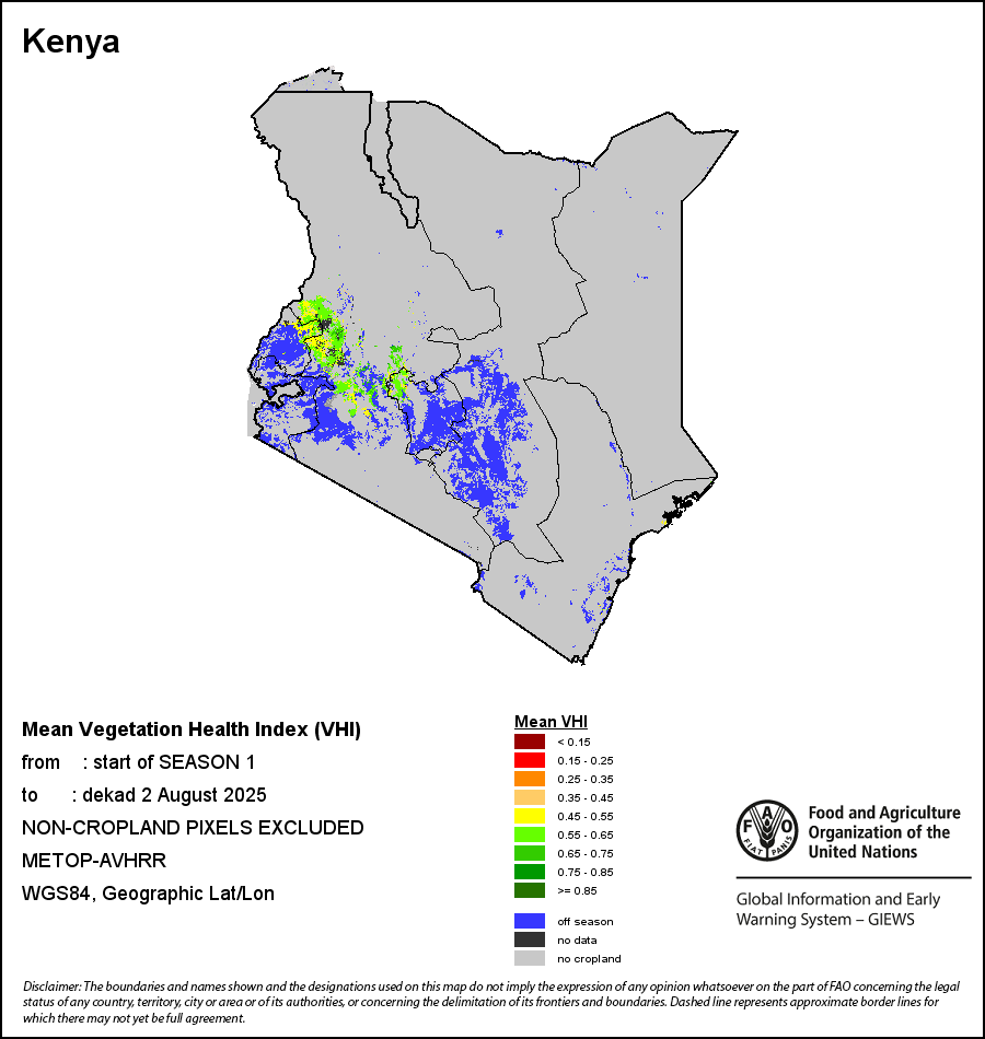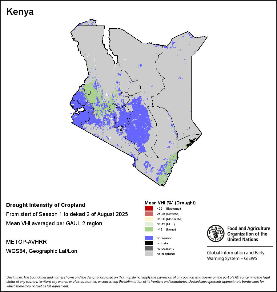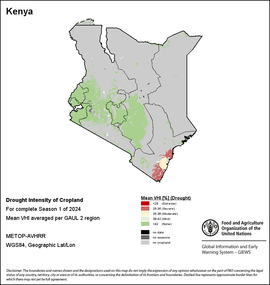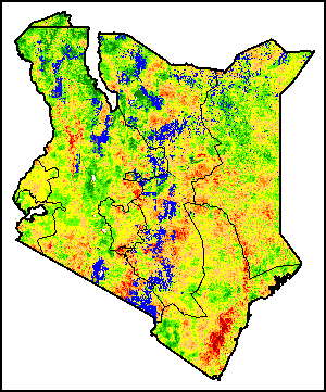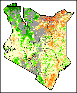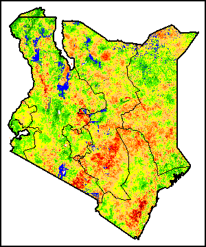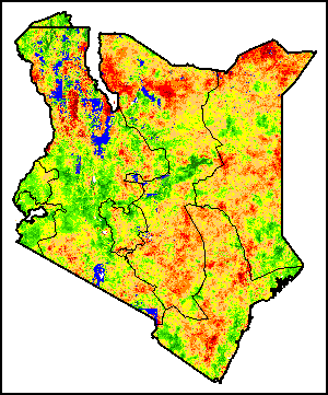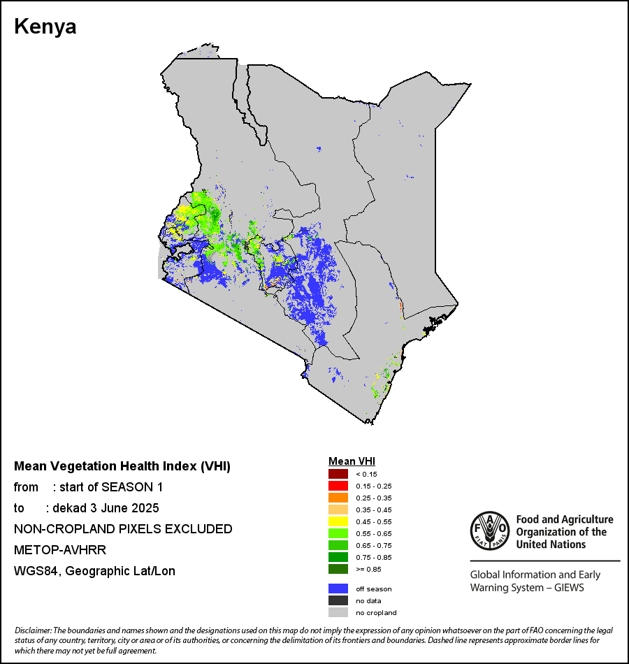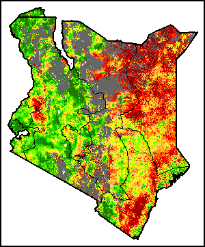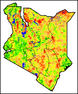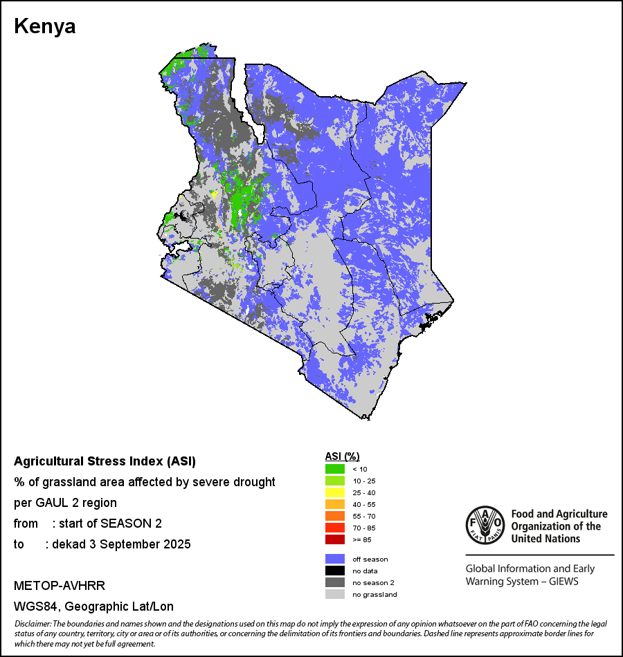 The Agricultural Stress Index (ASI) is a quick-look indicator that facilitates the early identification of cropped land with a high likelihood of water stress (drought). The Index is based on the integration of the Vegetation Health Index (VHI) in two dimensions that are critical in the assessment of a drought event in agriculture: temporal and spatial. The first step of the ASI calculation is a temporal averaging of the VHI, assessing the intensity and duration of dry periods occurring during the crop cycle at the pixel level; this calculation includes the use of crop coefficients, which introduces sensitivity of a crop to water stress during each phenological phase. The second step determines the spatial extent of drought events by calculating the percentage of pixels in arable areas with a VHI value below 35 percent (this value was identified as a critical threshold in assessing the extent of drought in previous research by Kogan, 1995). Each administrative area is classified according to the percentage of the affected area to facilitate the quick interpretation of results.