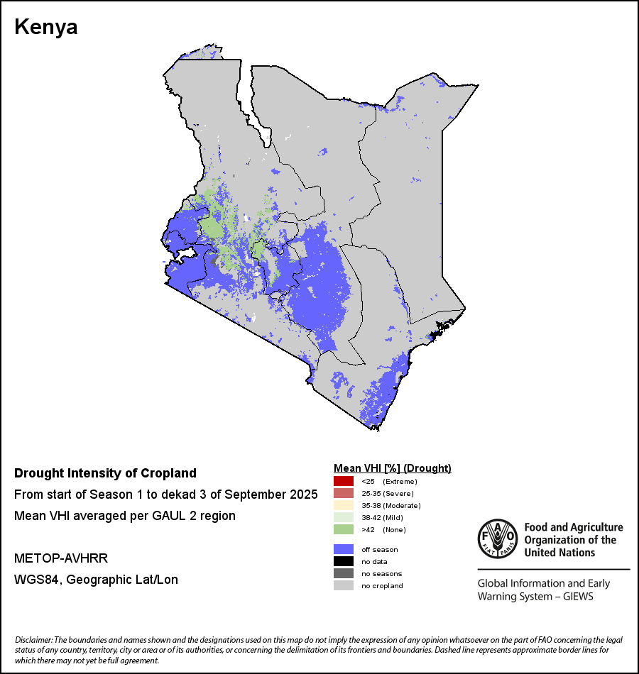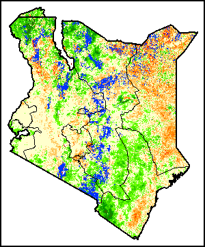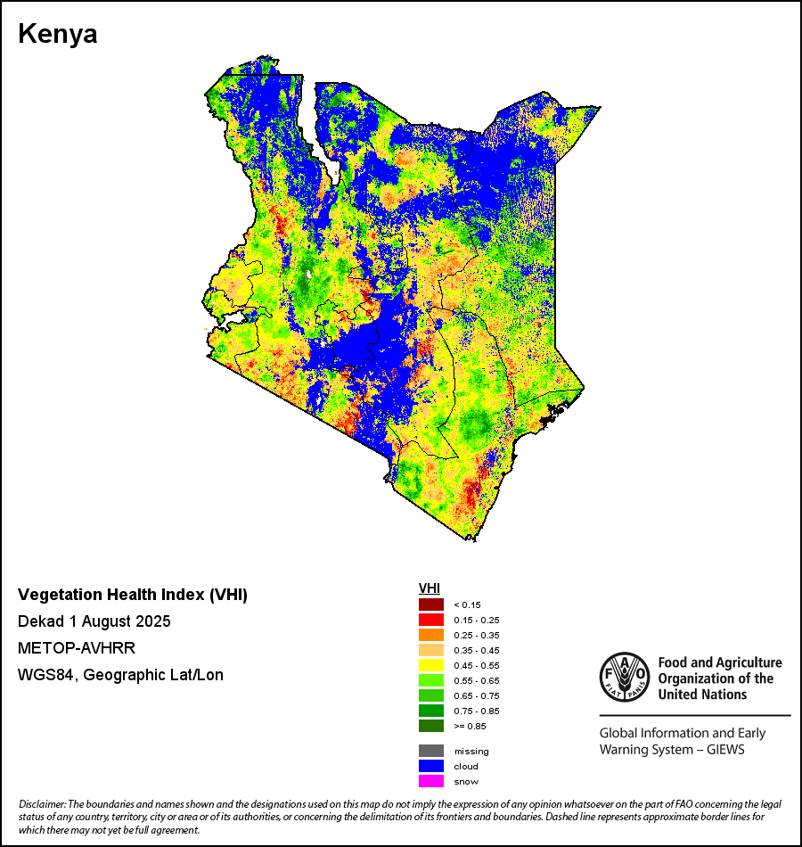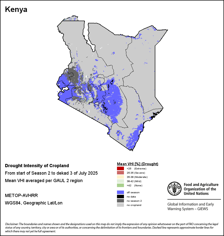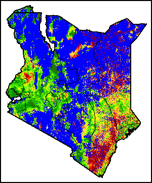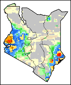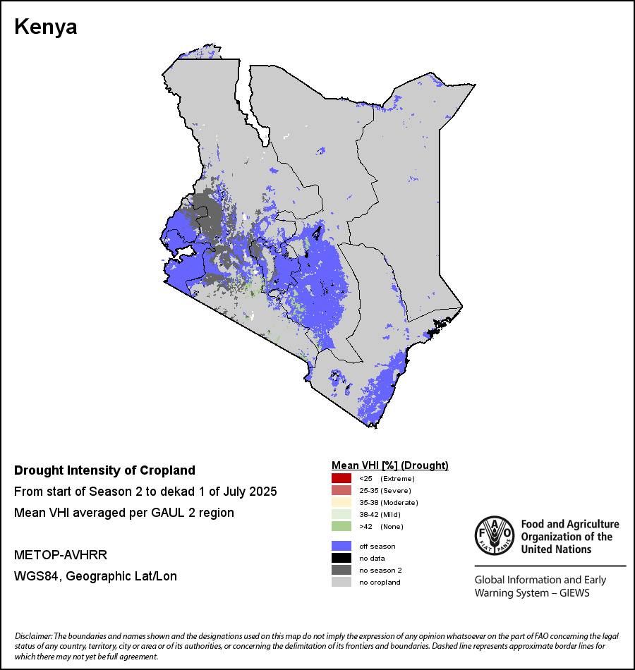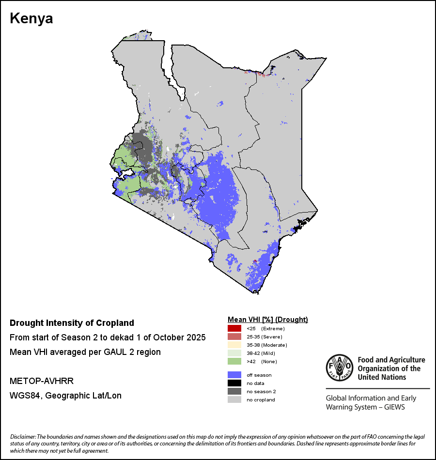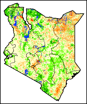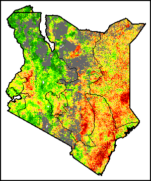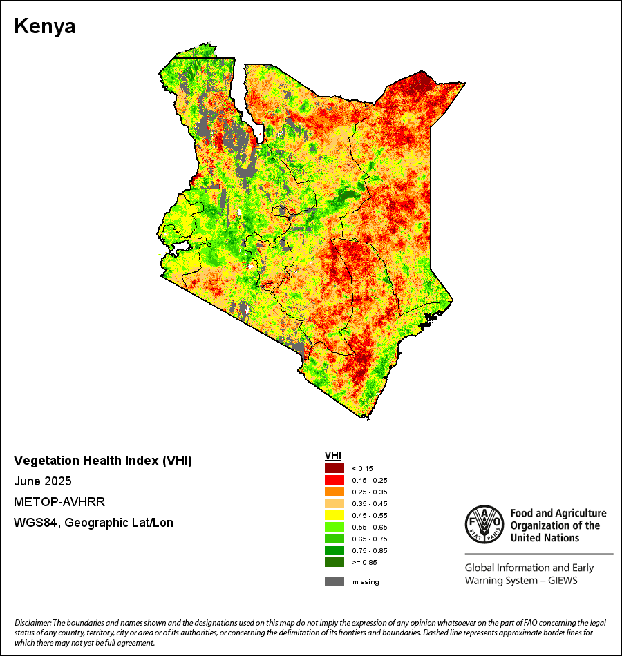 The Agricultural Stress Index (ASI) is a quick-look indicator that facilitates the early identification of cropped land with a high likelihood of water stress (drought). The Index is based on the integration of the Vegetation Health Index (VHI) in two dimensions that are critical in the assessment of a drought event in agriculture: temporal and spatial. The first step of the ASI calculation is a temporal averaging of the VHI, assessing the intensity and duration of dry periods occurring during the crop cycle at the pixel level; this calculation includes the use of crop coefficients, which introduces sensitivity of a crop to water stress during each phenological phase. The second step determines the spatial extent of drought events by calculating the percentage of pixels in arable areas with a VHI value below 35 percent (this value was identified as a critical threshold in assessing the extent of drought in previous research by Kogan, 1995). Each administrative area is classified according to the percentage of the affected area to facilitate the quick interpretation of results.