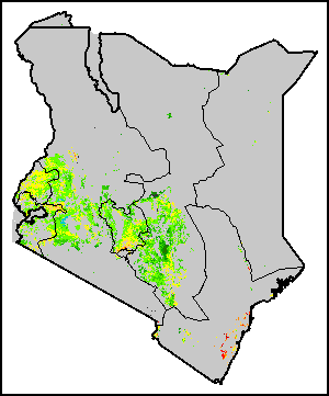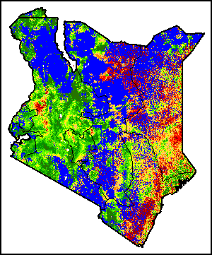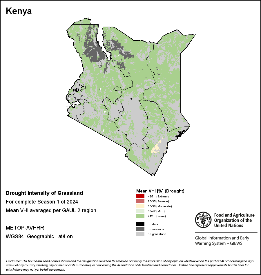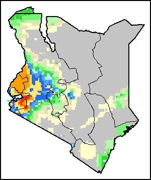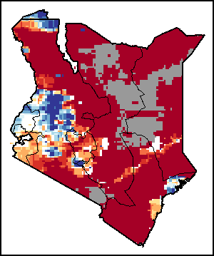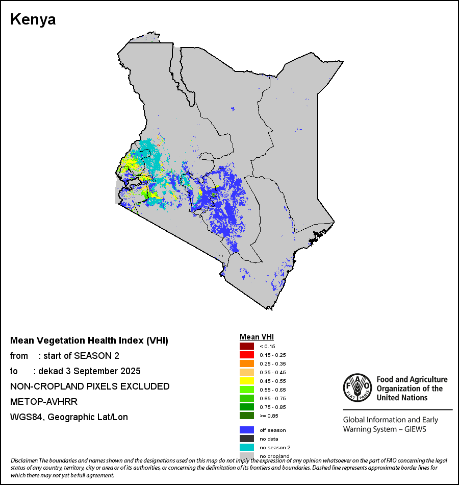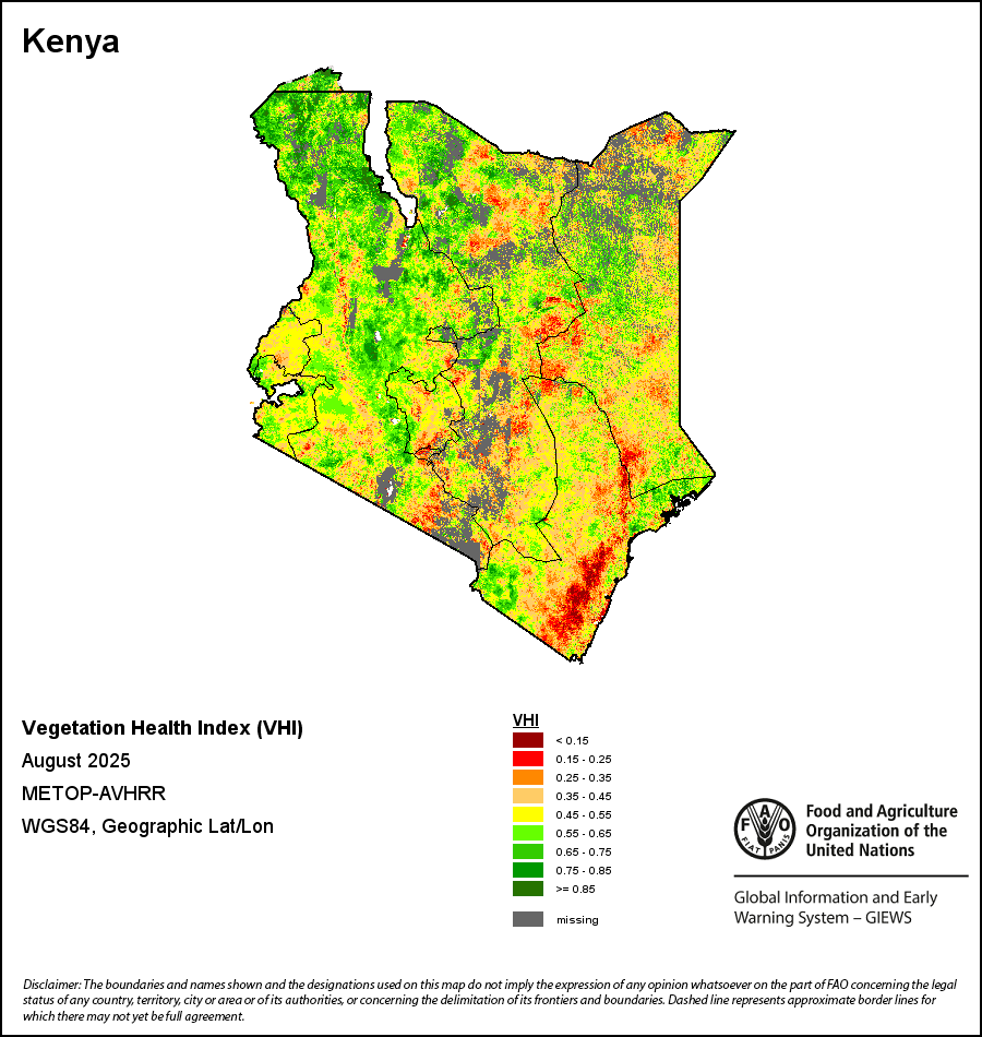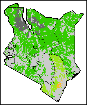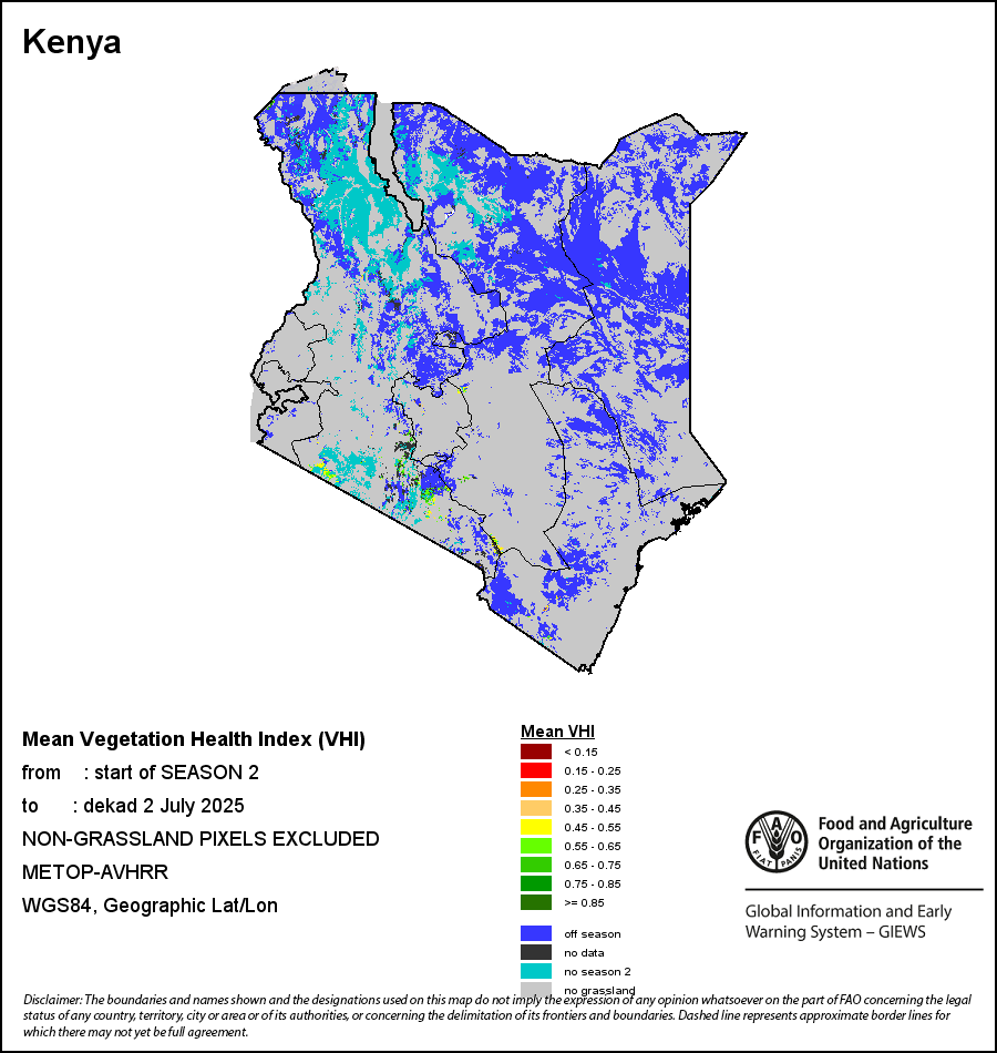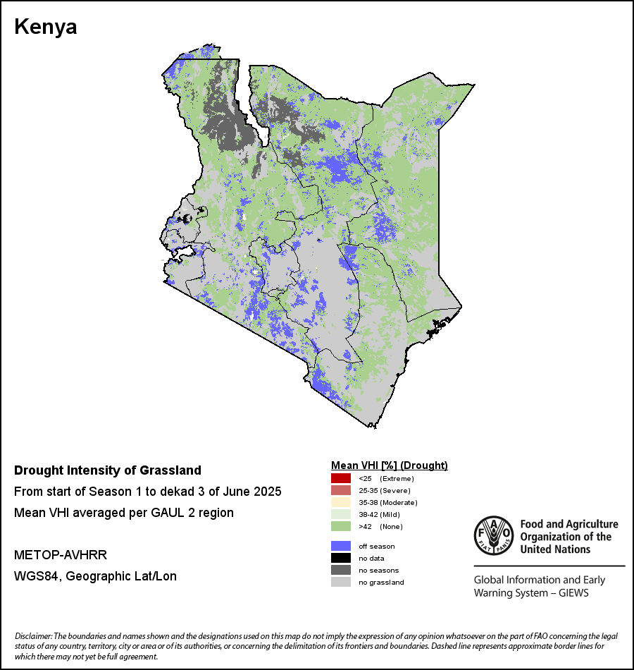 The Agricultural Stress Index (ASI) is a quick-look indicator that facilitates the early identification of cropped land with a high likelihood of water stress (drought). The Index is based on the integration of the Vegetation Health Index (VHI) in two dimensions that are critical in the assessment of a drought event in agriculture: temporal and spatial. The first step of the ASI calculation is a temporal averaging of the VHI, assessing the intensity and duration of dry periods occurring during the crop cycle at the pixel level; this calculation includes the use of crop coefficients, which introduces sensitivity of a crop to water stress during each phenological phase. The second step determines the spatial extent of drought events by calculating the percentage of pixels in arable areas with a VHI value below 35 percent (this value was identified as a critical threshold in assessing the extent of drought in previous research by Kogan, 1995). Each administrative area is classified according to the percentage of the affected area to facilitate the quick interpretation of results.
