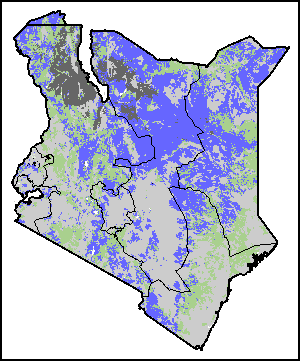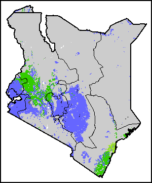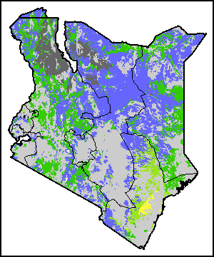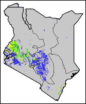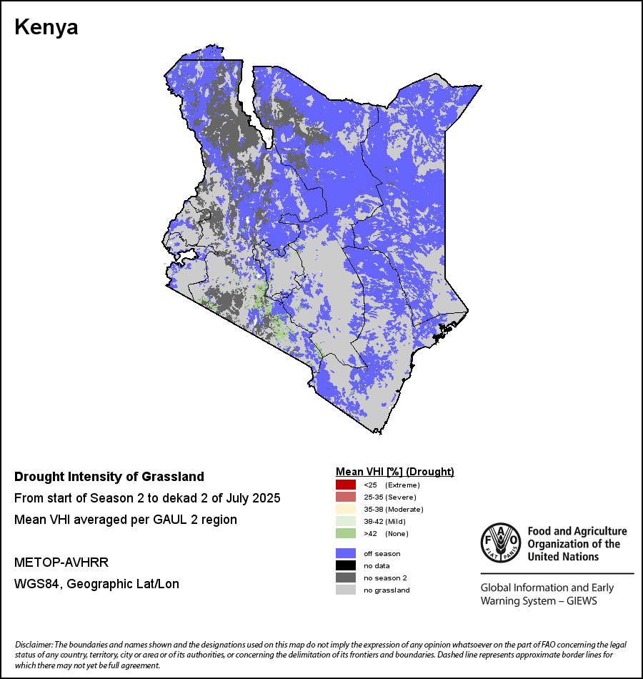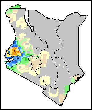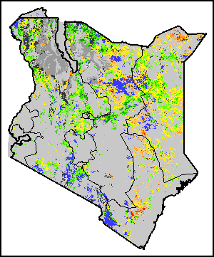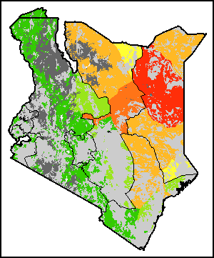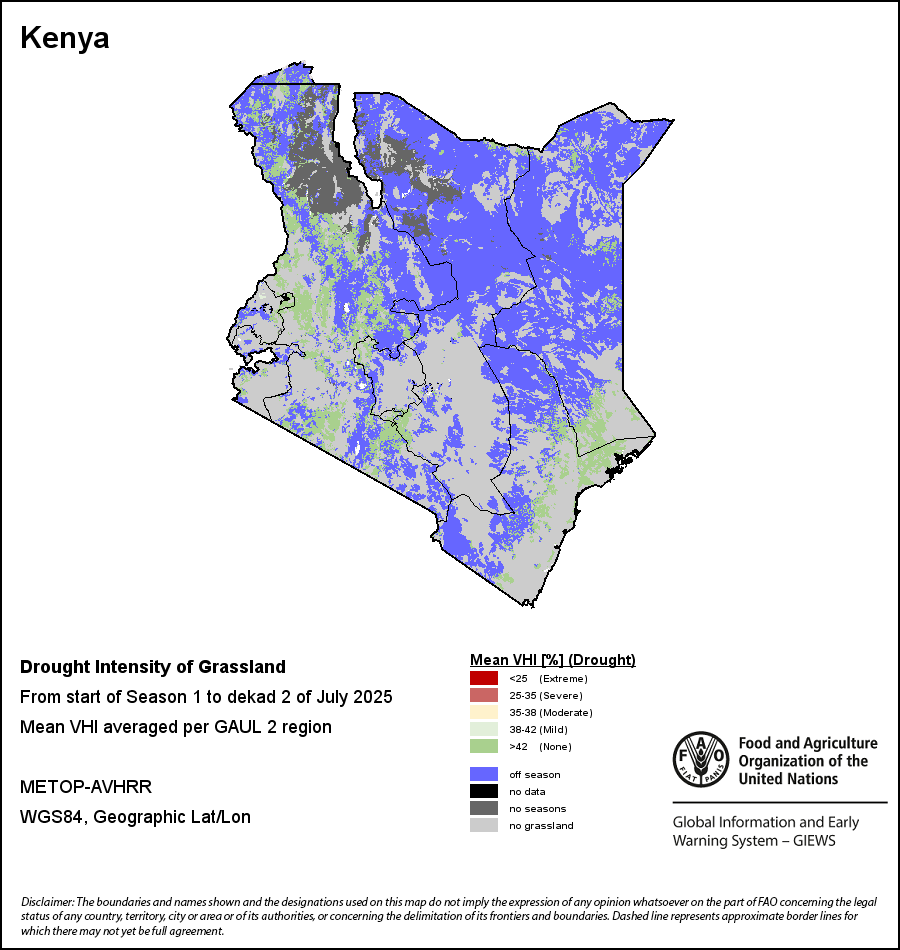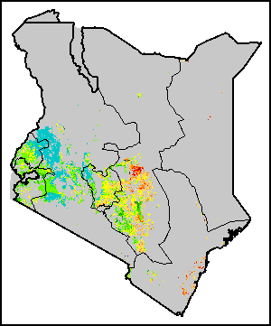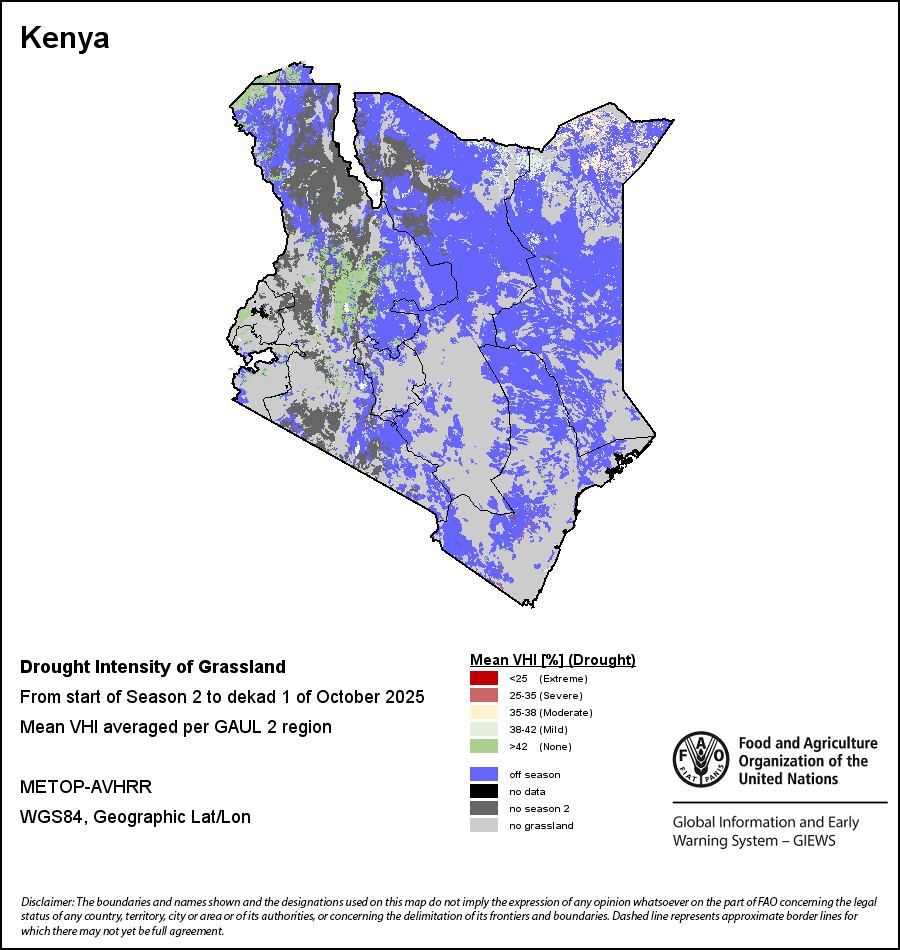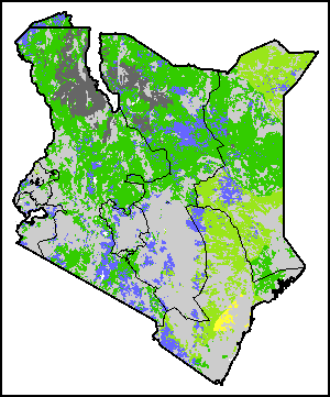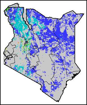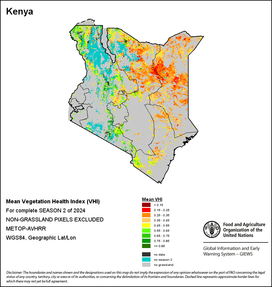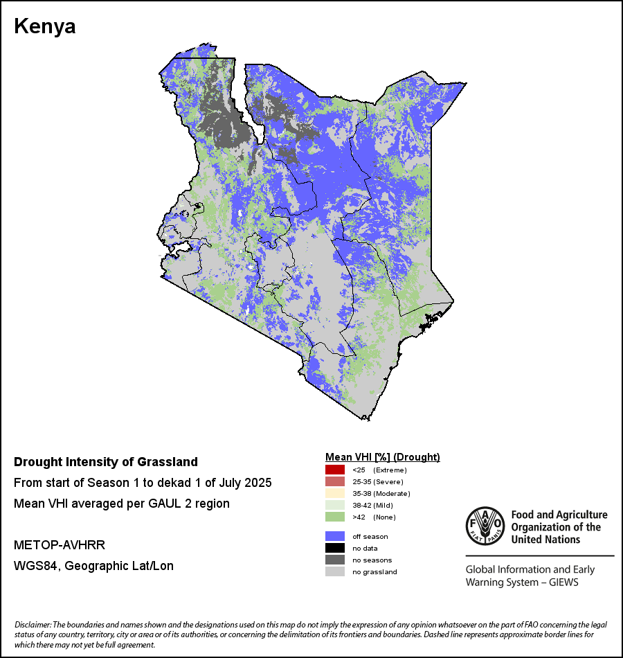 The Agricultural Stress Index (ASI) is a quick-look indicator that facilitates the early identification of cropped land with a high likelihood of water stress (drought). The Index is based on the integration of the Vegetation Health Index (VHI) in two dimensions that are critical in the assessment of a drought event in agriculture: temporal and spatial. The first step of the ASI calculation is a temporal averaging of the VHI, assessing the intensity and duration of dry periods occurring during the crop cycle at the pixel level; this calculation includes the use of crop coefficients, which introduces sensitivity of a crop to water stress during each phenological phase. The second step determines the spatial extent of drought events by calculating the percentage of pixels in arable areas with a VHI value below 35 percent (this value was identified as a critical threshold in assessing the extent of drought in previous research by Kogan, 1995). Each administrative area is classified according to the percentage of the affected area to facilitate the quick interpretation of results.