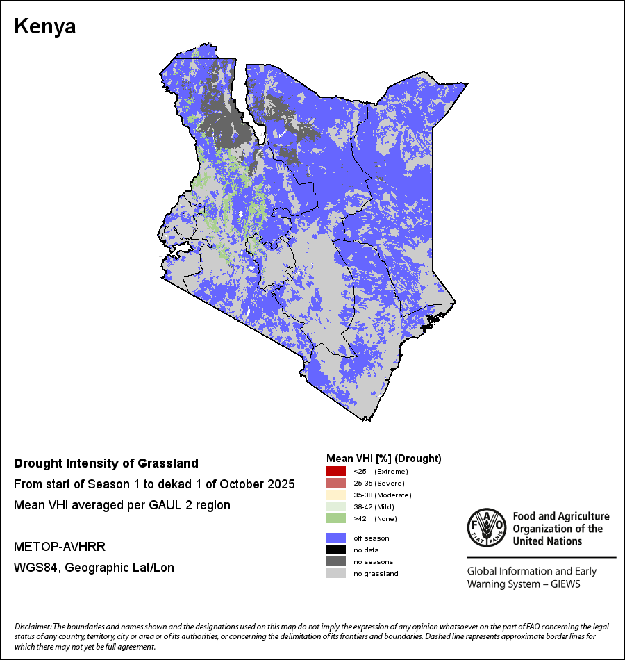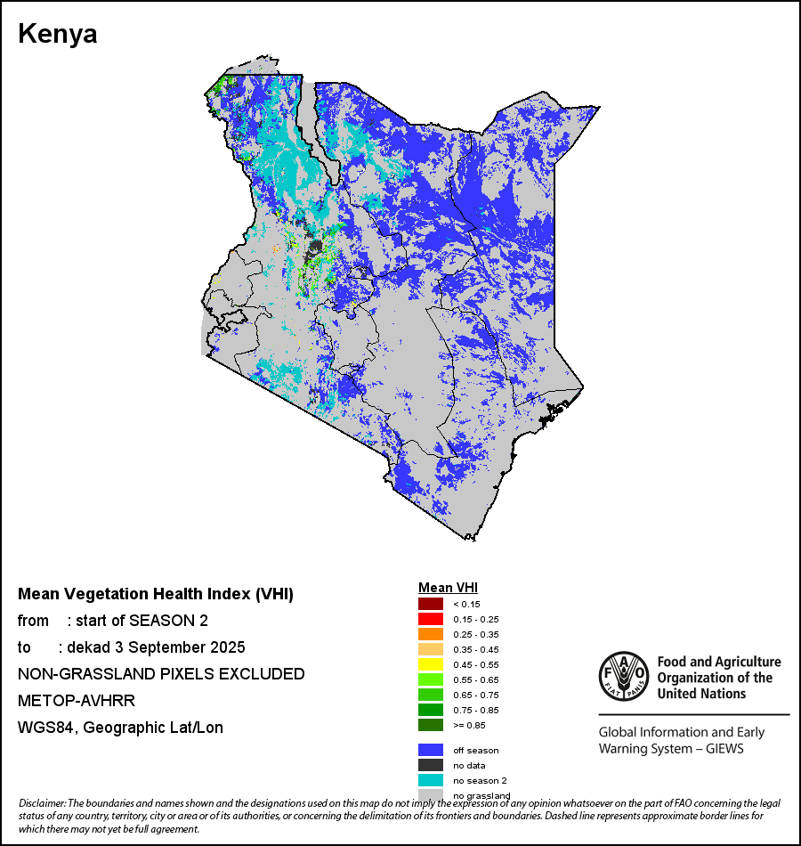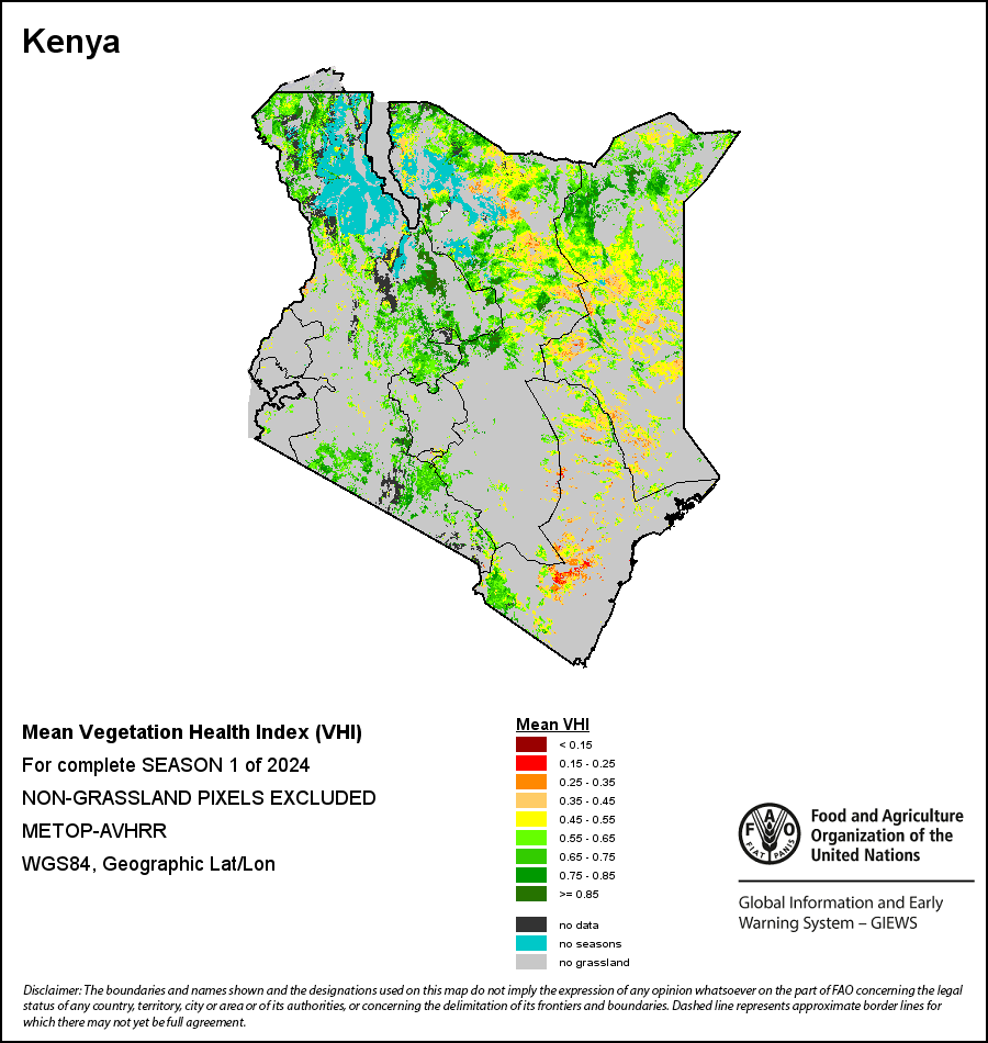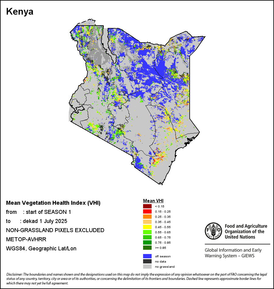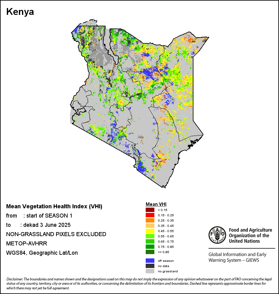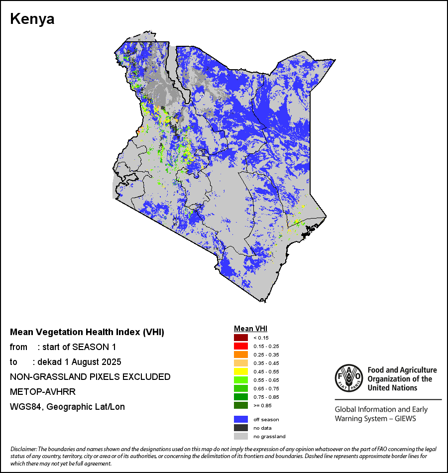 The country level maps and graphs depict the latest 36-month period of the seasonal, vegetation and precipitation indicators. The data is presented by dekad and month.   More