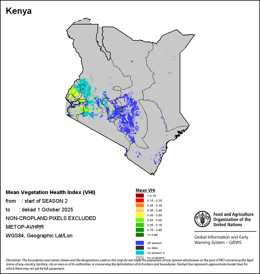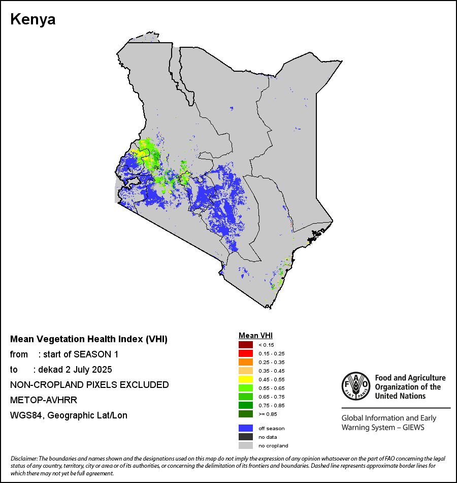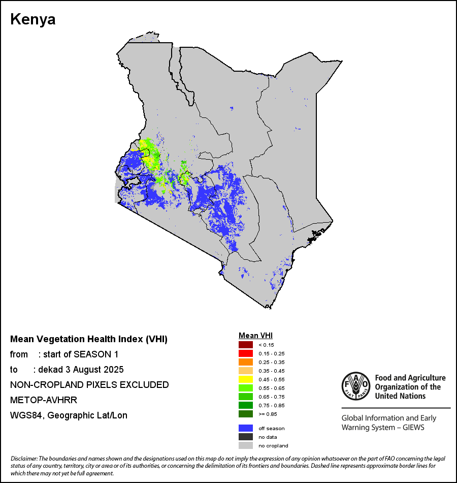 The Weighted Mean Vegetation Health Index (Weighted Mean VHI) allows the user to assess the severity of the drought from the start of the growing season, examining the vegetation health and the influence of temperature on plant conditions. The Mean VHI is an average of the dekadal VHI values over the crop growing season (from the start until the last dekad of analysis), weighted by crop coefficients (Kc), assigned to VHI values at the dekads corresponding to the Start of the Season (SOS), Maximum of the Season (MOS) and End of the Season (EOS). Crop coefficient is applied for the purpose of reflecting the crop’s water sensitivity at different phenology stages.