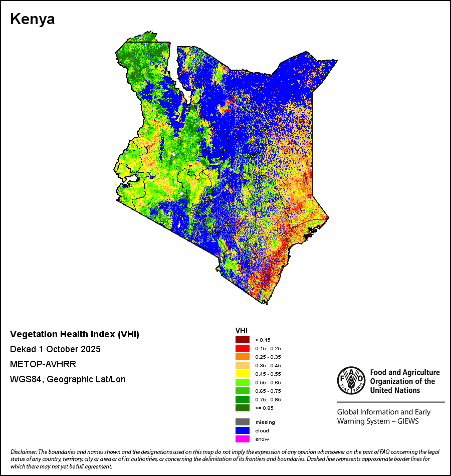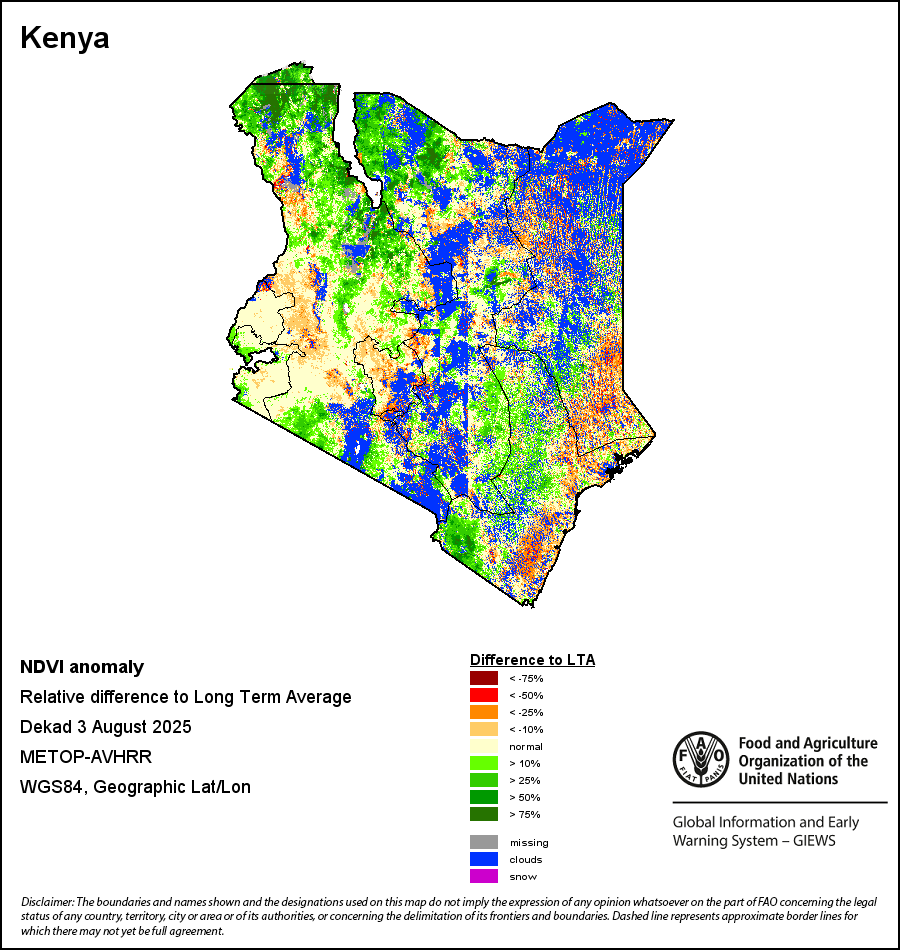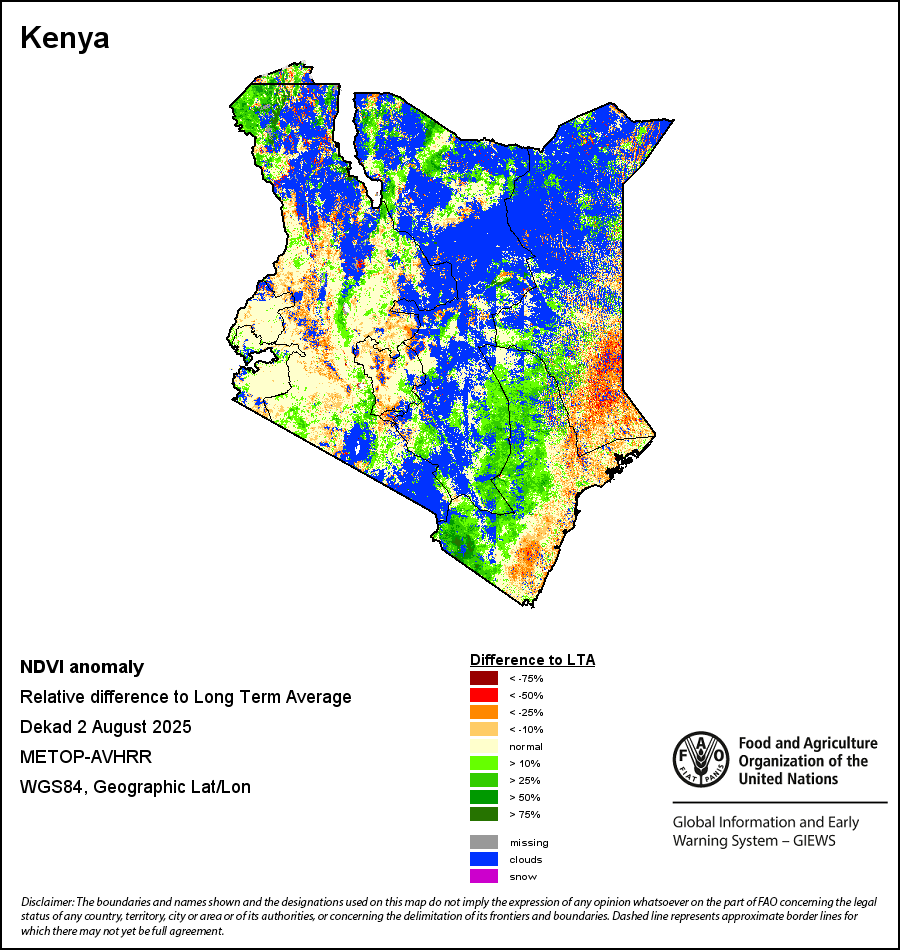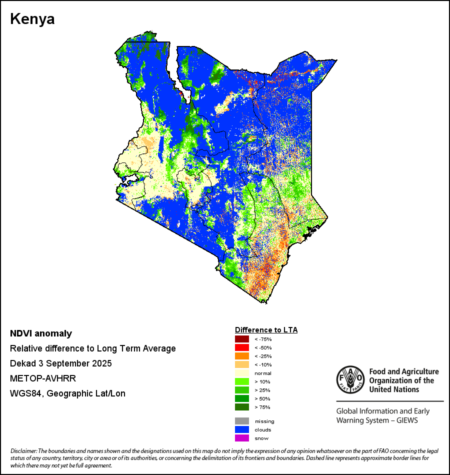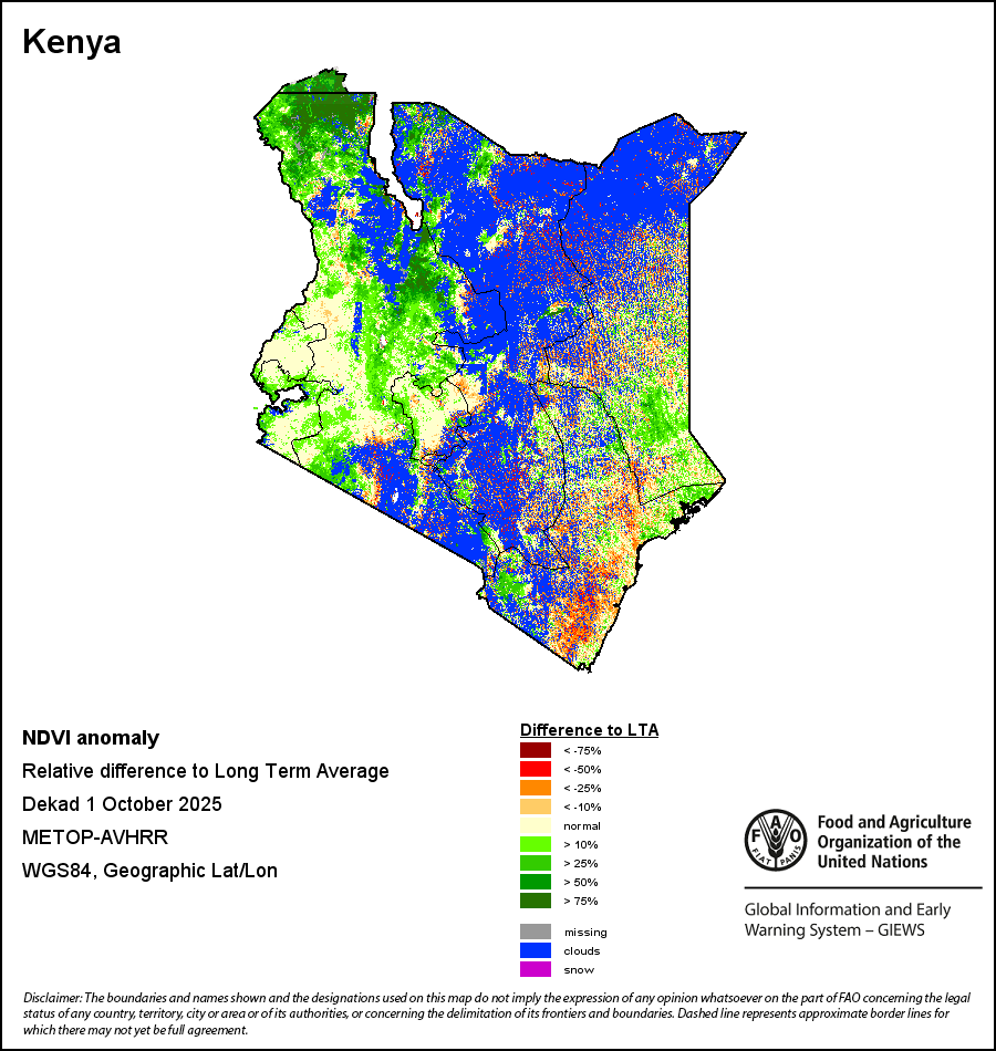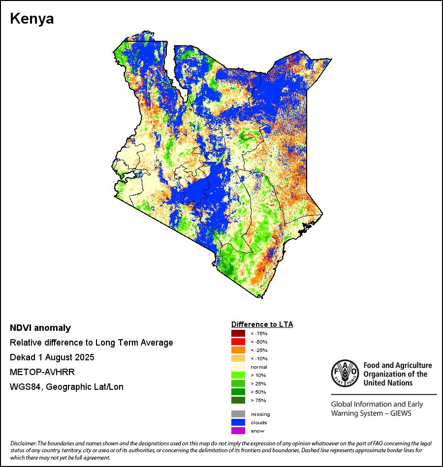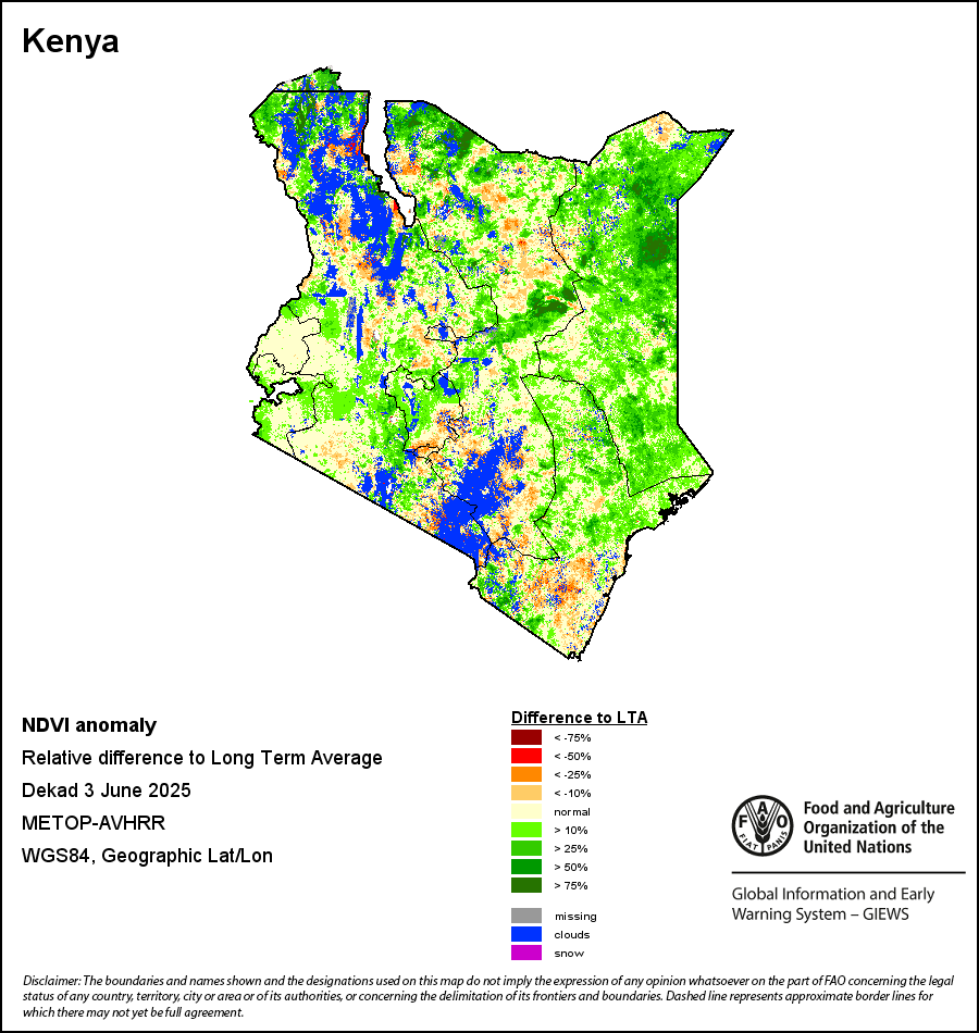 The Normalized Difference Vegetation Index (NDVI) measures the “greenness” of ground cover and is used as a proxy to indicate the density and health of vegetation. NDVI values range from +1 to -1, with high positive values corresponding to dense and healthy vegetation, and low and/or negative NDVI values indicating poor vegetation conditions or sparse vegetative cover. The NDVI anomaly indicates the variation of the current dekad to the long-term average, where a positive value (for example 20 percent) would signify enhanced vegetation conditions compared to the average, while a negative value (for instance -40 percent) would indicate comparatively poor vegetation conditions.
