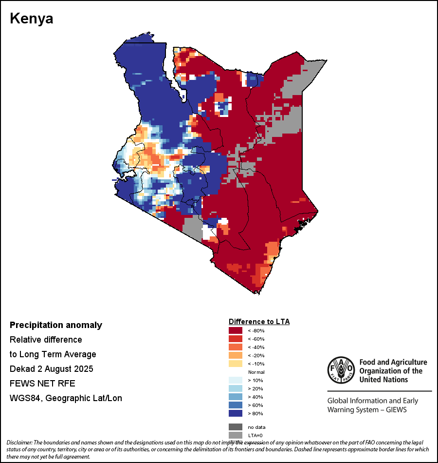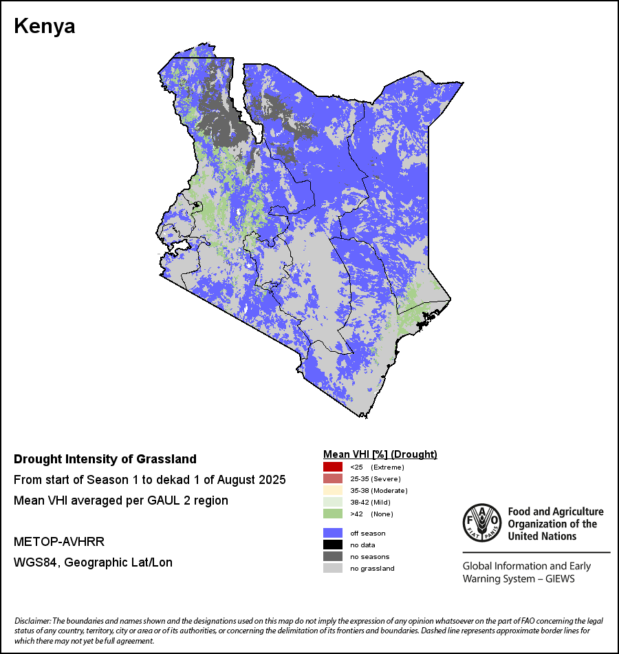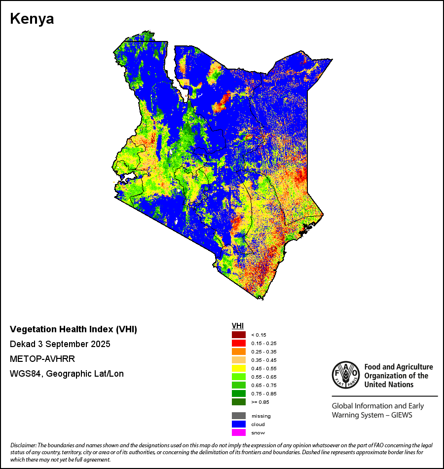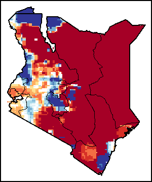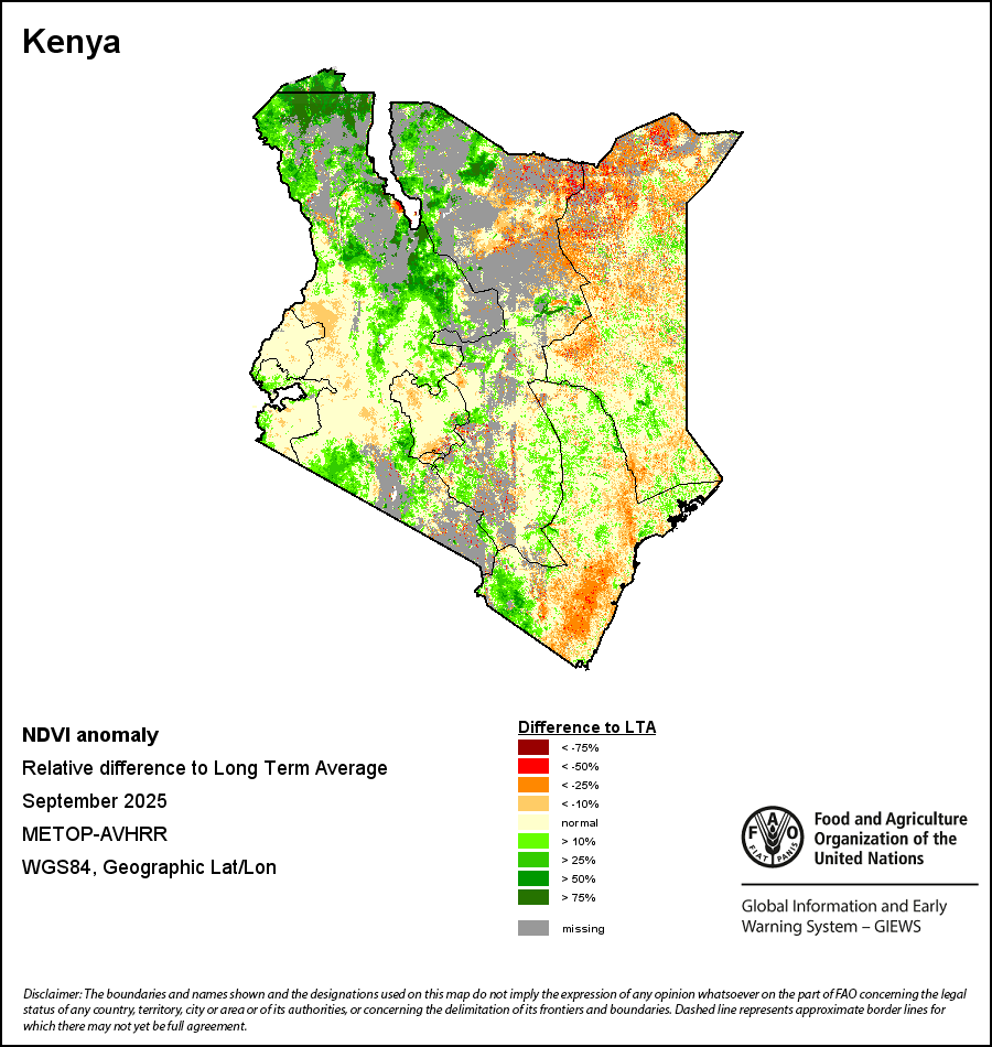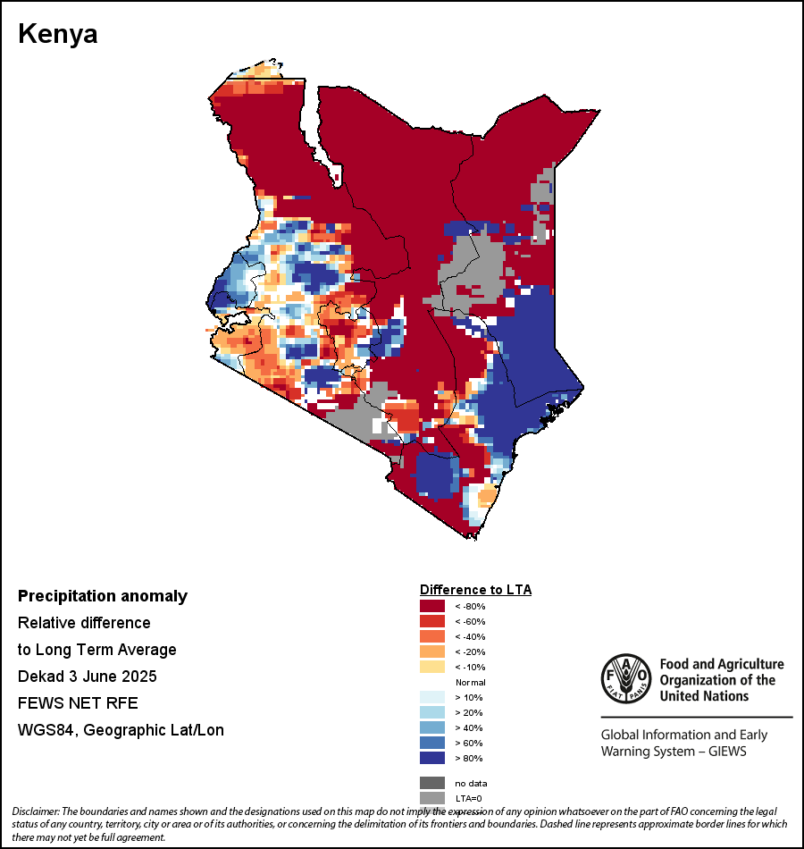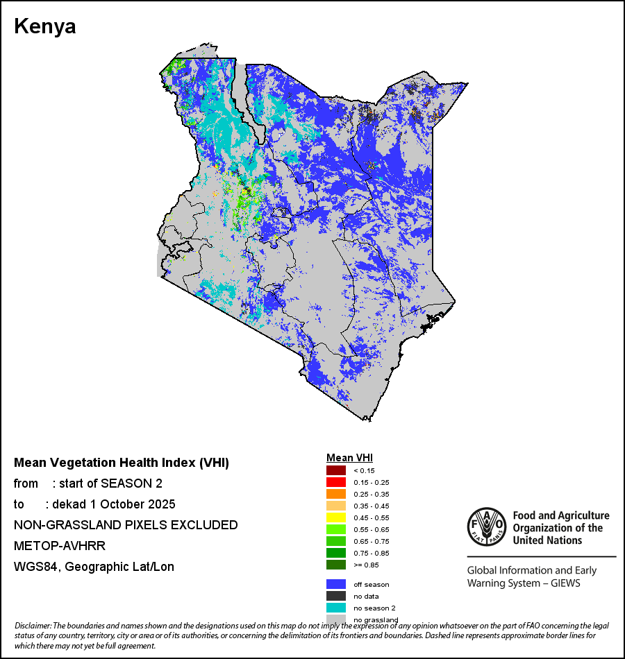 The Normalized Difference Vegetation Index (NDVI) measures the “greenness” of ground cover and is used as a proxy to indicate the density and health of vegetation. NDVI values range from +1 to -1, with high positive values corresponding to dense and healthy vegetation, and low and/or negative NDVI values indicating poor vegetation conditions or sparse vegetative cover. The NDVI anomaly indicates the variation of the current dekad to the long-term average, where a positive value (for example 20 percent) would signify enhanced vegetation conditions compared to the average, while a negative value (for instance -40 percent) would indicate comparatively poor vegetation conditions.