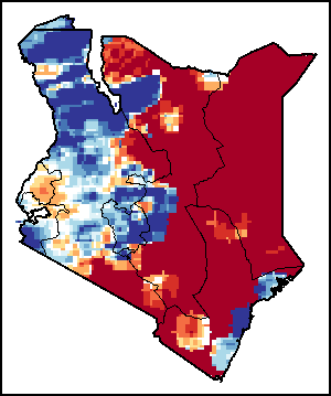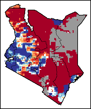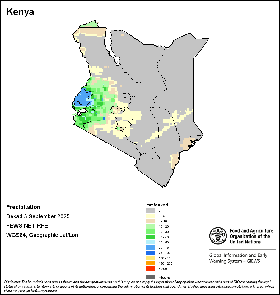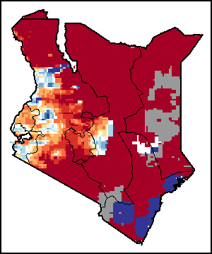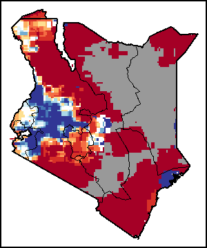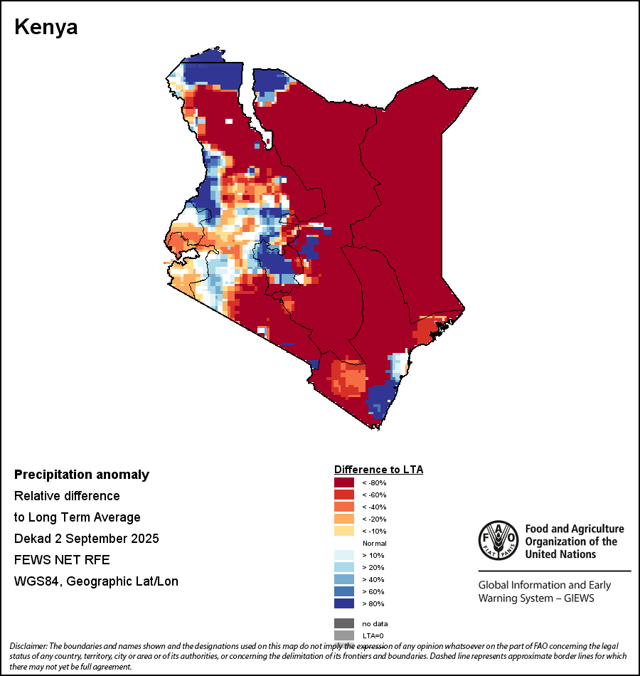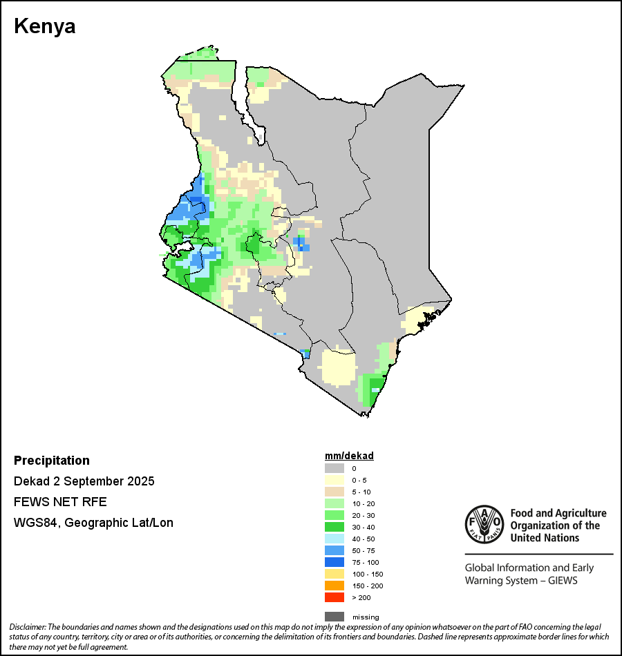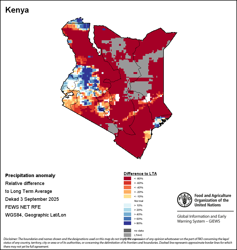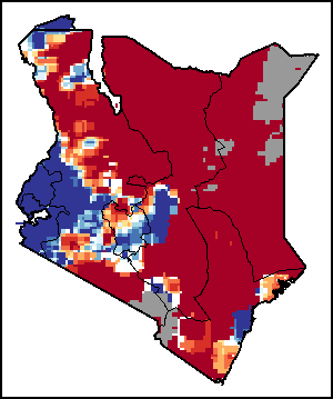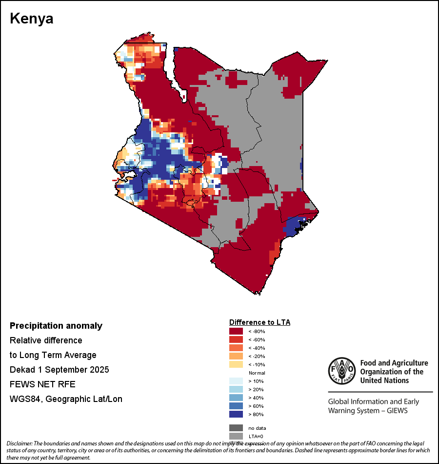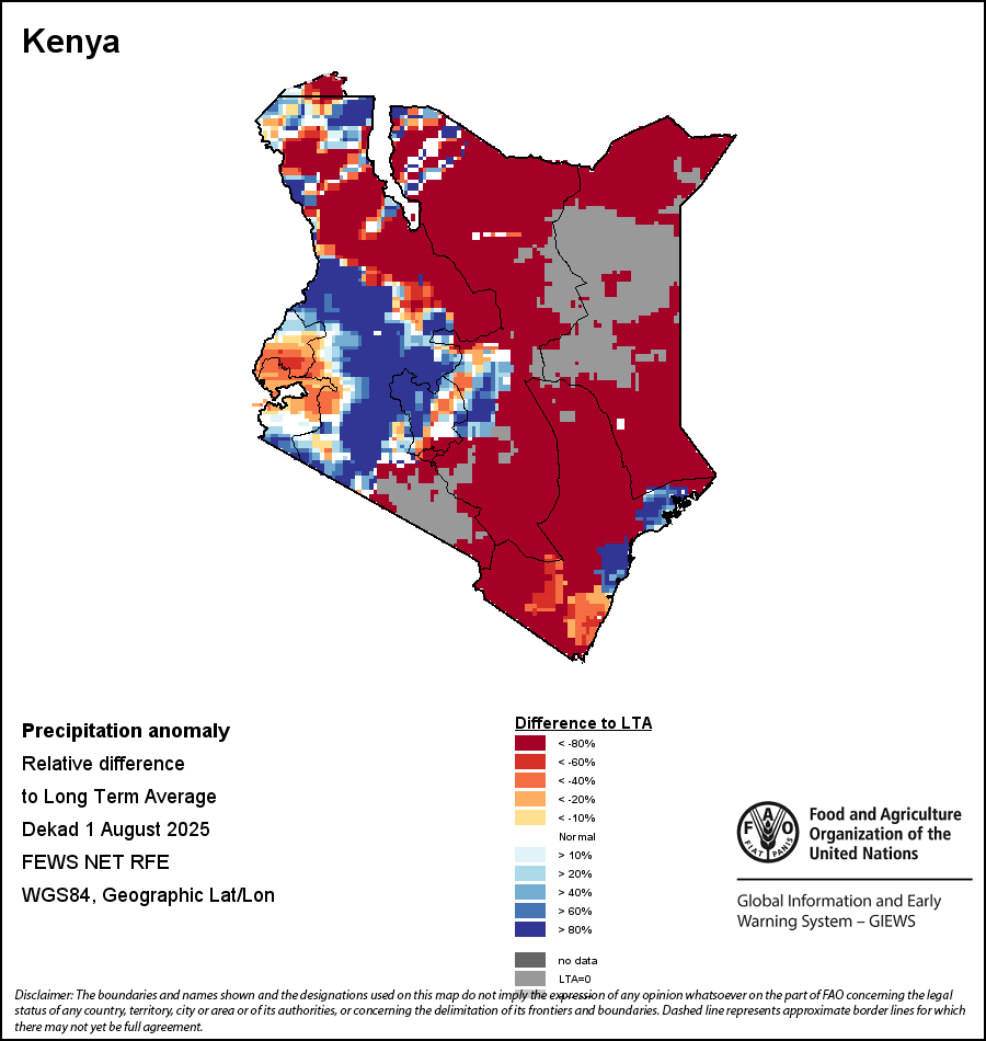 The Normalized Difference Vegetation Index (NDVI) measures the “greenness” of ground cover and is used as a proxy to indicate the density and health of vegetation. NDVI values range from +1 to -1, with high positive values corresponding to dense and healthy vegetation, and low and/or negative NDVI values indicating poor vegetation conditions or sparse vegetative cover. The NDVI anomaly indicates the variation of the current dekad to the long-term average, where a positive value (for example 20 percent) would signify enhanced vegetation conditions compared to the average, while a negative value (for instance -40 percent) would indicate comparatively poor vegetation conditions.