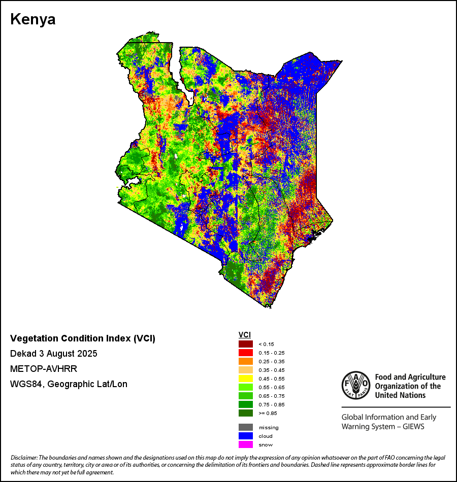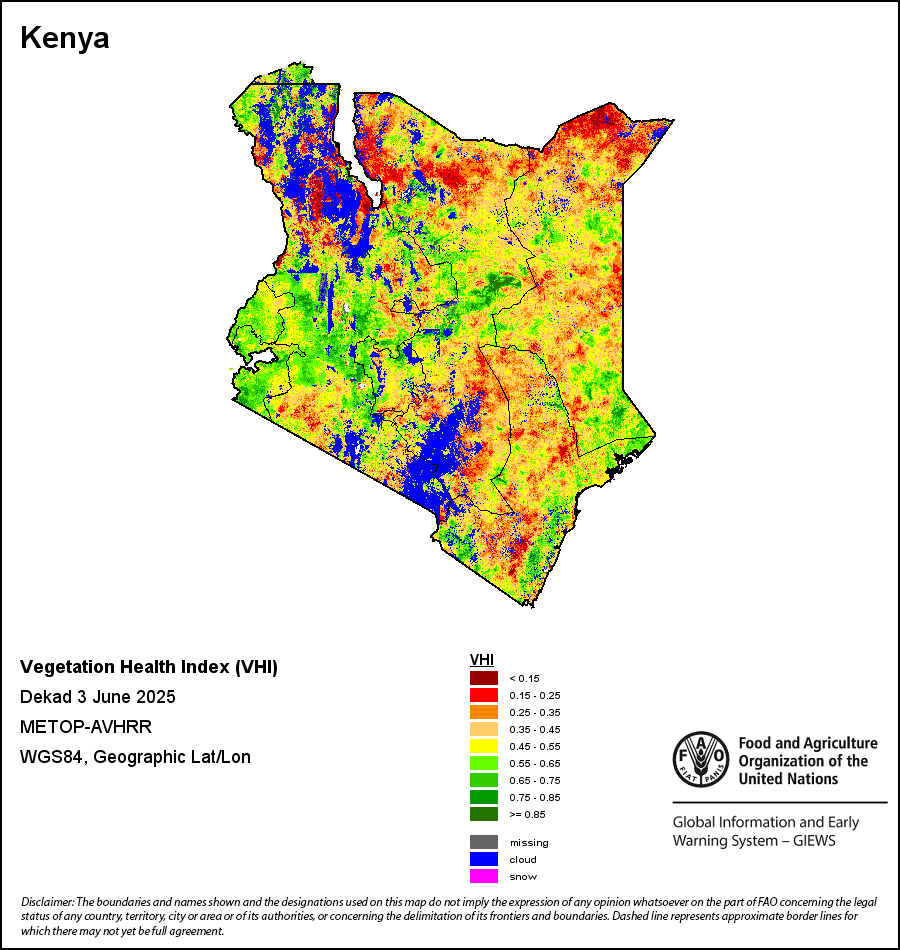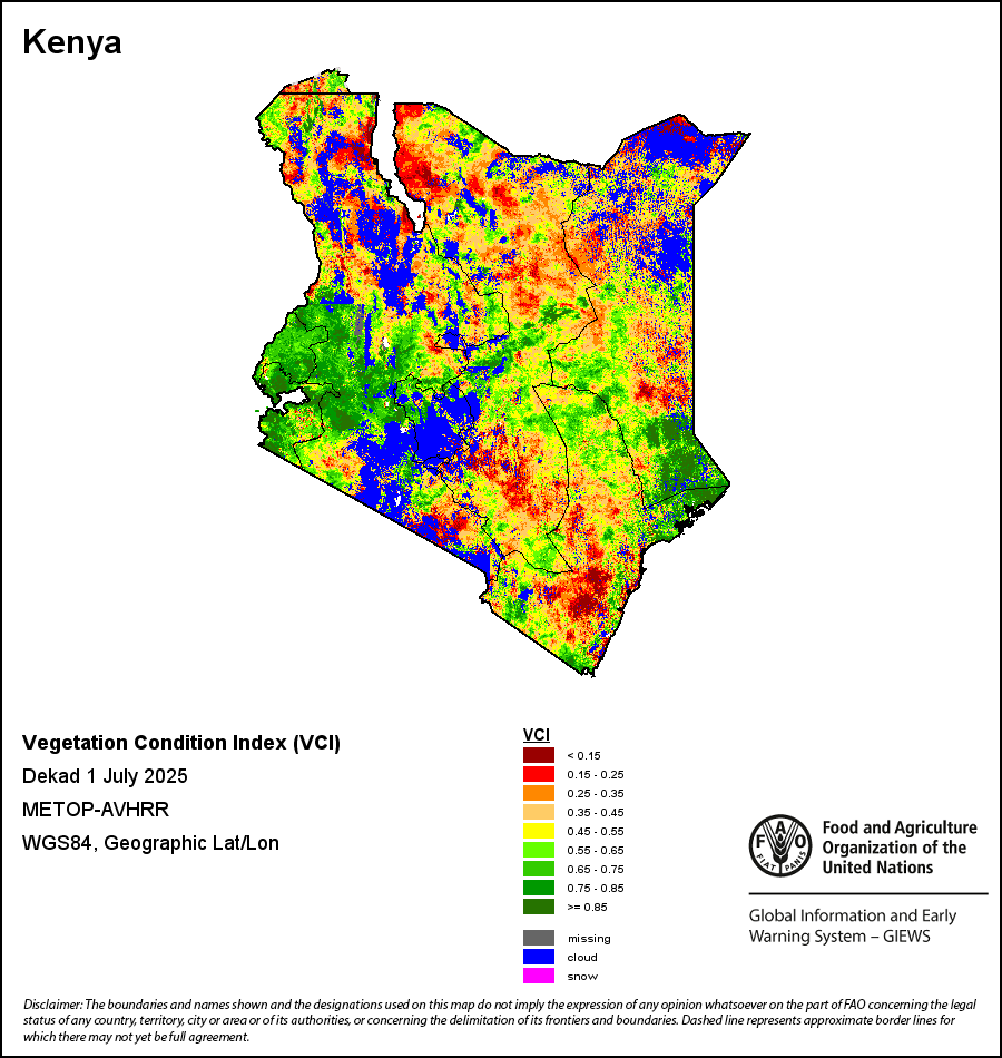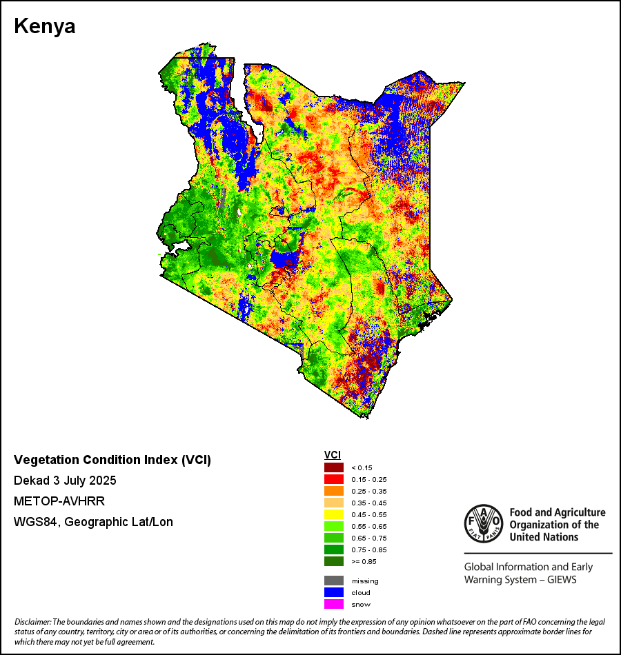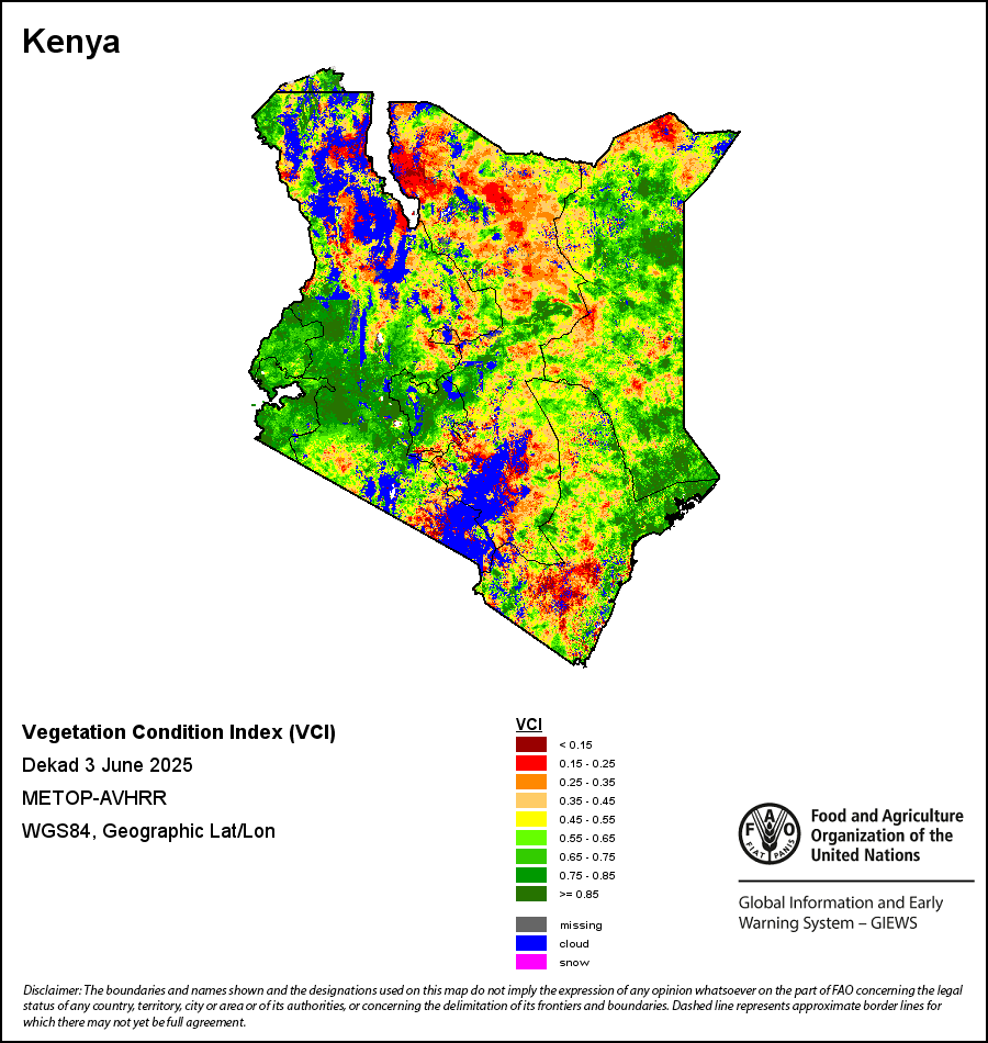 The Vegetation Condition Index (VCI) evaluates the current vegetation health in comparison to the historical trends. The VCI relates current dekadal Normalized Difference Vegetation Index (NDVI) to its long-term minimum and maximum, normalized by the historical range of NDVI values for the same dekad. The VCI was designed to separate the weather-related component of the NDVI from the ecological element.