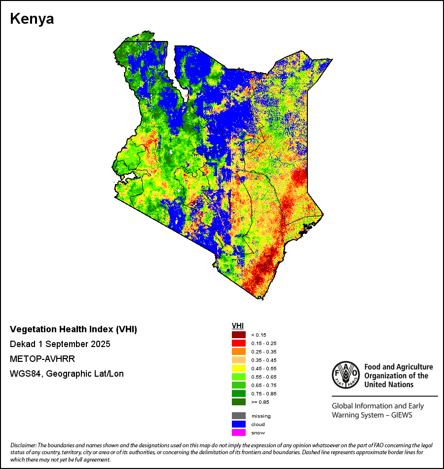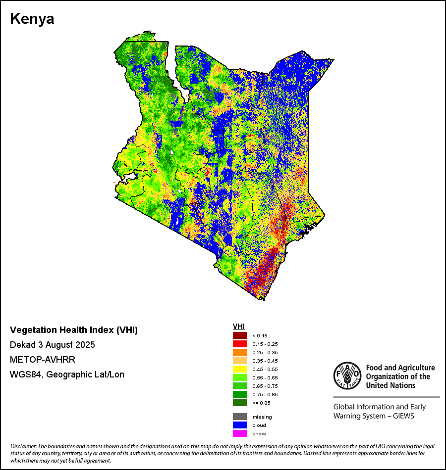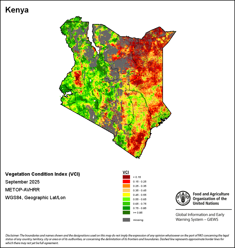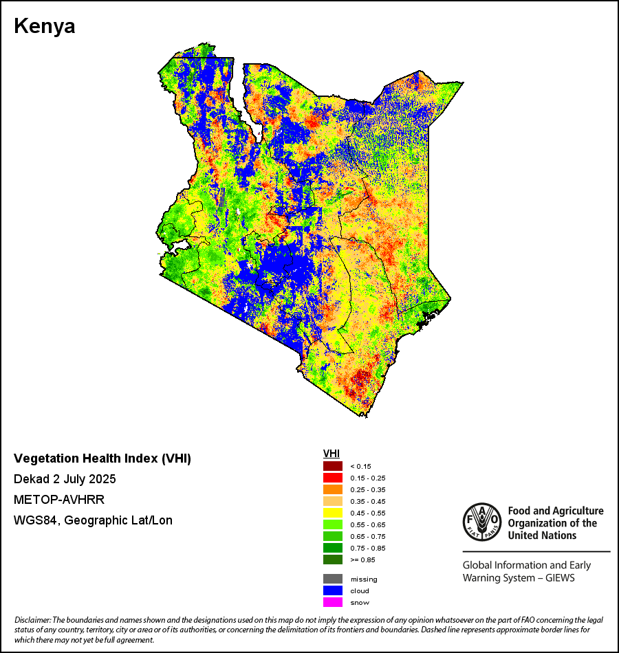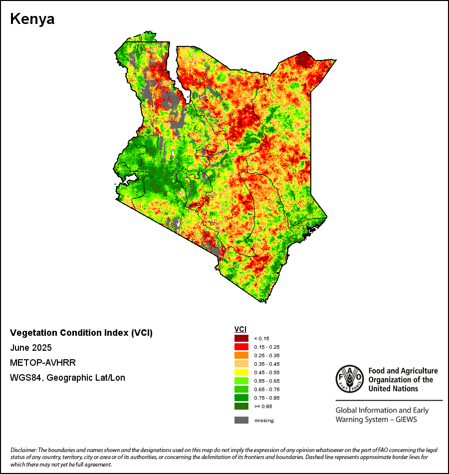 The Vegetation Condition Index (VCI) evaluates the current vegetation health in comparison to the historical trends. The VCI relates current dekadal Normalized Difference Vegetation Index (NDVI) to its long-term minimum and maximum, normalized by the historical range of NDVI values for the same dekad. The VCI was designed to separate the weather-related component of the NDVI from the ecological element.