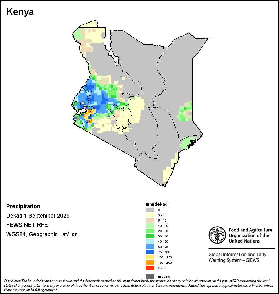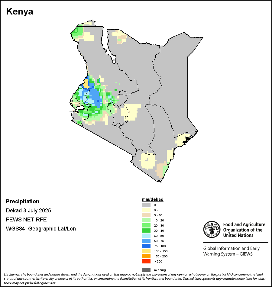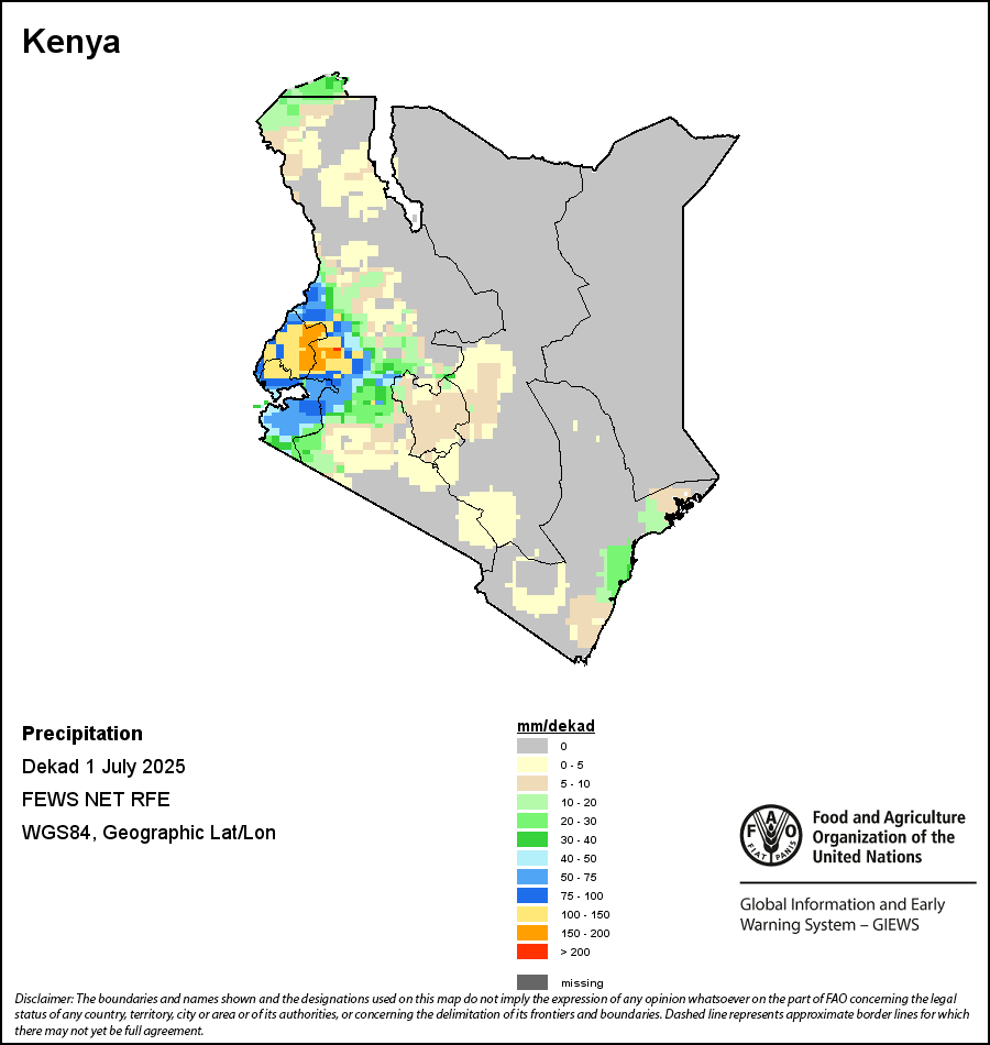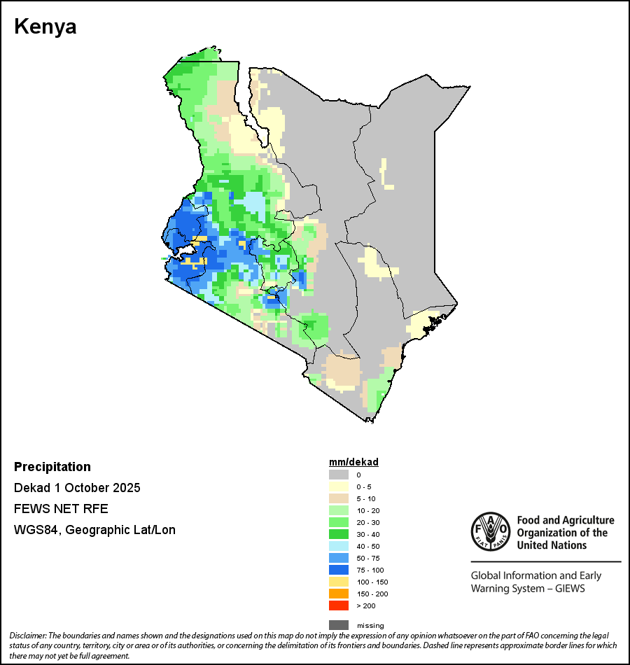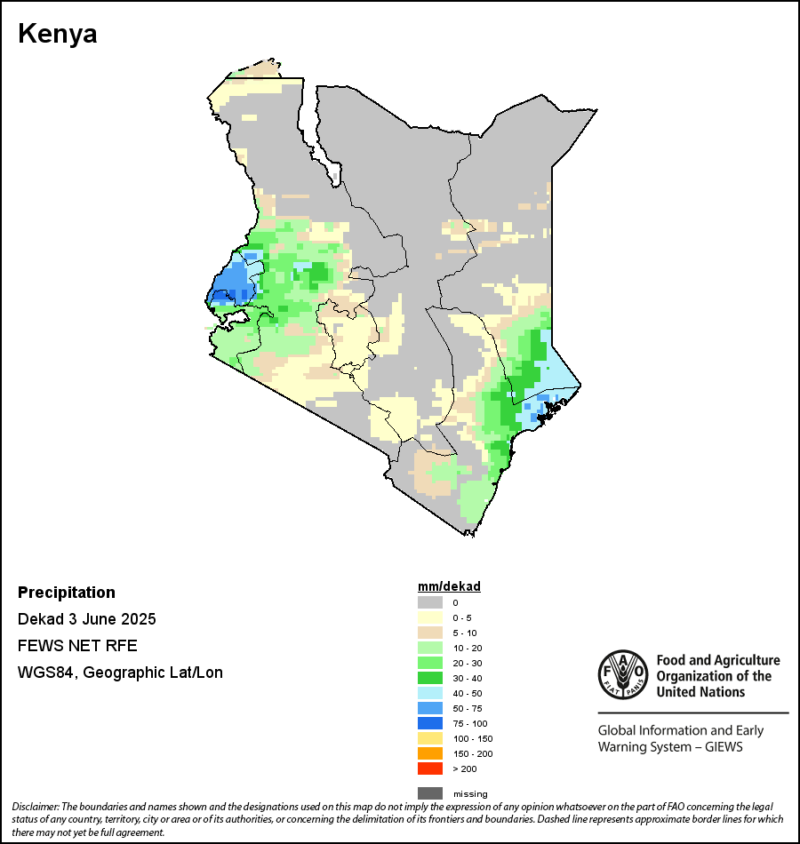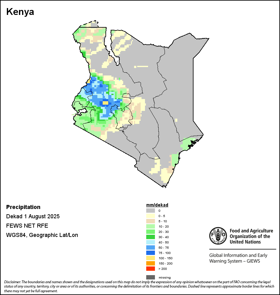The map depicts cumulative rainfall volumes over a dekad (a 10-day period). Precipitation estimates for all African countries (except Cabo Verde and Mauritius) are taken from NOAA/FEWSNet, while for the remaining countries data is obtained from ECMWF.