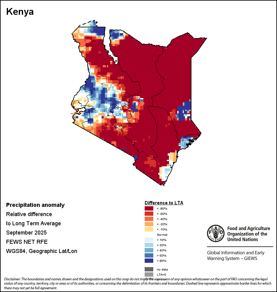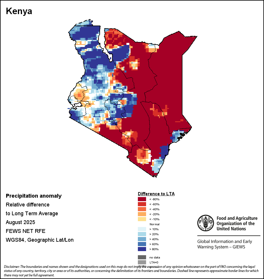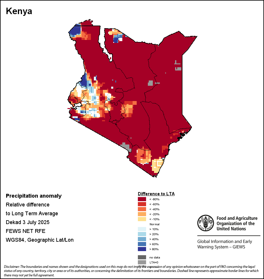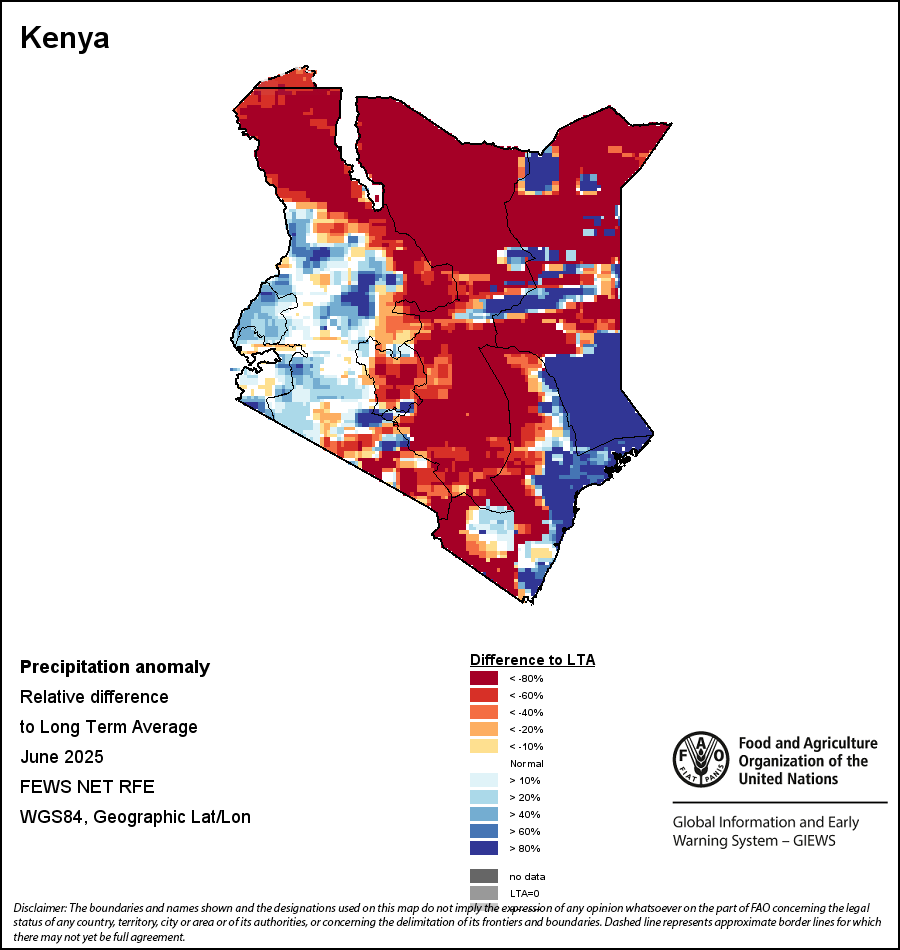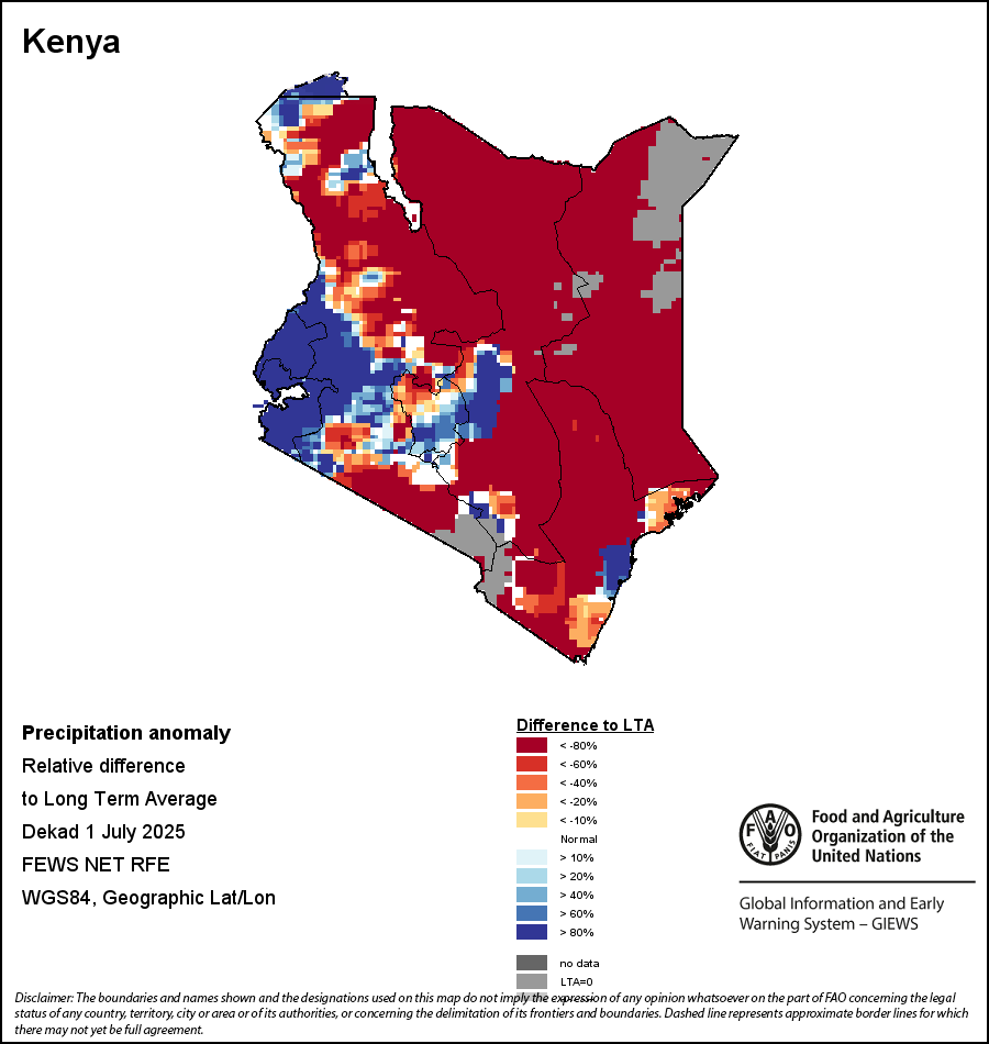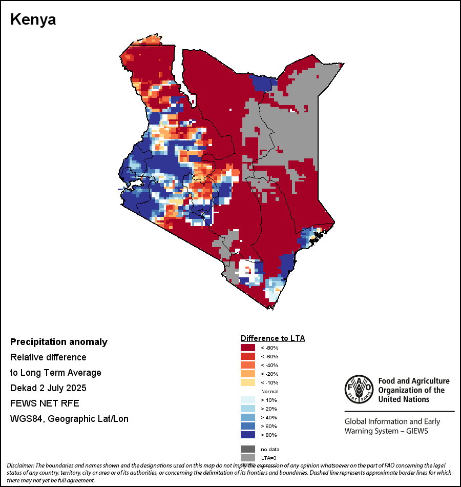 The map illustrates the difference between the current rainfall volume and the average level. Rainfall levels are compared with the Long-Term Average (LTA), which refers to the period 1989-2015. Warmer colours identify areas which have received lower-than-average rainfall, while colder colours are given to areas where precipitation has been above average.