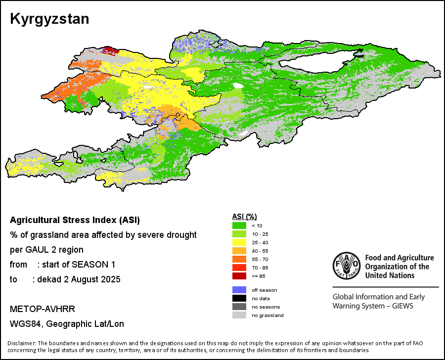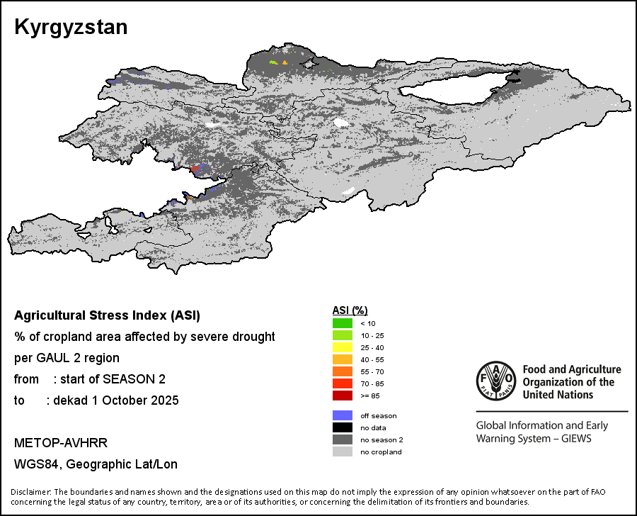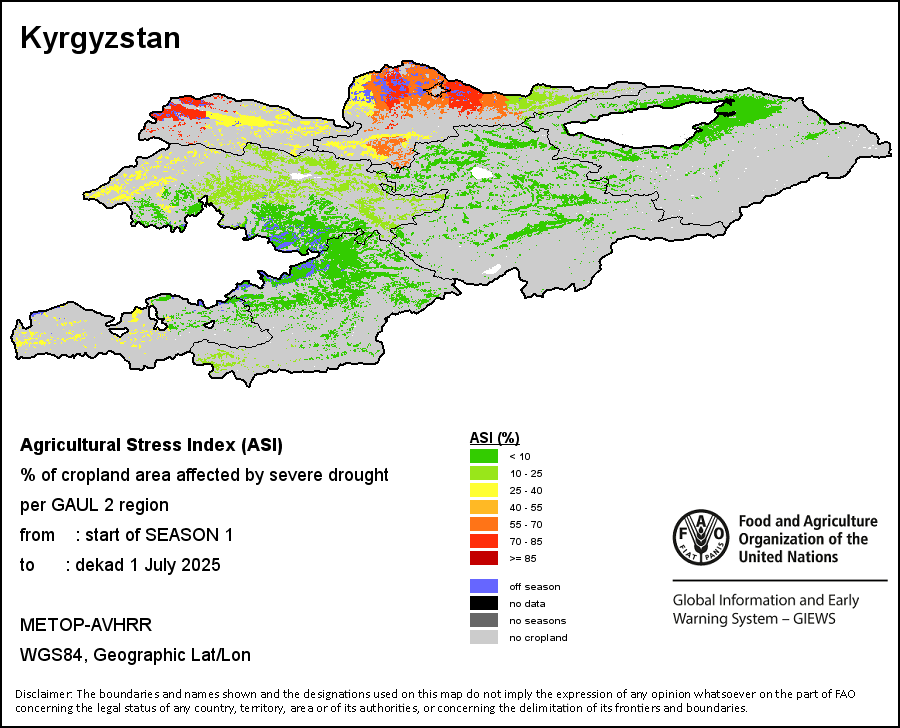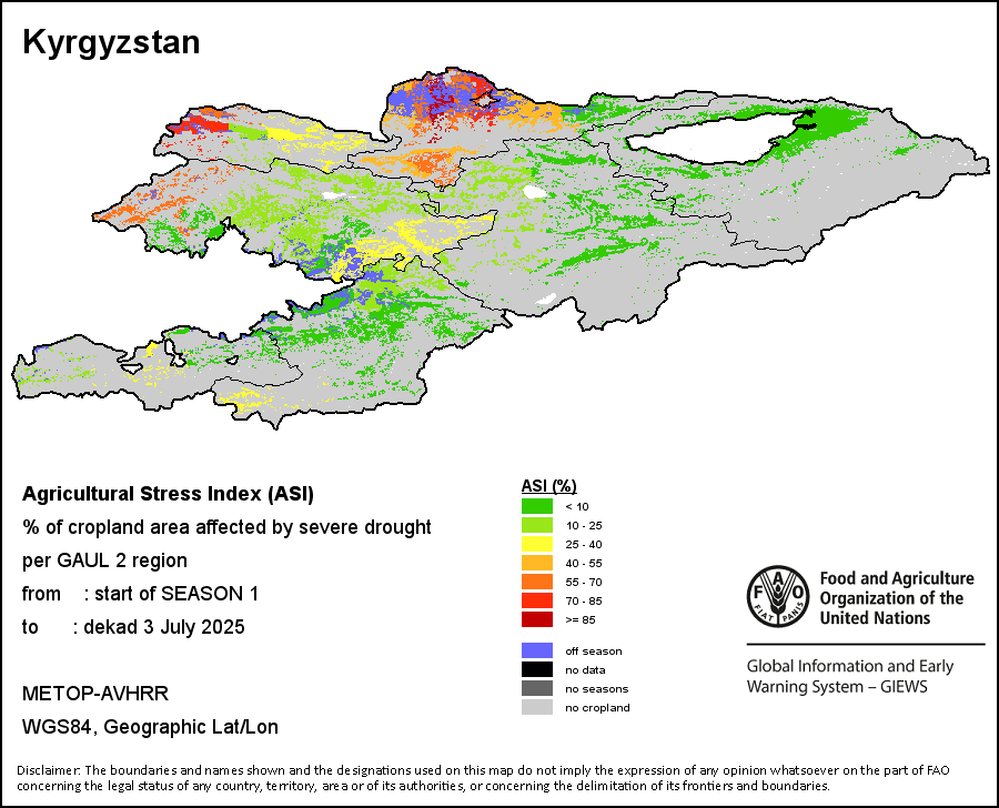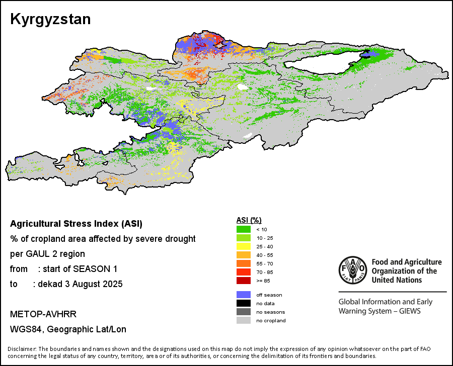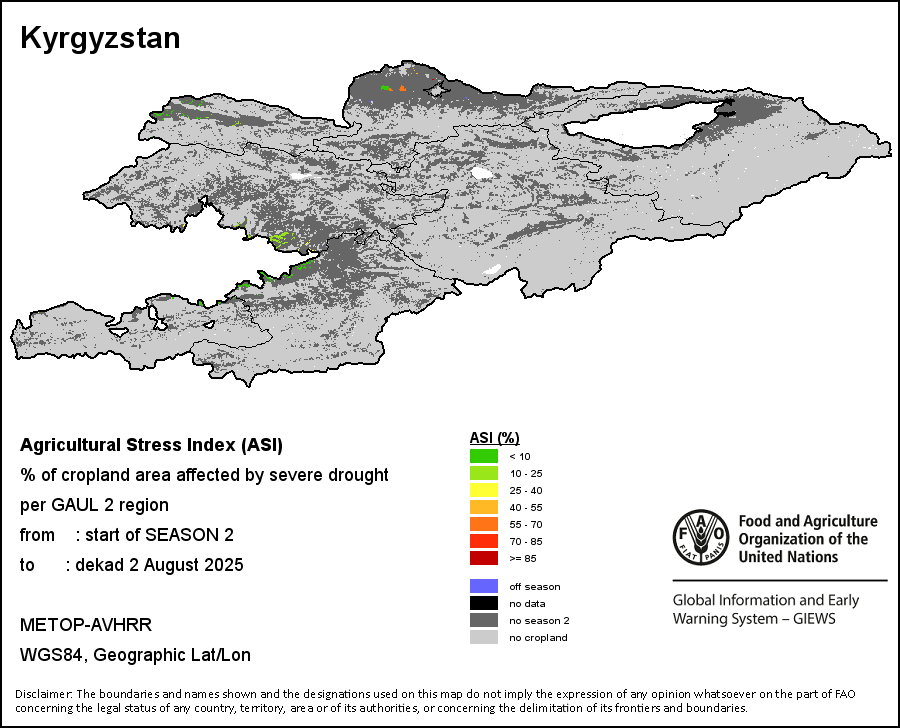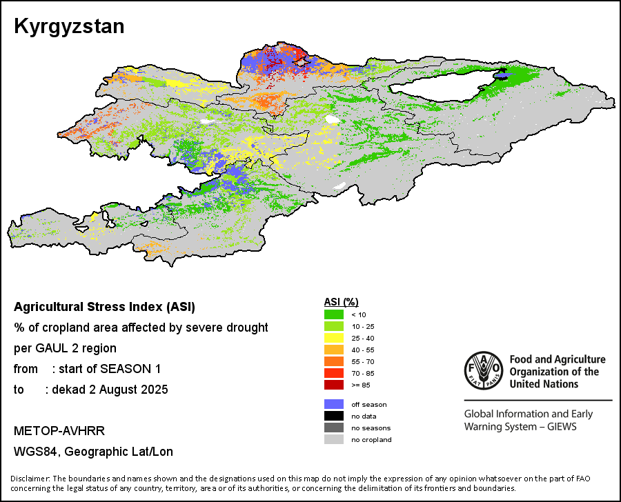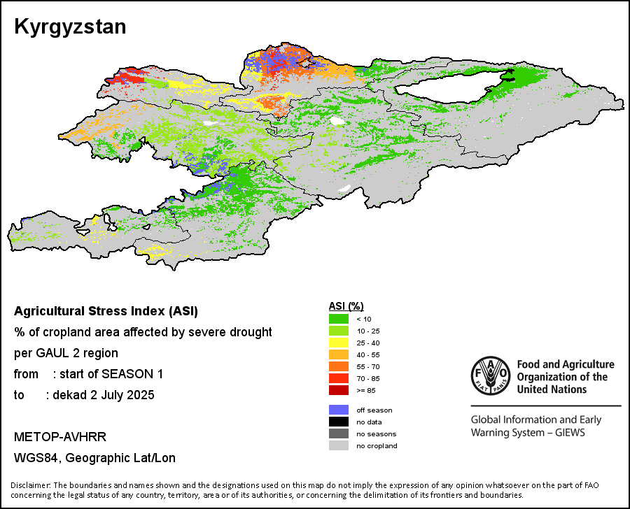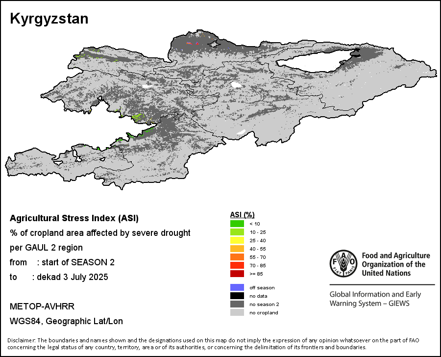 The Agricultural Stress Index (ASI) is a quick-look indicator that facilitates the early identification of cropped land with a high likelihood of water stress (drought). The Index is based on the integration of the Vegetation Health Index (VHI) in two dimensions that are critical in the assessment of a drought event in agriculture: temporal and spatial. The first step of the ASI calculation is a temporal averaging of the VHI, assessing the intensity and duration of dry periods occurring during the crop cycle at the pixel level; this calculation includes the use of crop coefficients, which introduces sensitivity of a crop to water stress during each phenological phase. The second step determines the spatial extent of drought events by calculating the percentage of pixels in arable areas with a VHI value below 35 percent (this value was identified as a critical threshold in assessing the extent of drought in previous research by Kogan, 1995). Each administrative area is classified according to the percentage of the affected area to facilitate the quick interpretation of results.