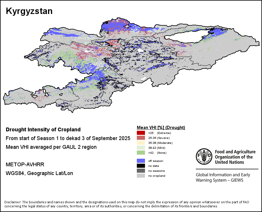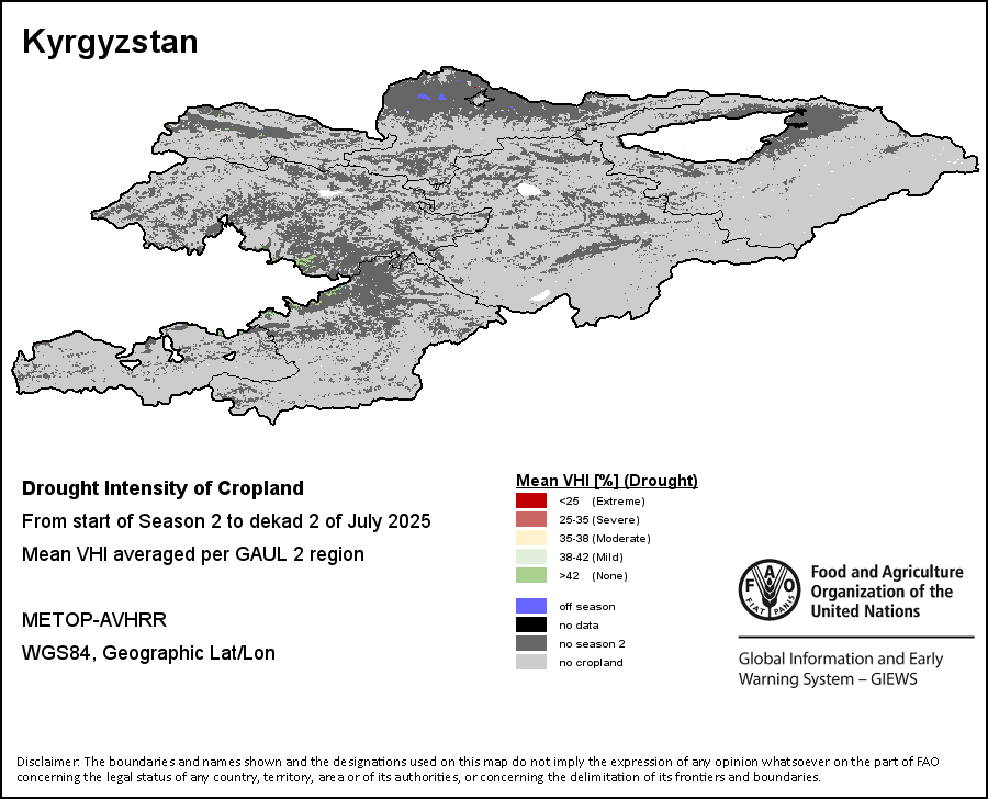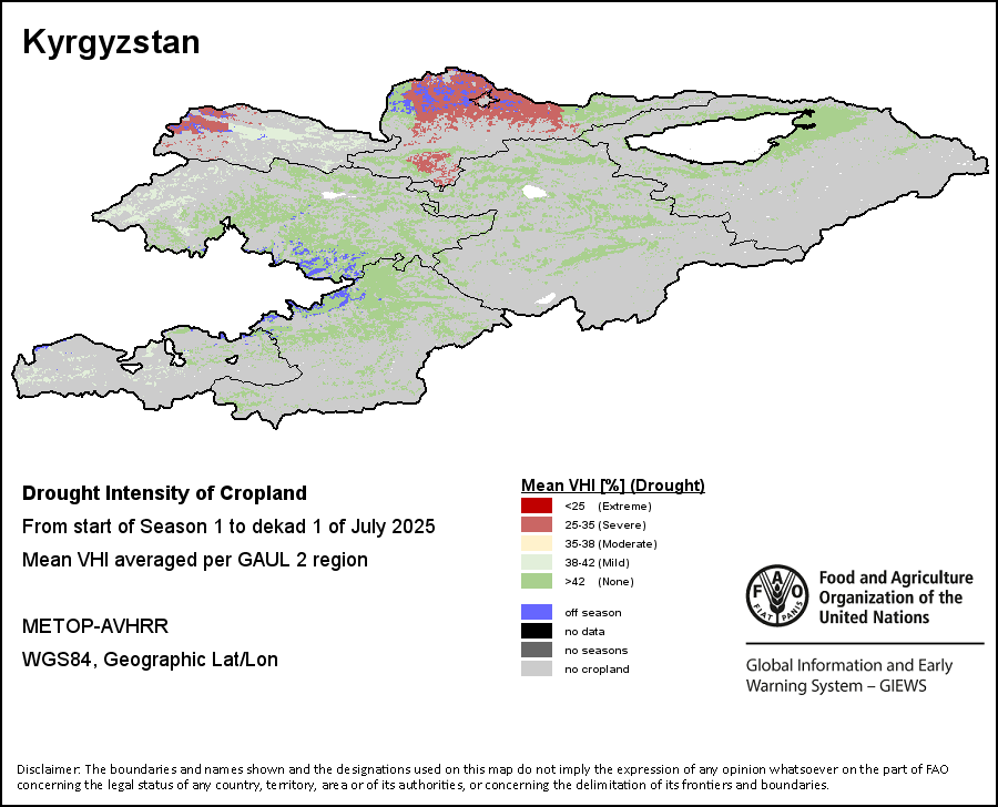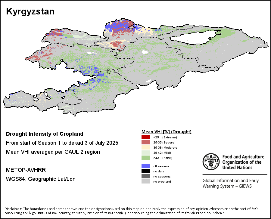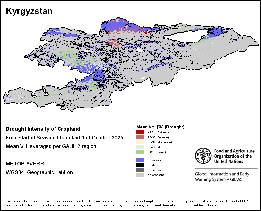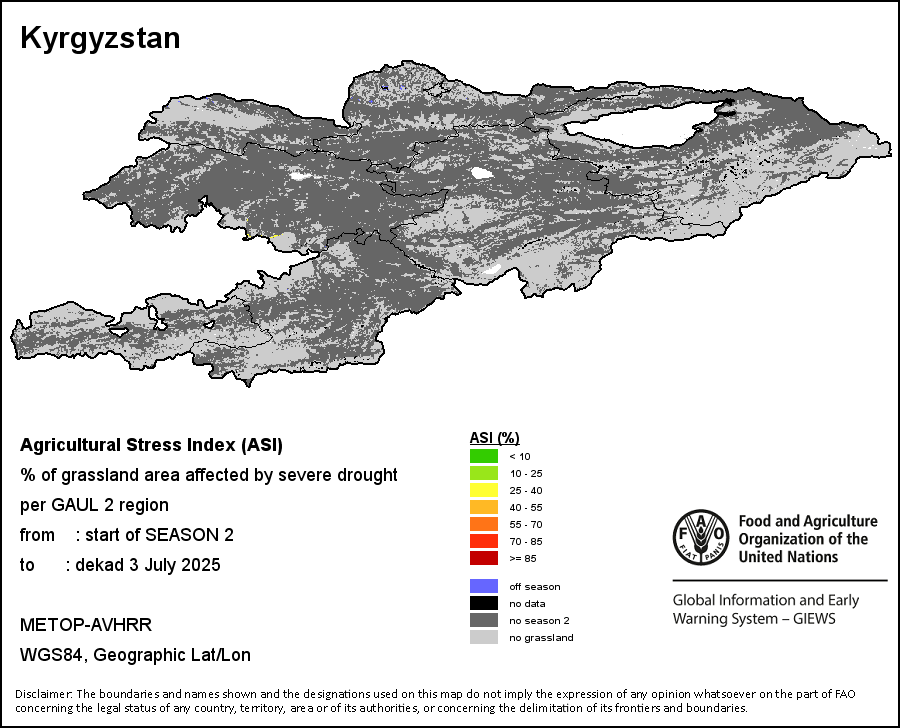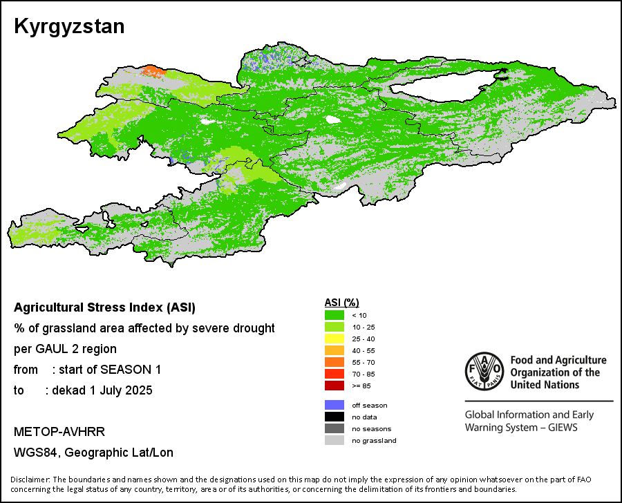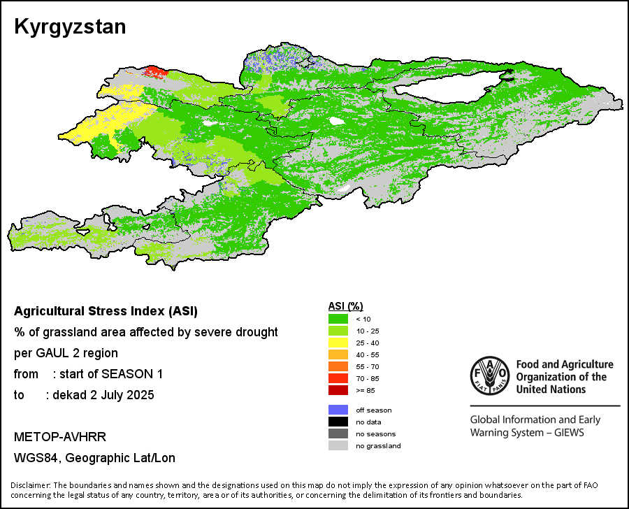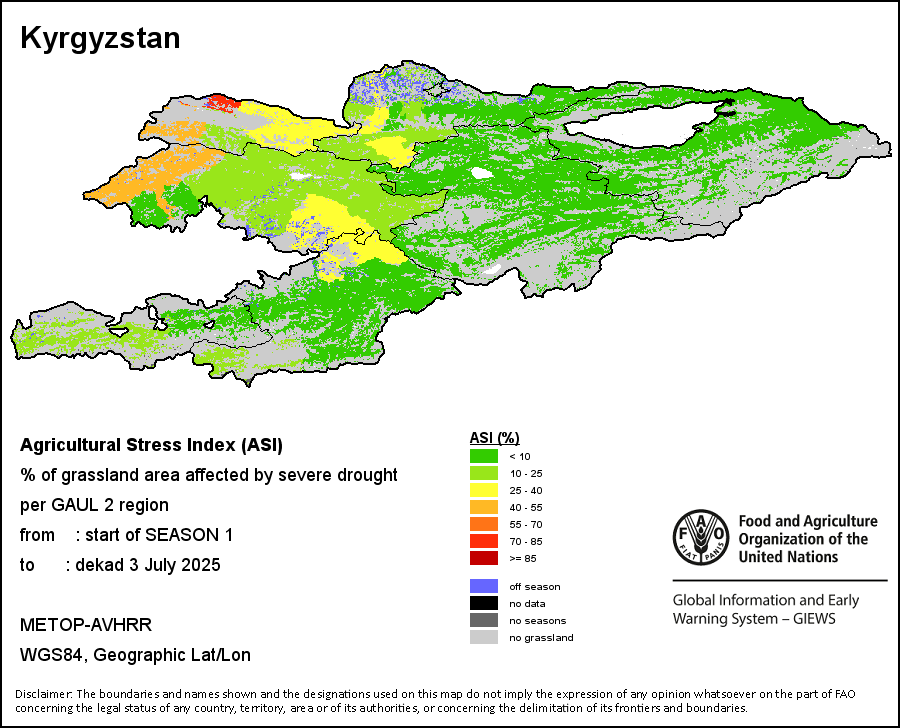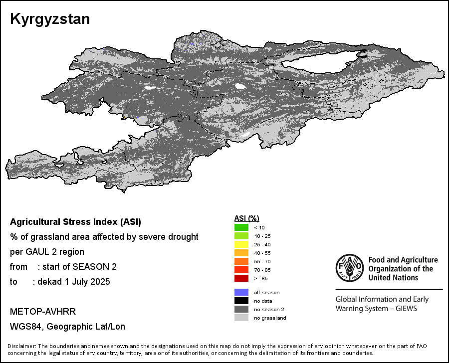 The Agricultural Stress Index (ASI) is a quick-look indicator that facilitates the early identification of cropped land with a high likelihood of water stress (drought). The Index is based on the integration of the Vegetation Health Index (VHI) in two dimensions that are critical in the assessment of a drought event in agriculture: temporal and spatial. The first step of the ASI calculation is a temporal averaging of the VHI, assessing the intensity and duration of dry periods occurring during the crop cycle at the pixel level; this calculation includes the use of crop coefficients, which introduces sensitivity of a crop to water stress during each phenological phase. The second step determines the spatial extent of drought events by calculating the percentage of pixels in arable areas with a VHI value below 35 percent (this value was identified as a critical threshold in assessing the extent of drought in previous research by Kogan, 1995). Each administrative area is classified according to the percentage of the affected area to facilitate the quick interpretation of results.