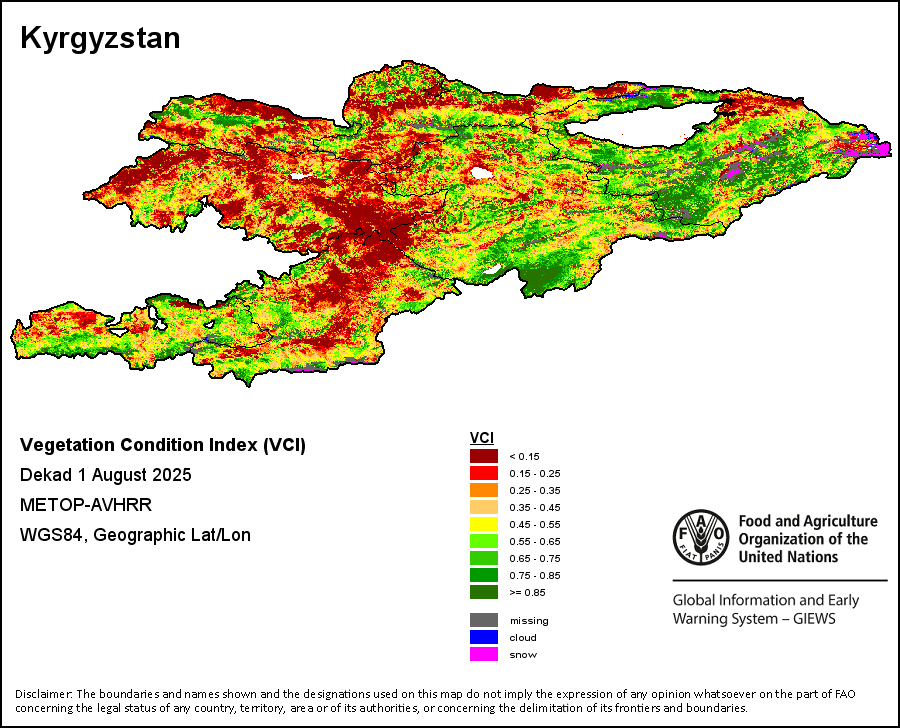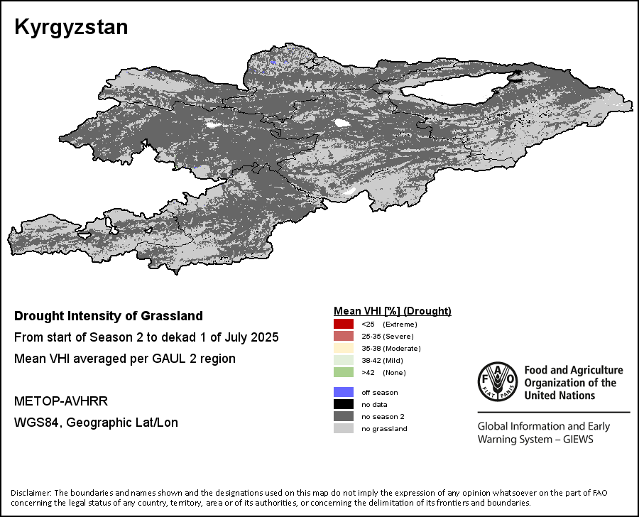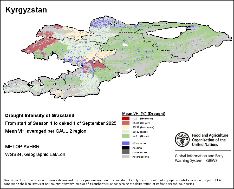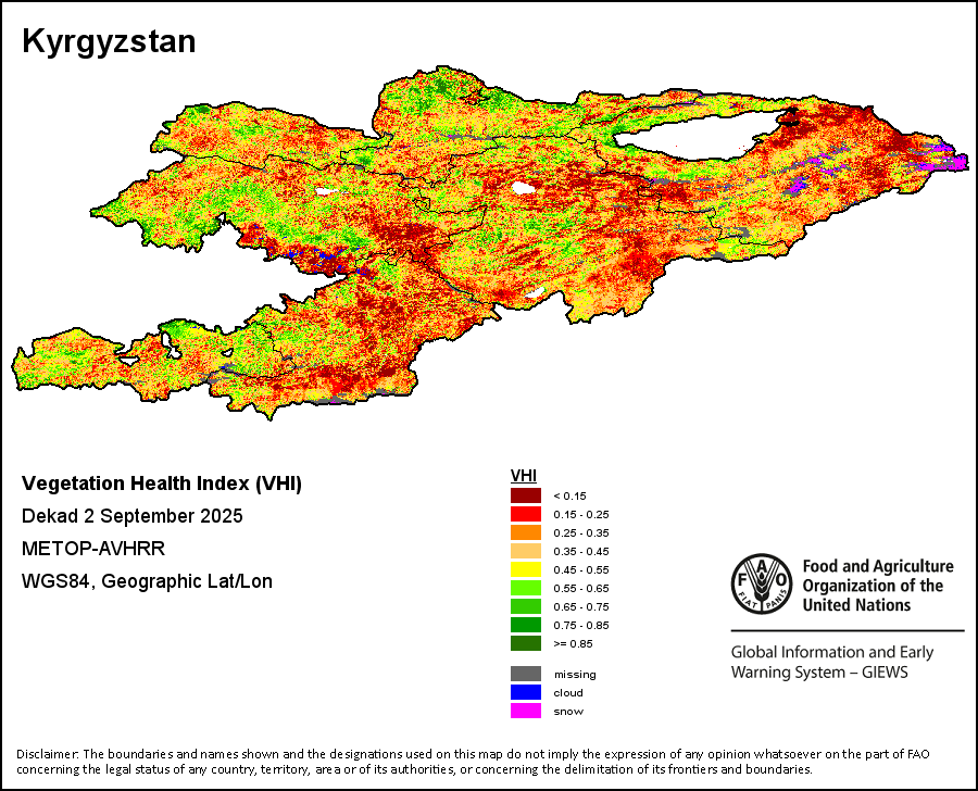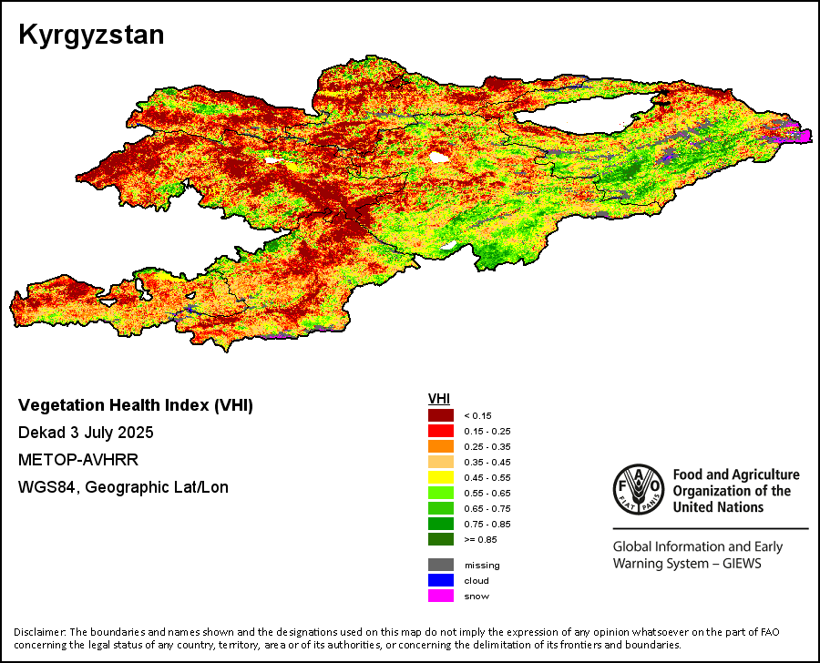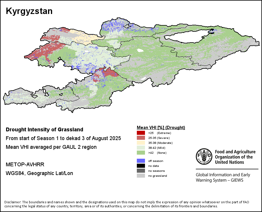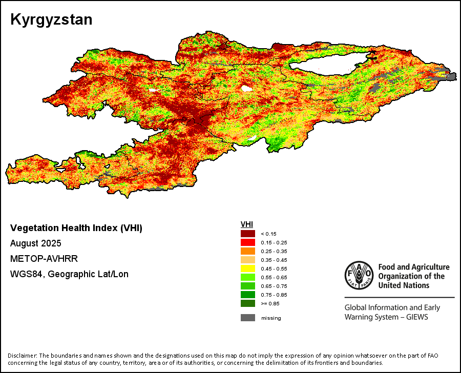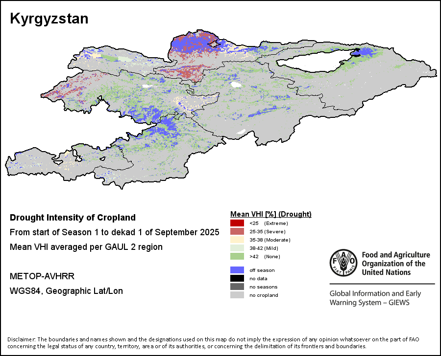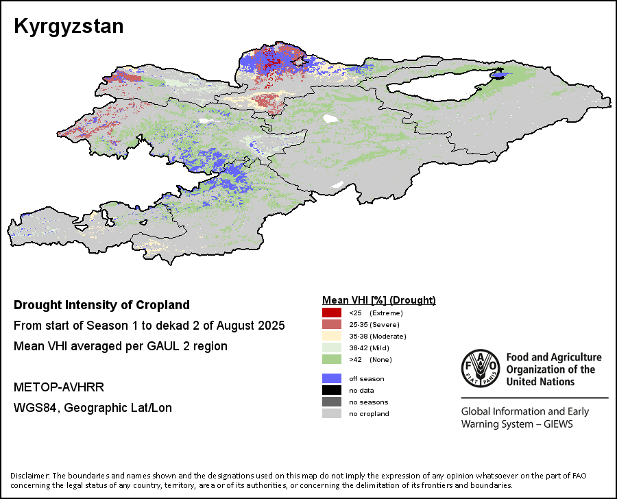 The Agricultural Stress Index (ASI) is a quick-look indicator that facilitates the early identification of cropped land with a high likelihood of water stress (drought). The Index is based on the integration of the Vegetation Health Index (VHI) in two dimensions that are critical in the assessment of a drought event in agriculture: temporal and spatial. The first step of the ASI calculation is a temporal averaging of the VHI, assessing the intensity and duration of dry periods occurring during the crop cycle at the pixel level; this calculation includes the use of crop coefficients, which introduces sensitivity of a crop to water stress during each phenological phase. The second step determines the spatial extent of drought events by calculating the percentage of pixels in arable areas with a VHI value below 35 percent (this value was identified as a critical threshold in assessing the extent of drought in previous research by Kogan, 1995). Each administrative area is classified according to the percentage of the affected area to facilitate the quick interpretation of results.