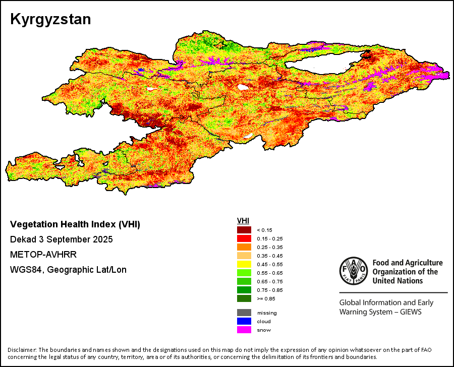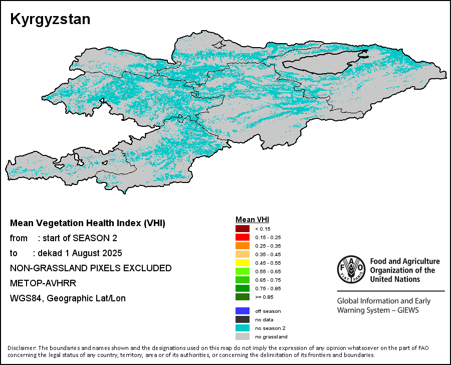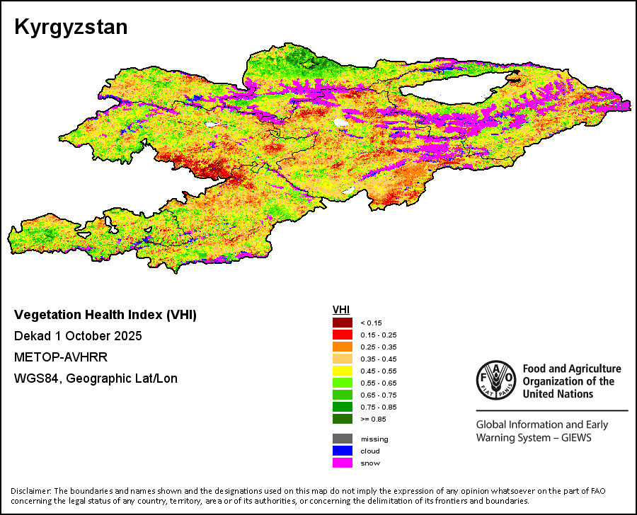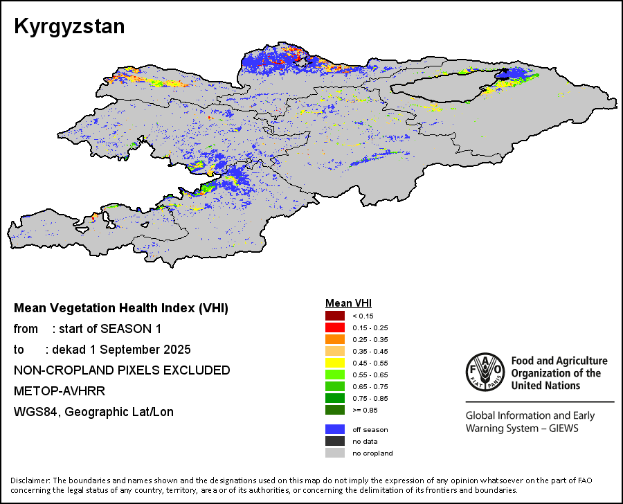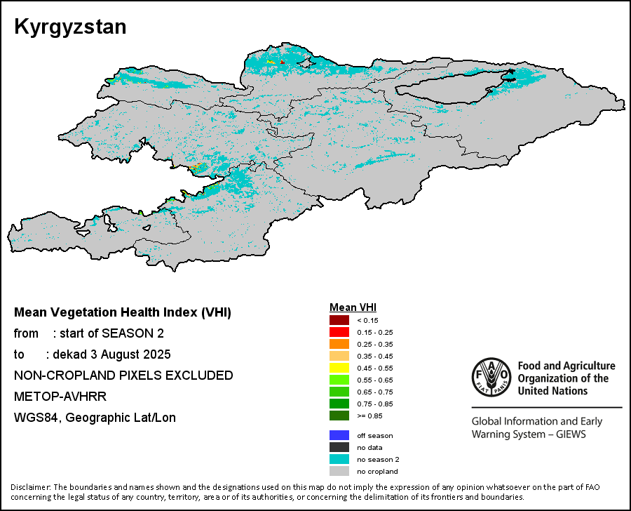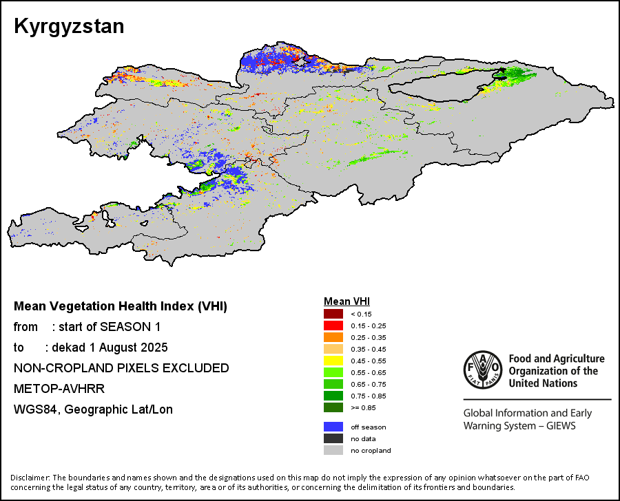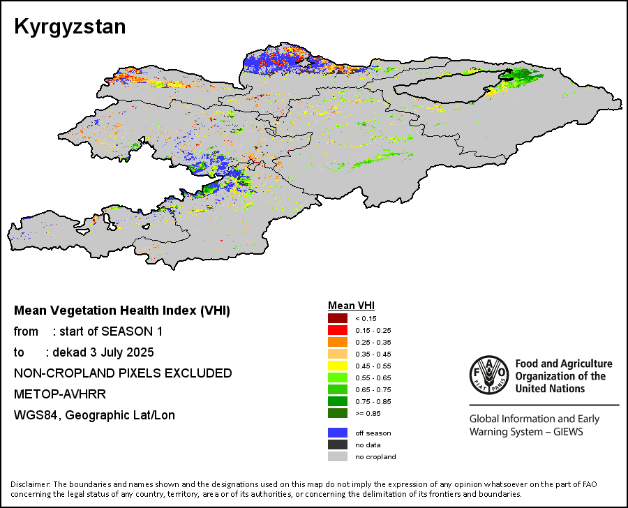 The Weighted Mean Vegetation Health Index (Weighted Mean VHI) allows the user to assess the severity of the drought from the start of the growing season, examining the vegetation health and the influence of temperature on plant conditions. The Mean VHI is an average of the dekadal VHI values over the crop growing season (from the start until the last dekad of analysis), weighted by crop coefficients (Kc), assigned to VHI values at the dekads corresponding to the Start of the Season (SOS), Maximum of the Season (MOS) and End of the Season (EOS). Crop coefficient is applied for the purpose of reflecting the crop’s water sensitivity at different phenology stages.