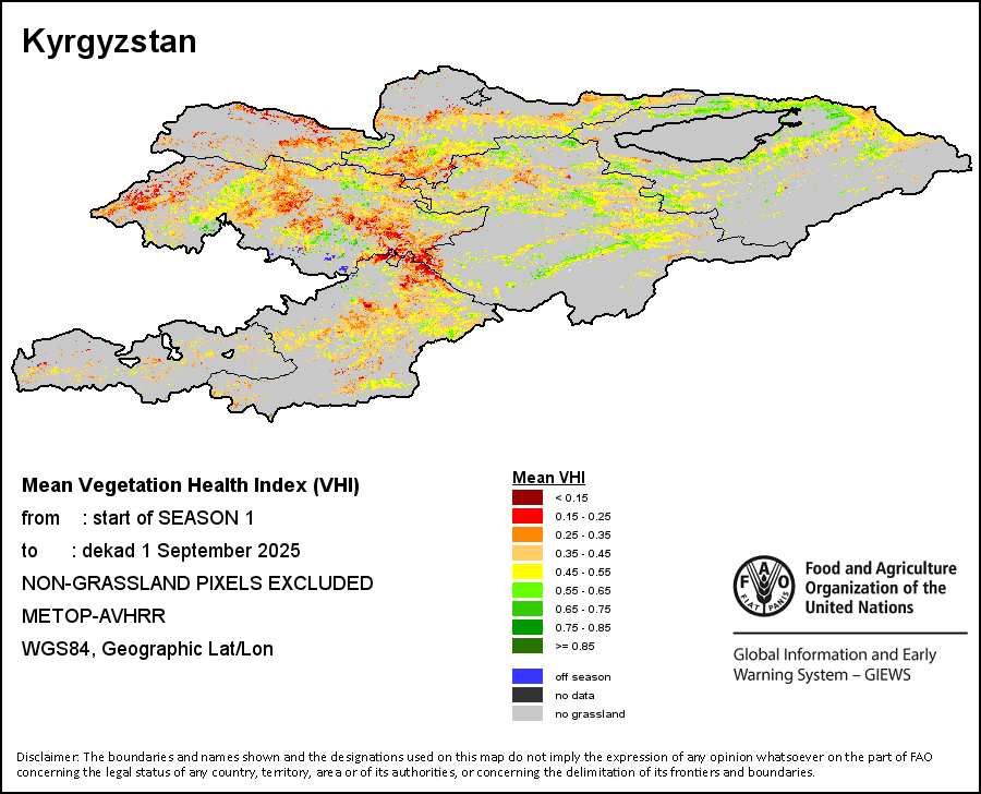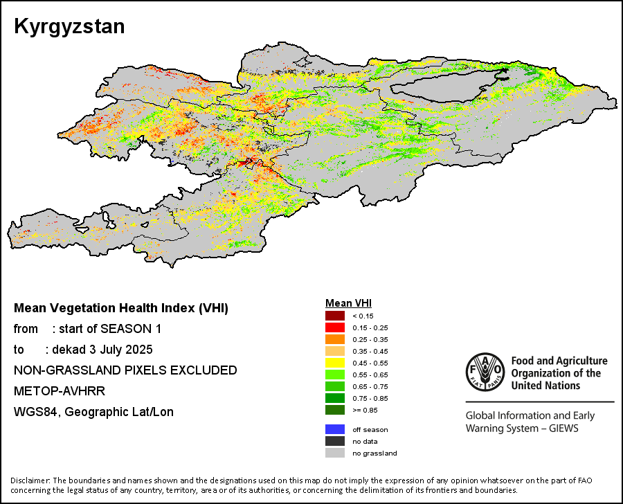 The country level maps and graphs depict the latest 36-month period of the seasonal, vegetation and precipitation indicators. The data is presented by dekad and month.   More