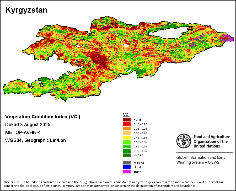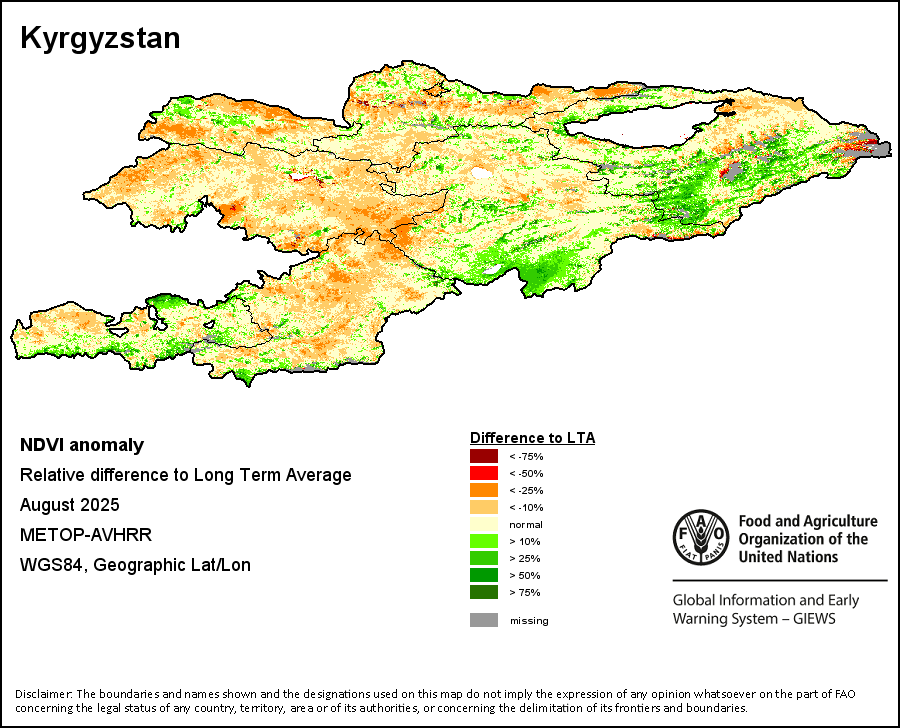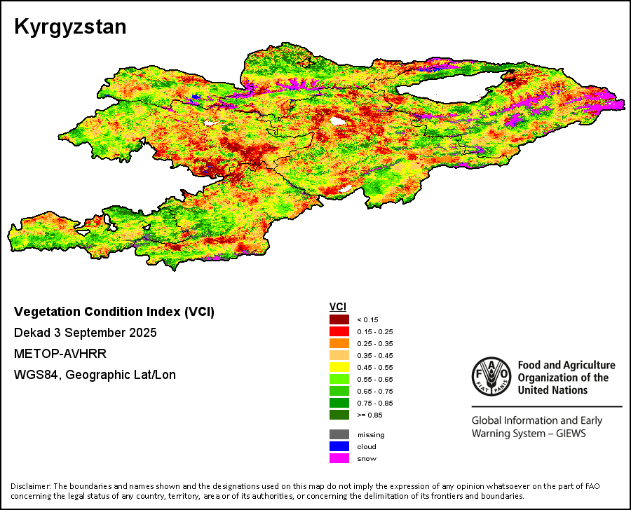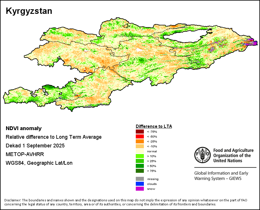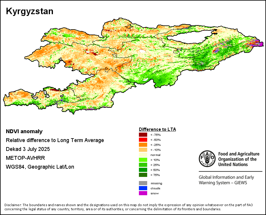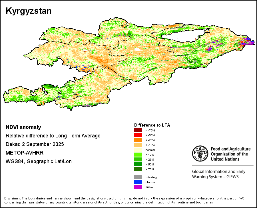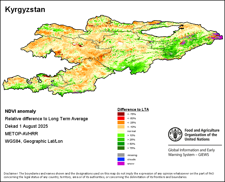 The Normalized Difference Vegetation Index (NDVI) measures the “greenness” of ground cover and is used as a proxy to indicate the density and health of vegetation. NDVI values range from +1 to -1, with high positive values corresponding to dense and healthy vegetation, and low and/or negative NDVI values indicating poor vegetation conditions or sparse vegetative cover. The NDVI anomaly indicates the variation of the current dekad to the long-term average, where a positive value (for example 20 percent) would signify enhanced vegetation conditions compared to the average, while a negative value (for instance -40 percent) would indicate comparatively poor vegetation conditions.
