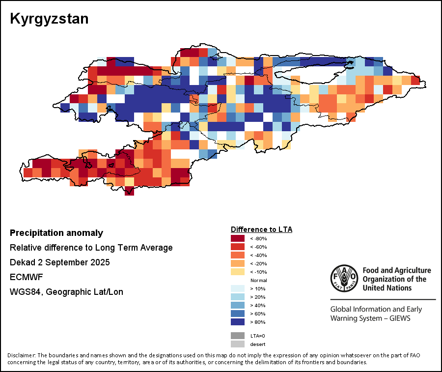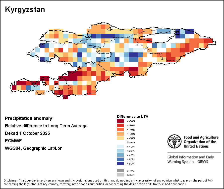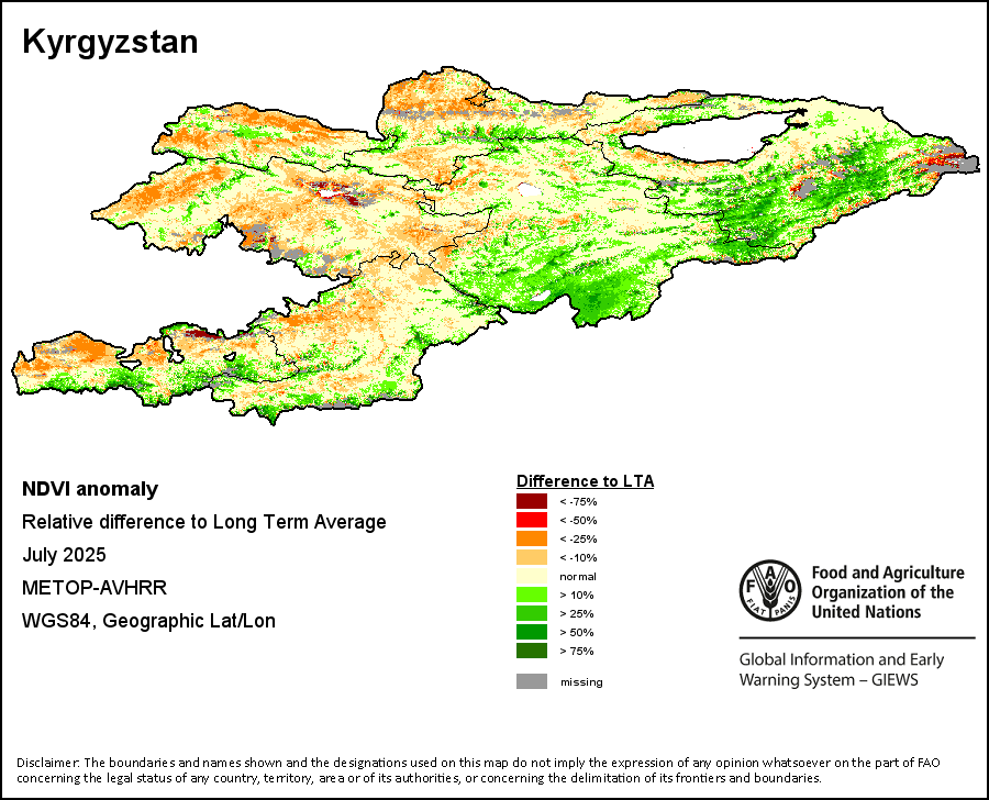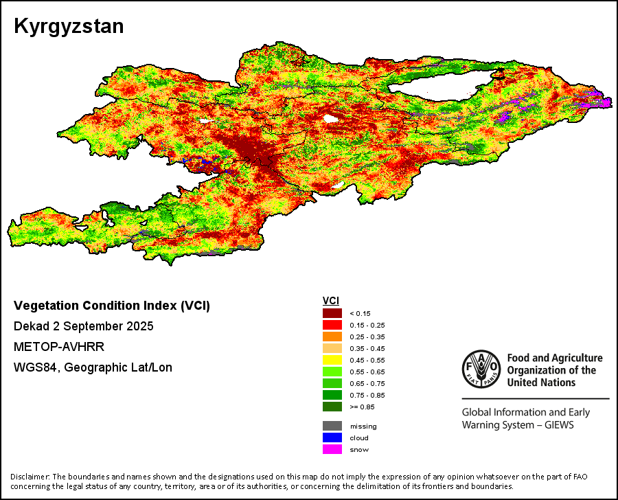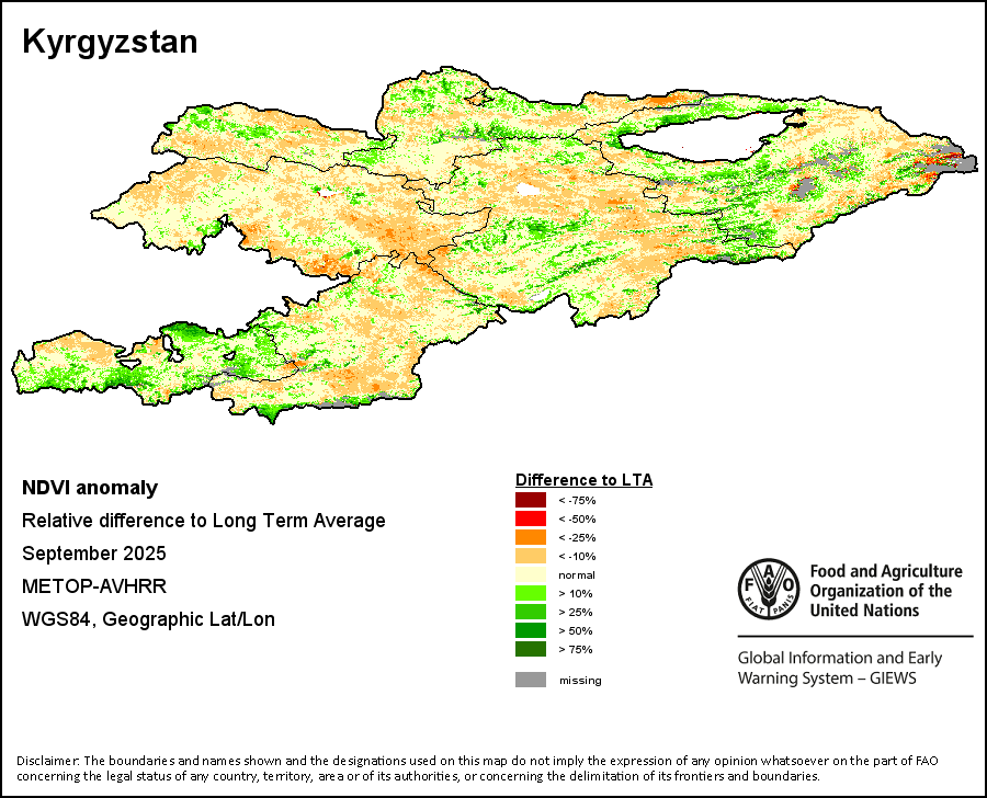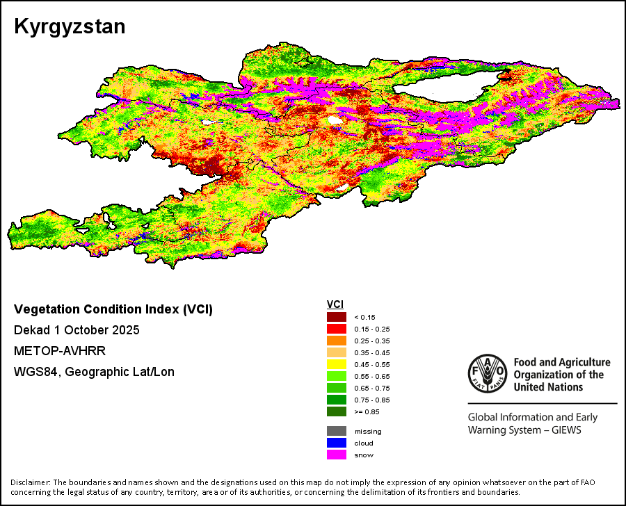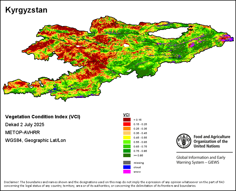The Normalized Difference Vegetation Index (NDVI) measures the “greenness” of ground cover and is used as a proxy to indicate the density and health of vegetation. NDVI values range from +1 to -1, with high positive values corresponding to dense and healthy vegetation, and low and/or negative NDVI values indicating poor vegetation conditions or sparse vegetative cover. The NDVI anomaly indicates the variation of the current dekad to the long-term average, where a positive value (for example 20 percent) would signify enhanced vegetation conditions compared to the average, while a negative value (for instance -40 percent) would indicate comparatively poor vegetation conditions.