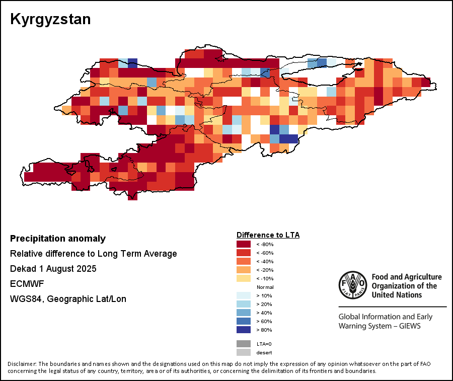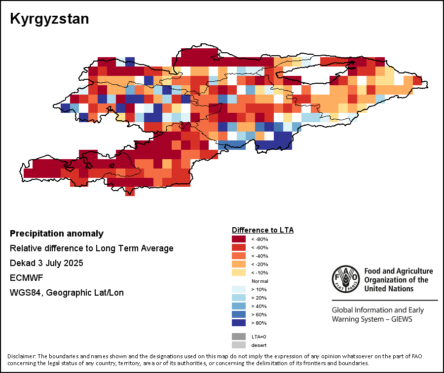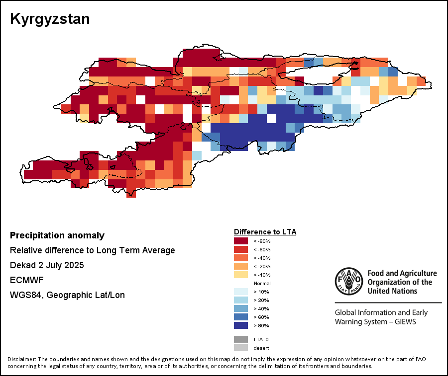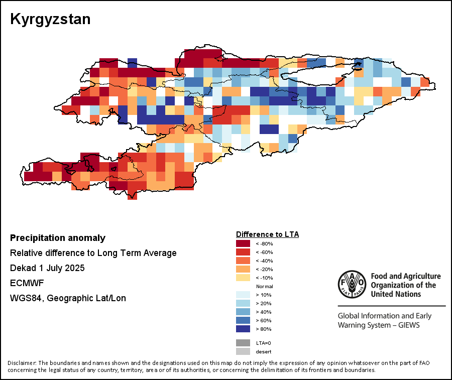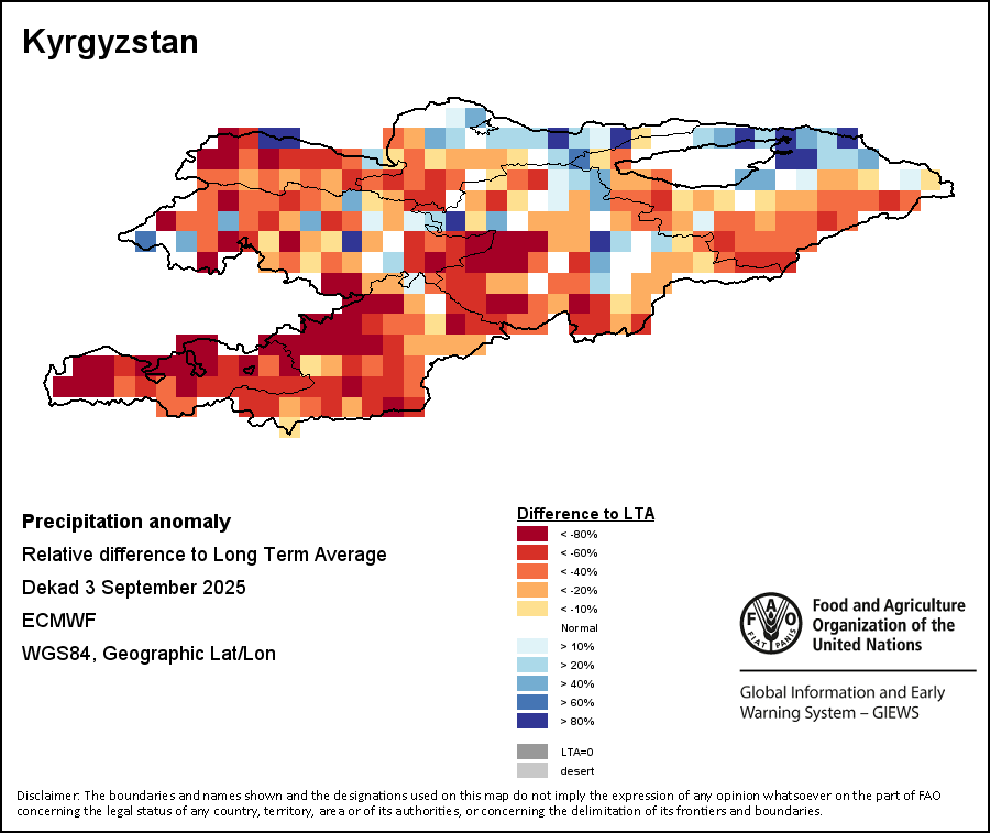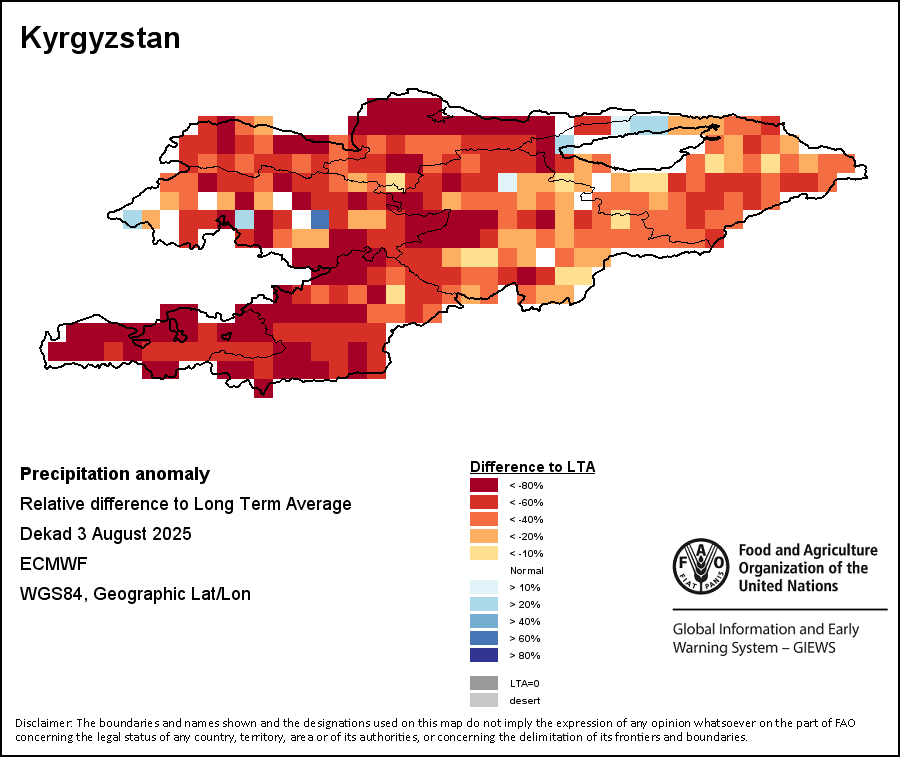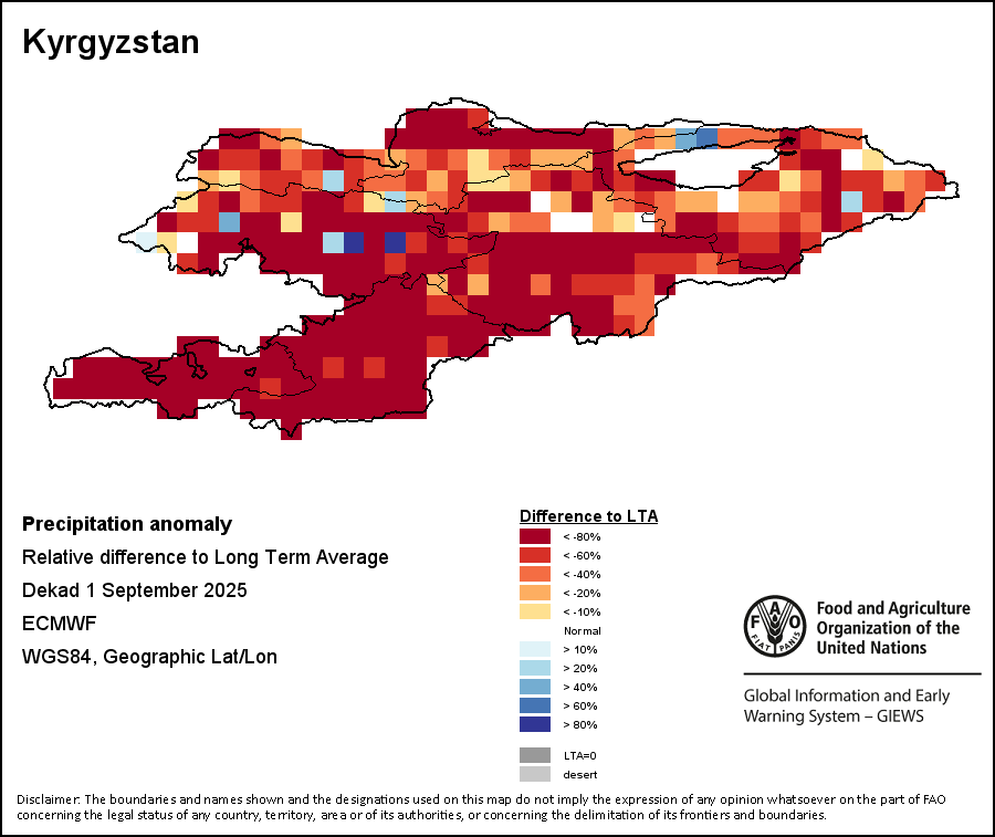 The Normalized Difference Vegetation Index (NDVI) measures the “greenness” of ground cover and is used as a proxy to indicate the density and health of vegetation. NDVI values range from +1 to -1, with high positive values corresponding to dense and healthy vegetation, and low and/or negative NDVI values indicating poor vegetation conditions or sparse vegetative cover. The NDVI anomaly indicates the variation of the current dekad to the long-term average, where a positive value (for example 20 percent) would signify enhanced vegetation conditions compared to the average, while a negative value (for instance -40 percent) would indicate comparatively poor vegetation conditions.