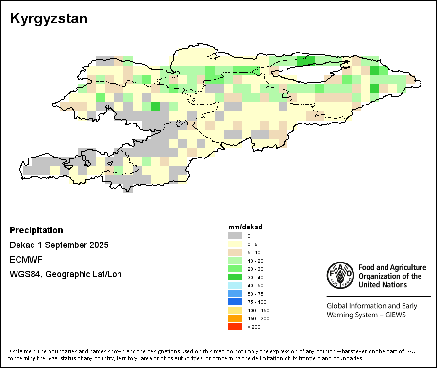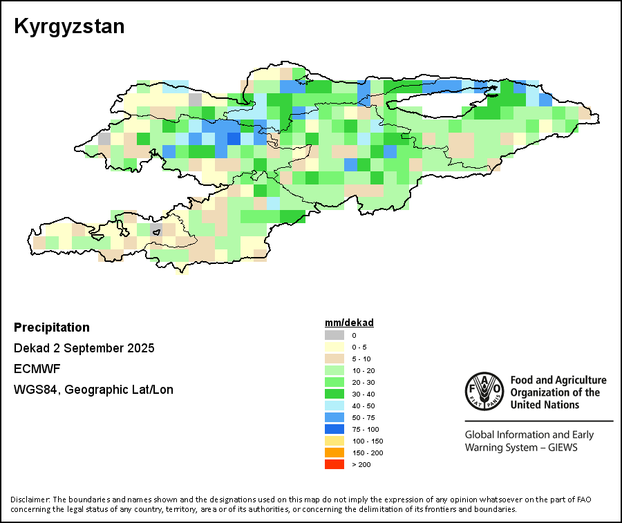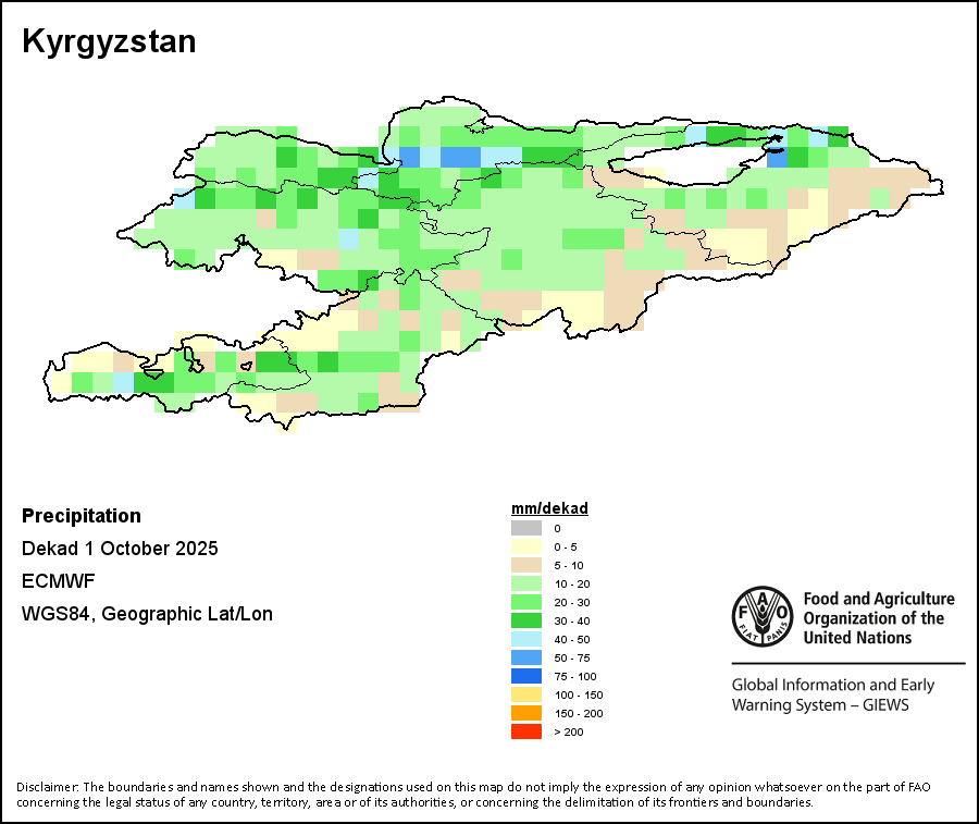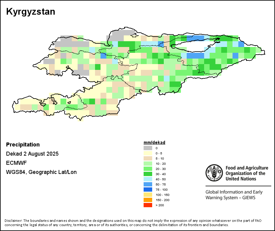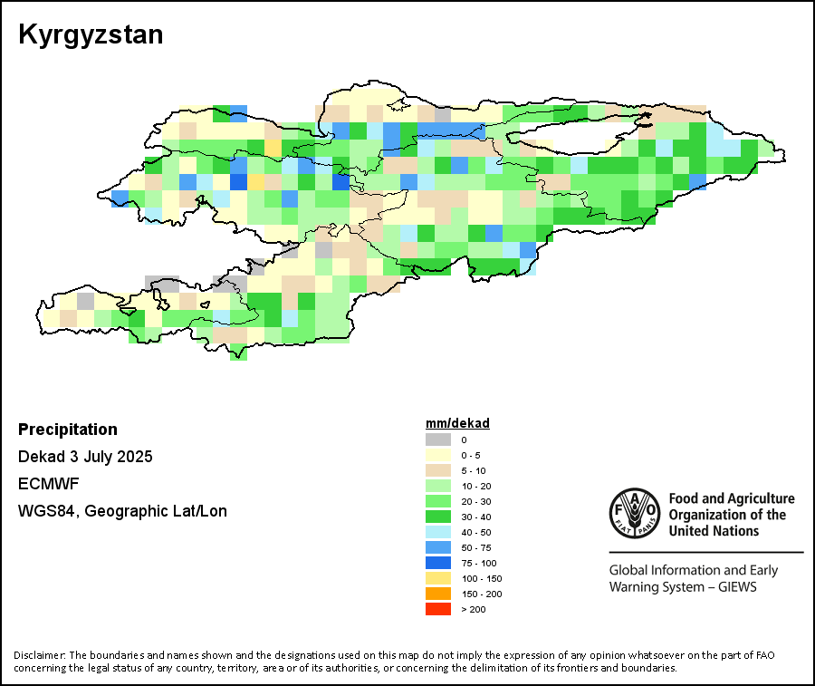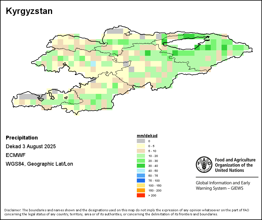 The map depicts cumulative rainfall volumes over a dekad (a 10-day period). Precipitation estimates for all African countries (except Cabo Verde and Mauritius) are taken from NOAA/FEWSNet, while for the remaining countries data is obtained from ECMWF.