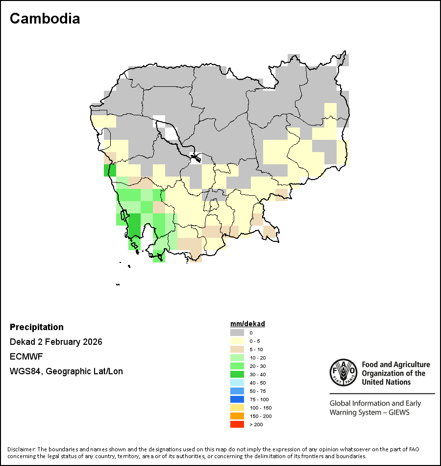 На карте изображены кумулятивные объемы осадков в декаду (10-дневный период). Оценки атмосферных осадков для всех африканских стран (за исключением Кабо-Верде и Маврикия) получены из системы NOAA/Системы раннего предупреждения об опасности голода, а по остальным странам данные получены из системы ECMWF.