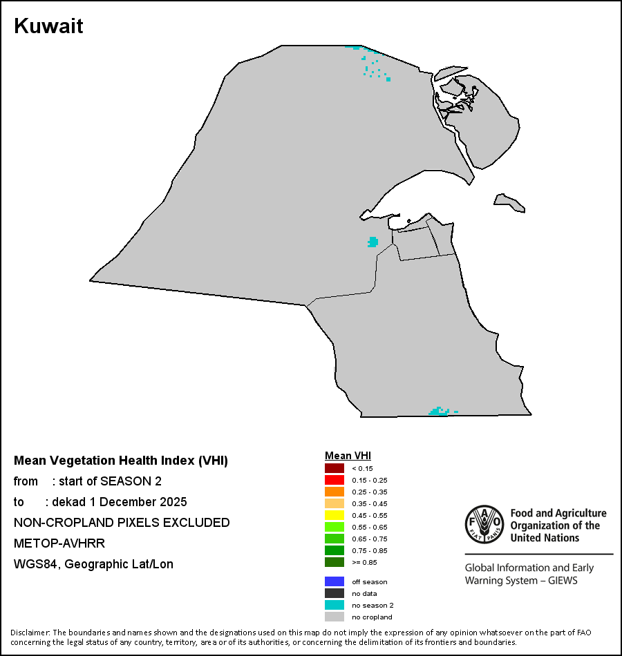 The Weighted Mean Vegetation Health Index (Weighted Mean VHI) allows the user to assess the severity of the drought from the start of the growing season, examining the vegetation health and the influence of temperature on plant conditions. The Mean VHI is an average of the dekadal VHI values over the crop growing season (from the start until the last dekad of analysis), weighted by crop coefficients (Kc), assigned to VHI values at the dekads corresponding to the Start of the Season (SOS), Maximum of the Season (MOS) and End of the Season (EOS). Crop coefficient is applied for the purpose of reflecting the crop’s water sensitivity at different phenology stages.