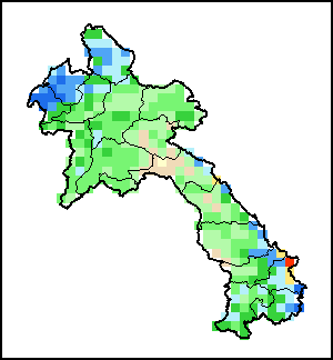 The Normalized Difference Vegetation Index (NDVI) measures the “greenness” of ground cover and is used as a proxy to indicate the density and health of vegetation. NDVI values range from +1 to -1, with high positive values corresponding to dense and healthy vegetation, and low and/or negative NDVI values indicating poor vegetation conditions or sparse vegetative cover. The NDVI anomaly indicates the variation of the current dekad to the long-term average, where a positive value (for example 20 percent) would signify enhanced vegetation conditions compared to the average, while a negative value (for instance -40 percent) would indicate comparatively poor vegetation conditions.