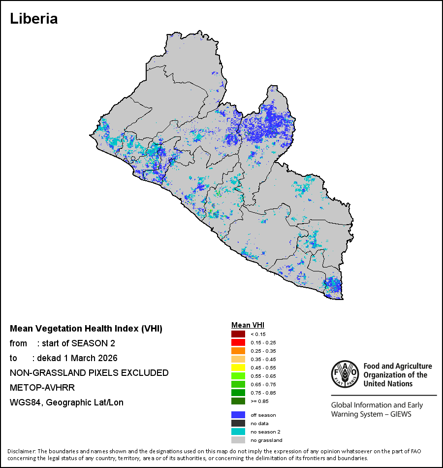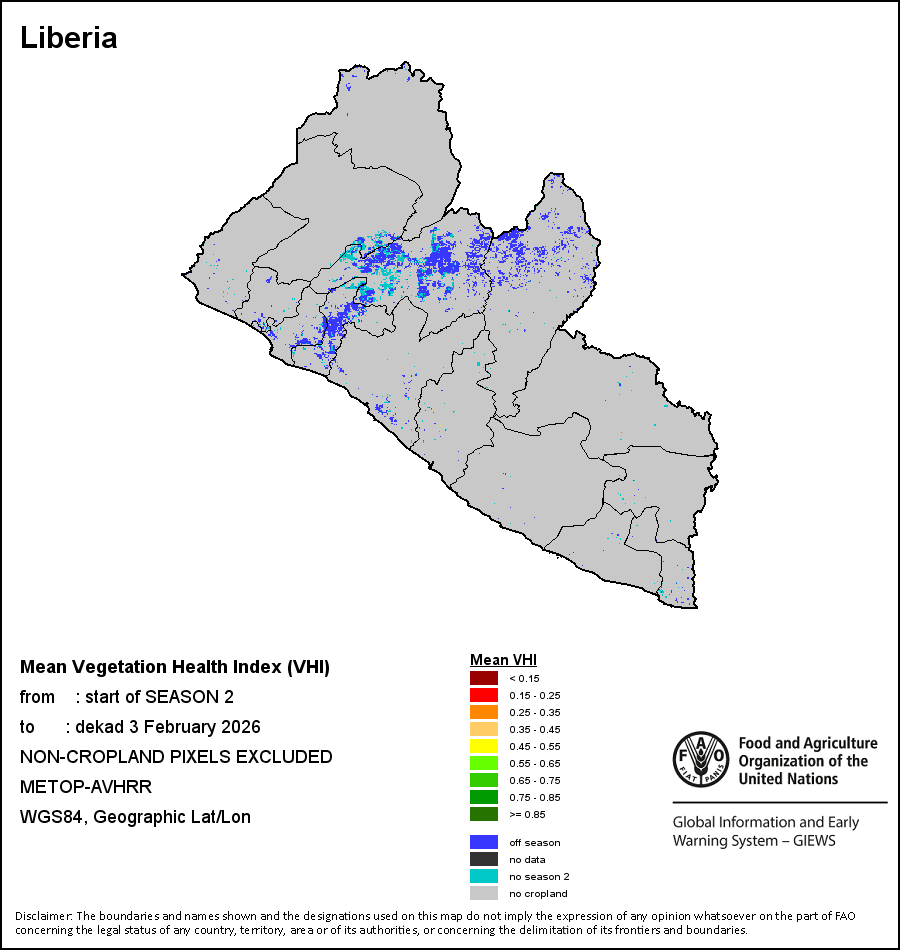 The country level maps and graphs depict the latest 36-month period of the seasonal, vegetation and precipitation indicators. The data is presented by dekad and month. All three vegetation indicators are based on 10-day (dekadal) vegetation data from the METOP-AVHRR sensor at 1 km resolution (2007 and after). Data at 1 km resolution for the period 1984-2006 are derived from the NOAA-AVHRR dataset at 16 km resolution. Precipitation estimates for all African countries (except Cabo Verde and Mauritius) are taken from NOAA/FEWSNet (16 km resolution), while for the remaining countries data is obtained from ECMWF (25 km resolution). Owing to the higher resolution of vegetation indicators (e.g., NDVI, VHI) compared to coarser precipitation indicators, the number of sub-national units for which valid zonal statistics can be generated for vegetation indices is greater than the number of units for precipitation indicators for certain countries.