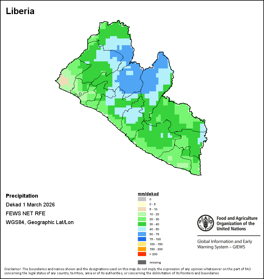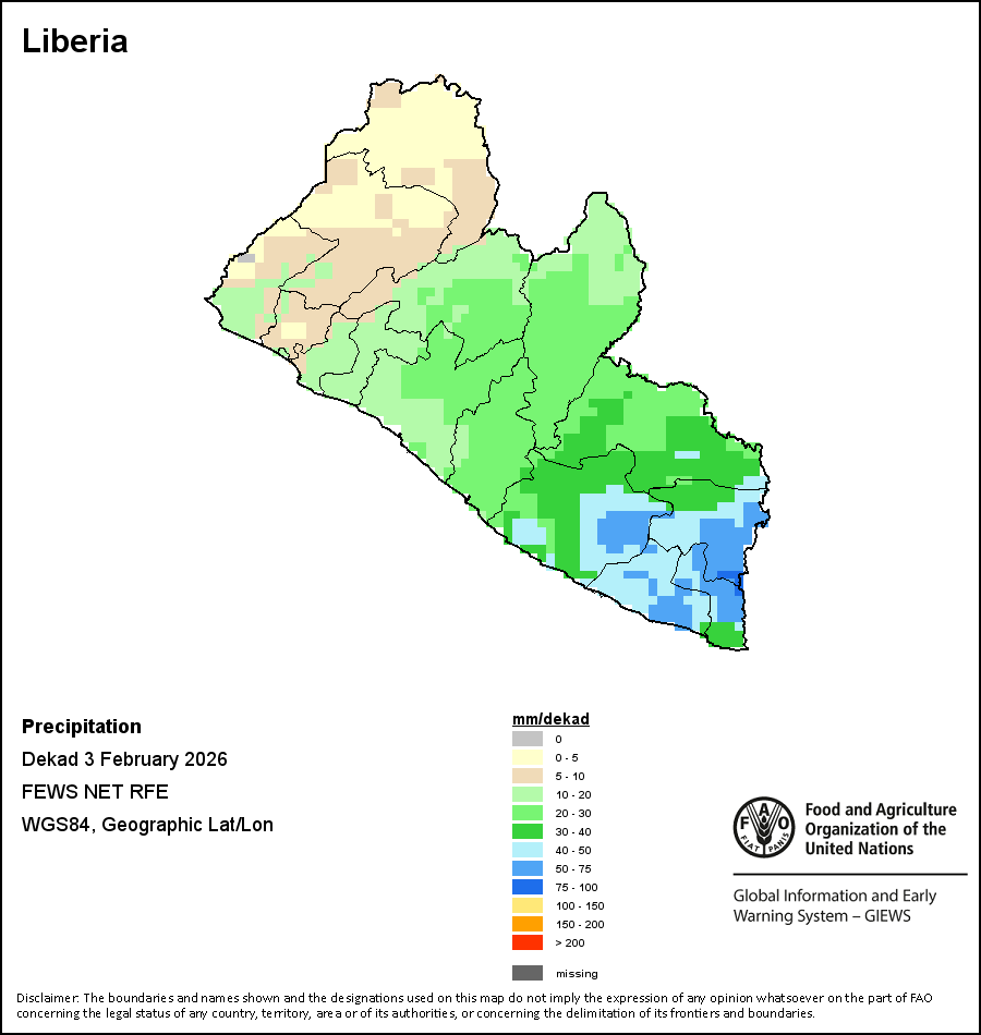 The map depicts cumulative rainfall volumes over a dekad (a 10-day period). Precipitation estimates for all African countries (except Cabo Verde and Mauritius) are taken from NOAA/FEWSNet, while for the remaining countries data is obtained from ECMWF.