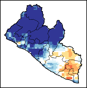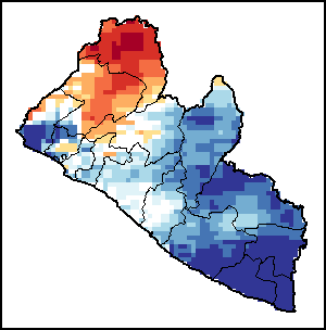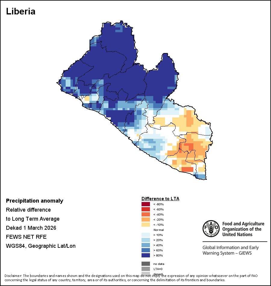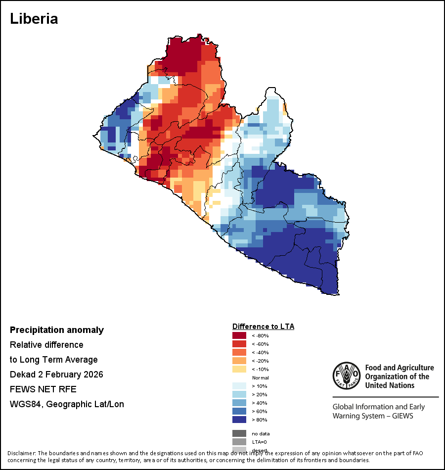 The map illustrates the difference between the current rainfall volume and the average level. Rainfall levels are compared with the Long-Term Average (LTA), which refers to the period 1989-2015. Warmer colours identify areas which have received lower-than-average rainfall, while colder colours are given to areas where precipitation has been above average.