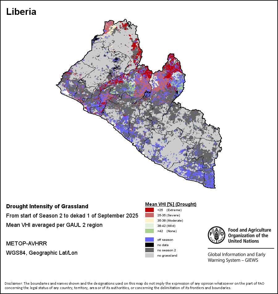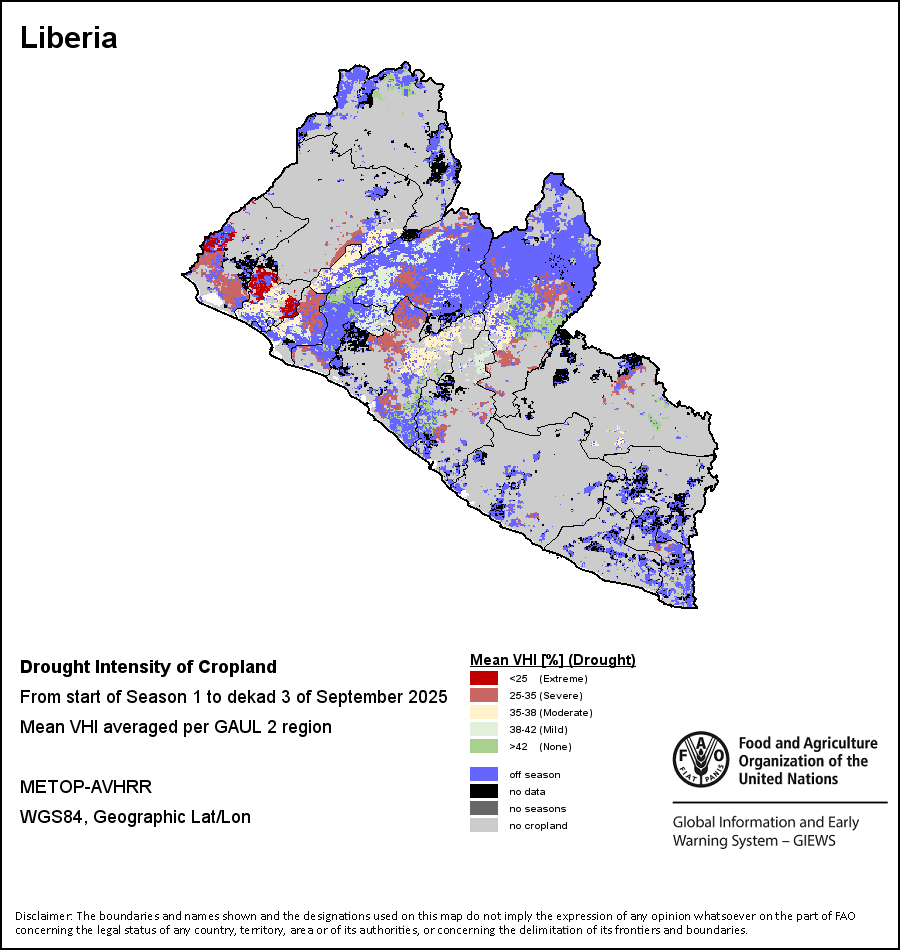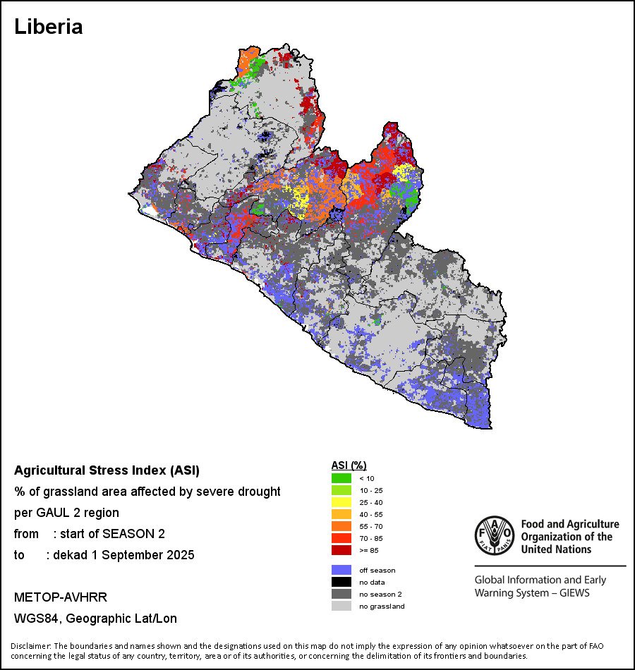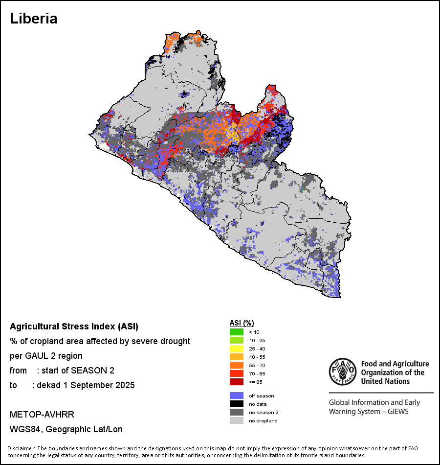 农业干旱依据其强度划分为四类:极端、严重、重度或轻度。干旱的强度通过各全球行政单位分层制度二级区域(GAUL 2)地区累积加权平均植被健康指数计算得出,意味着植被健康状况越差旱情就越严重。