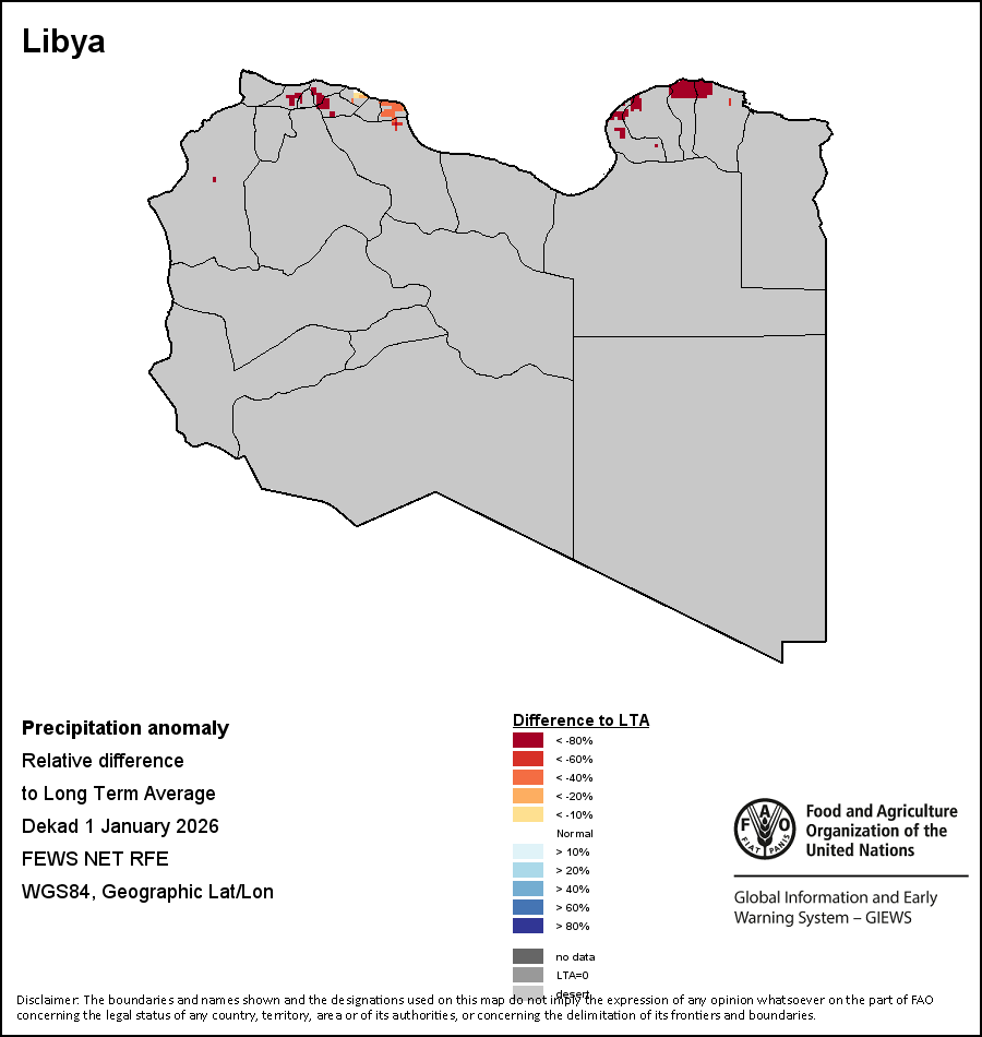 El Índice Normalizado Diferencial de la Vegetación (NDVI, por sus siglas en inglés) mide el “verdor” de la cubierta vegetal, y se utiliza como indicador de la densidad y salud de la vegetación. Los valores del NDVI oscilan entre +1 y -1. Los valores positivos elevados corresponden a vegetación densa y saludable, mientras que los valores bajos y/o negativos reflejan condiciones deficientes de vegetación o cubierta vegetal escasa. La anomalía del NDVI representa la variación del periodo actual de 10 días con respecto al valor medio a largo plazo. Un valor positivo (por ejemplo, 20 por ciento) implicaría mejores condiciones de vegetación con respecto a la media, mientras que un valor negativo (por ejemplo, -40 por ciento) indicaría condiciones de vegetación comparativamente peores.