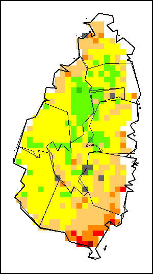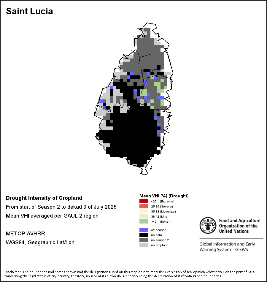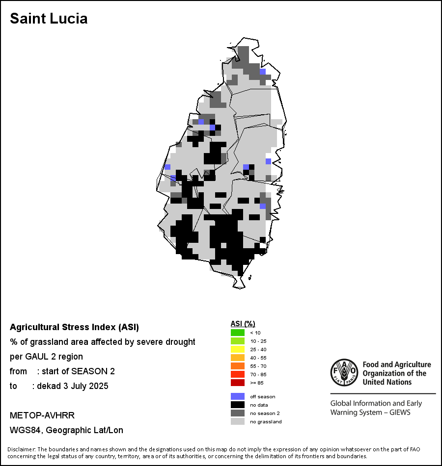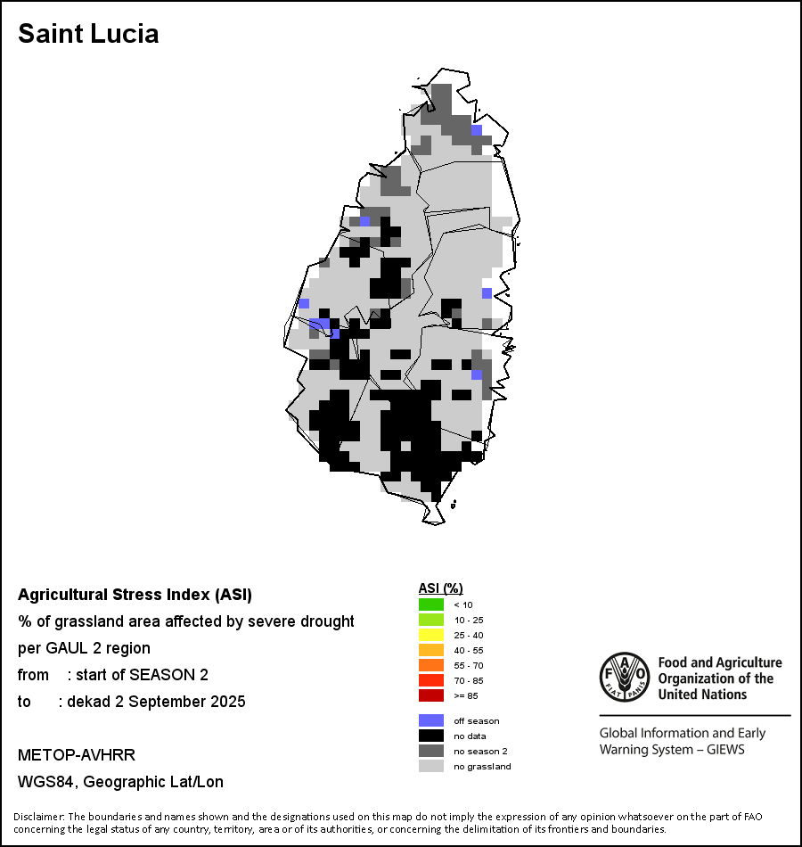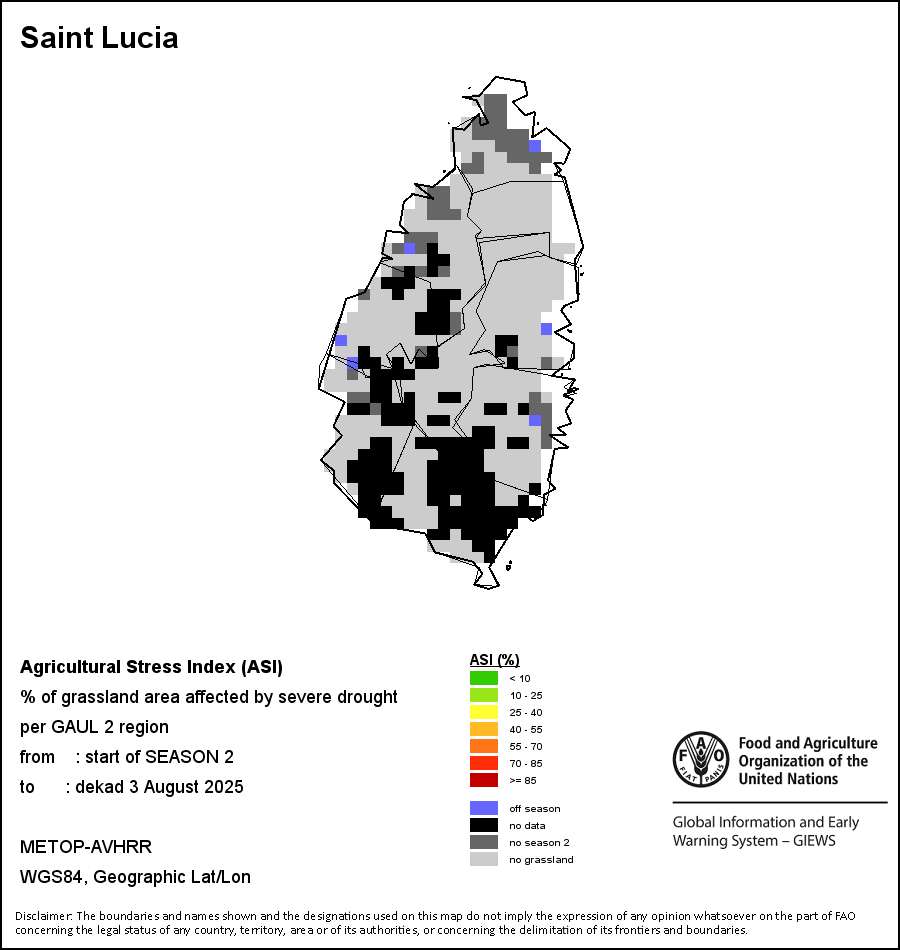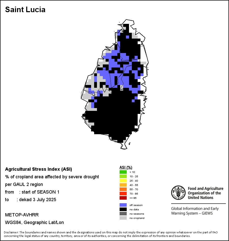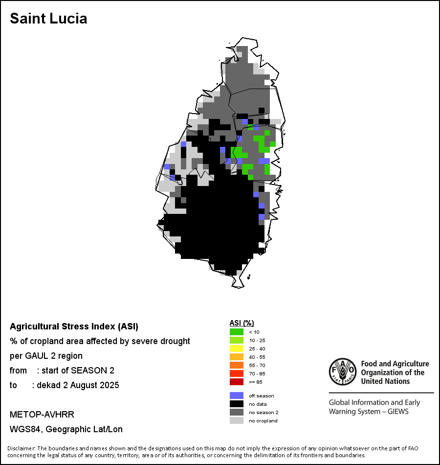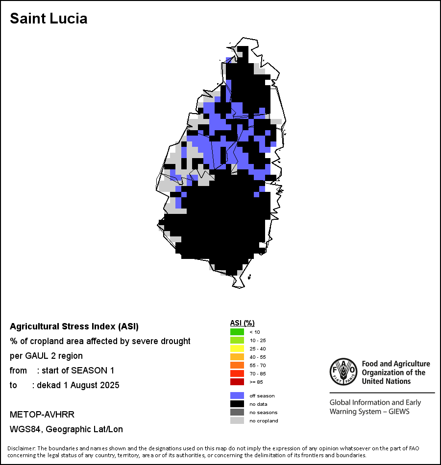 The Agricultural Stress Index (ASI) is a quick-look indicator that facilitates the early identification of cropped land with a high likelihood of water stress (drought). The Index is based on the integration of the Vegetation Health Index (VHI) in two dimensions that are critical in the assessment of a drought event in agriculture: temporal and spatial. The first step of the ASI calculation is a temporal averaging of the VHI, assessing the intensity and duration of dry periods occurring during the crop cycle at the pixel level; this calculation includes the use of crop coefficients, which introduces sensitivity of a crop to water stress during each phenological phase. The second step determines the spatial extent of drought events by calculating the percentage of pixels in arable areas with a VHI value below 35 percent (this value was identified as a critical threshold in assessing the extent of drought in previous research by Kogan, 1995). Each administrative area is classified according to the percentage of the affected area to facilitate the quick interpretation of results.