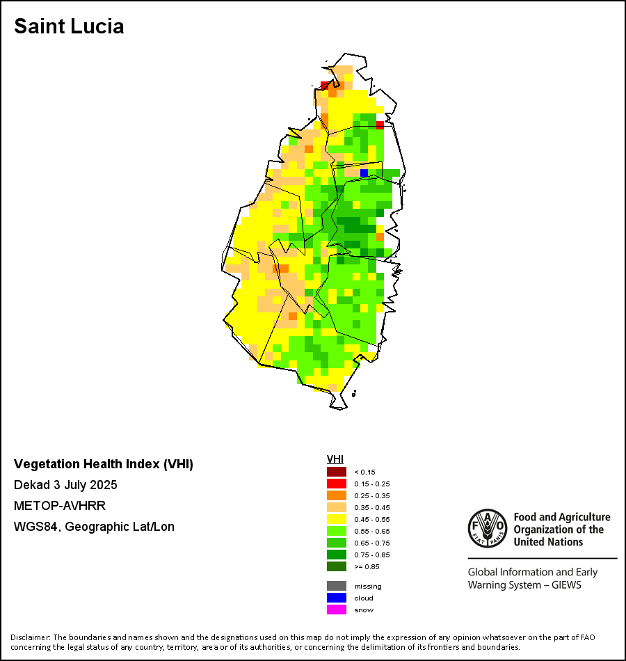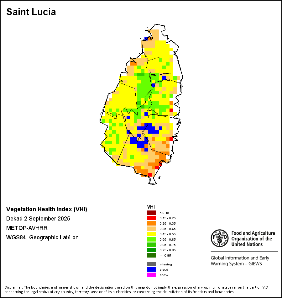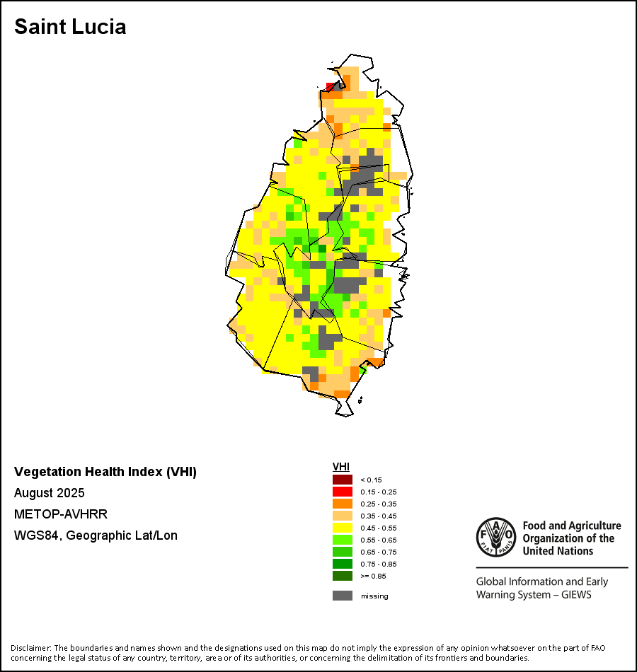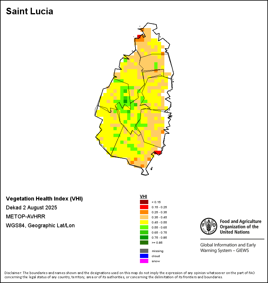The Vegetation Health Index (VHI) illustrates the severity of drought based on the vegetation health and the influence of temperature on plant conditions. The VHI is a composite index and the elementary indicator used to compute the ASI. It combines both the Vegetation Condition Index (VCI) and the Temperature Condition Index (TCI). The TCI is calculated using a similar equation to the VCI, but relates the current temperature to the long-term maximum and minimum , as it is assumed that higher temperatures tend to cause a deterioration in vegetation conditions. A decrease in the VHI would, for example, indicate relatively poor vegetation conditions and warmer temperatures, signifying stressed vegetation conditions, and over a longer period would be indicative of drought. The VHI images are computed for the two main seasons and in three modalities: dekadal, monthly and annual.