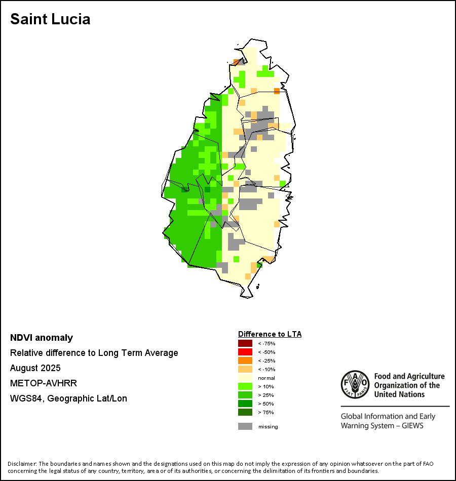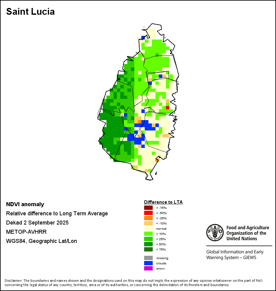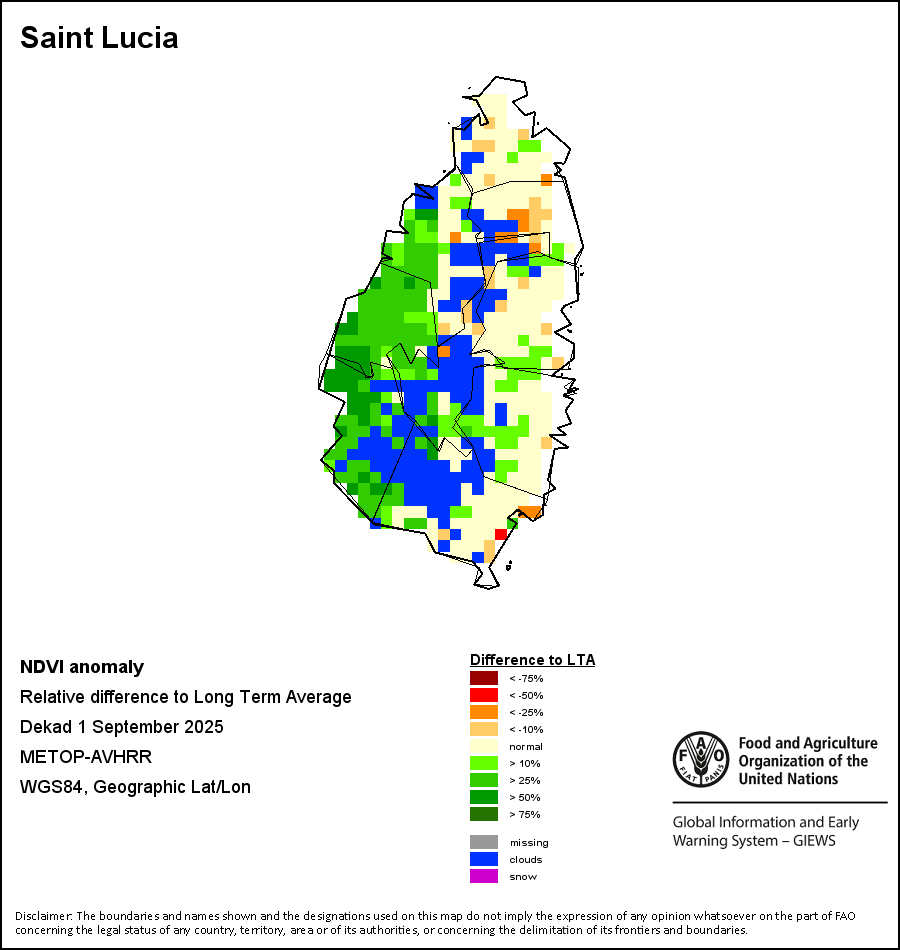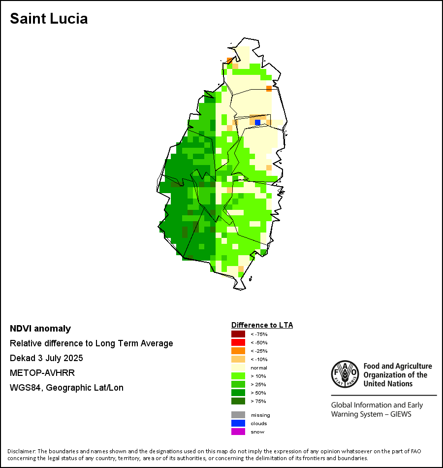 The Normalized Difference Vegetation Index (NDVI) measures the “greenness” of ground cover and is used as a proxy to indicate the density and health of vegetation. NDVI values range from +1 to -1, with high positive values corresponding to dense and healthy vegetation, and low and/or negative NDVI values indicating poor vegetation conditions or sparse vegetative cover. The NDVI anomaly indicates the variation of the current dekad to the long-term average, where a positive value (for example 20 percent) would signify enhanced vegetation conditions compared to the average, while a negative value (for instance -40 percent) would indicate comparatively poor vegetation conditions.